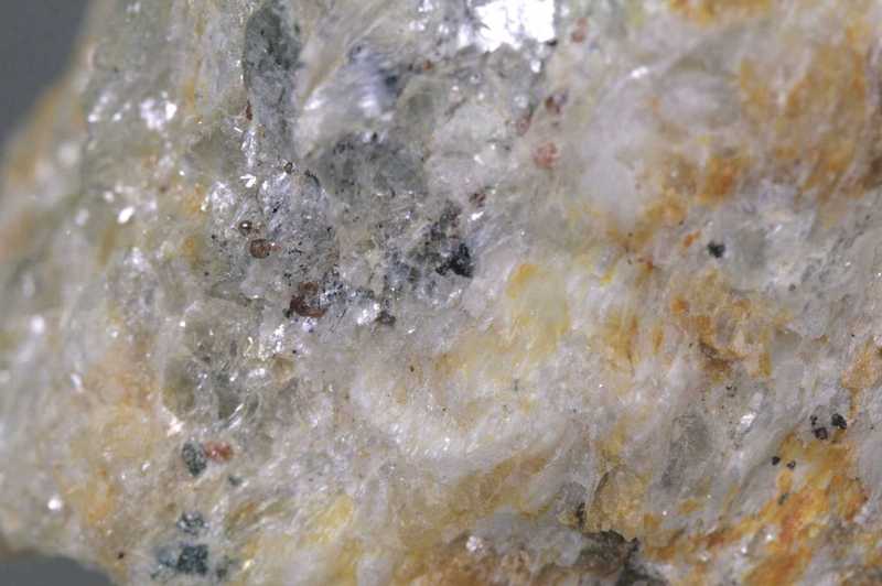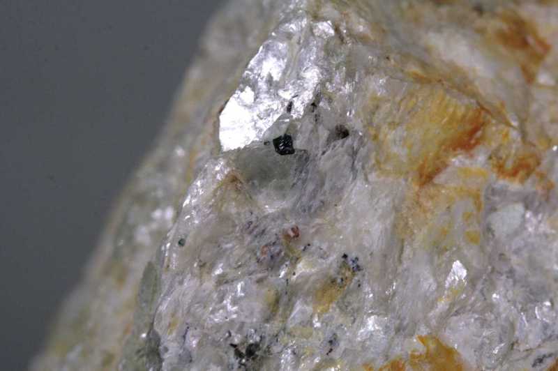 Zinc-rich spinel gahnite from the pegmatite locality in the Jeseníky Mountains. Small green to black grains of gahnite grown into a sillimanite pegmatite.