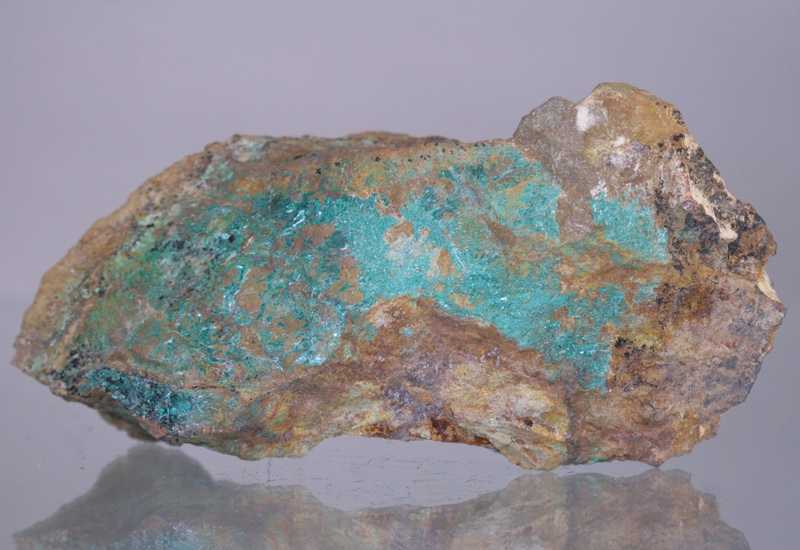 A very nice specimen of copper arsenate-carbonate tyrolite from Novoveská Huta. A very rich specimen of blue-green to emerald-green fine flaky to tabular tyrolite crystals; very nice and large format of the specimen, which is not entirely evident from the photo!