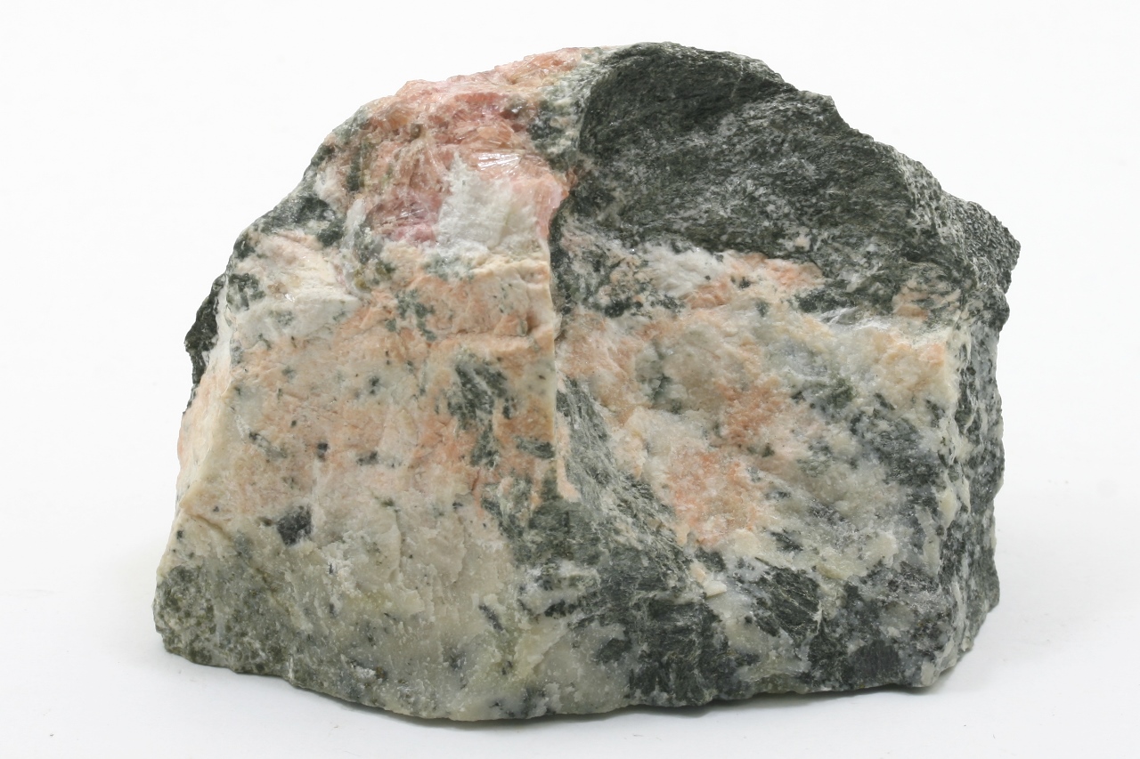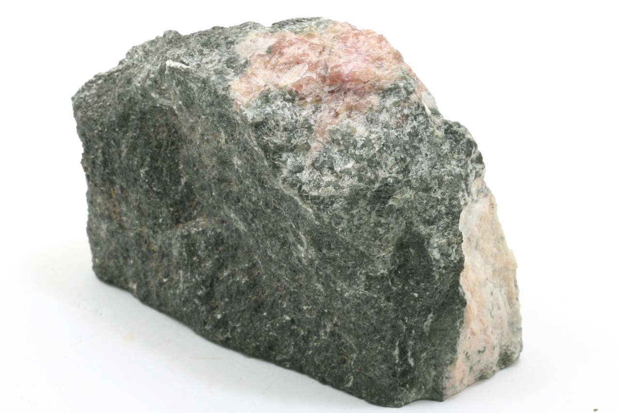 Pink variety of zoisite in amphibolite. The specimen is cut off from the bottom .
