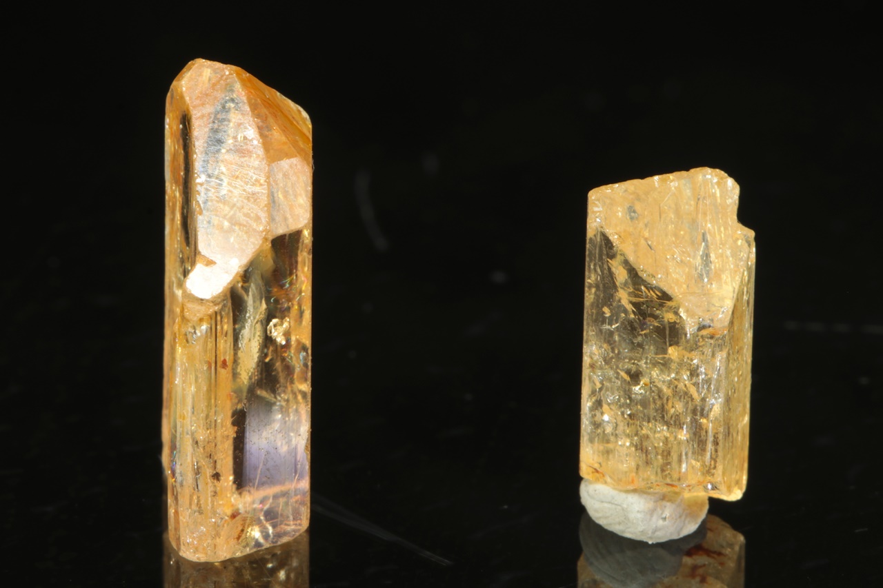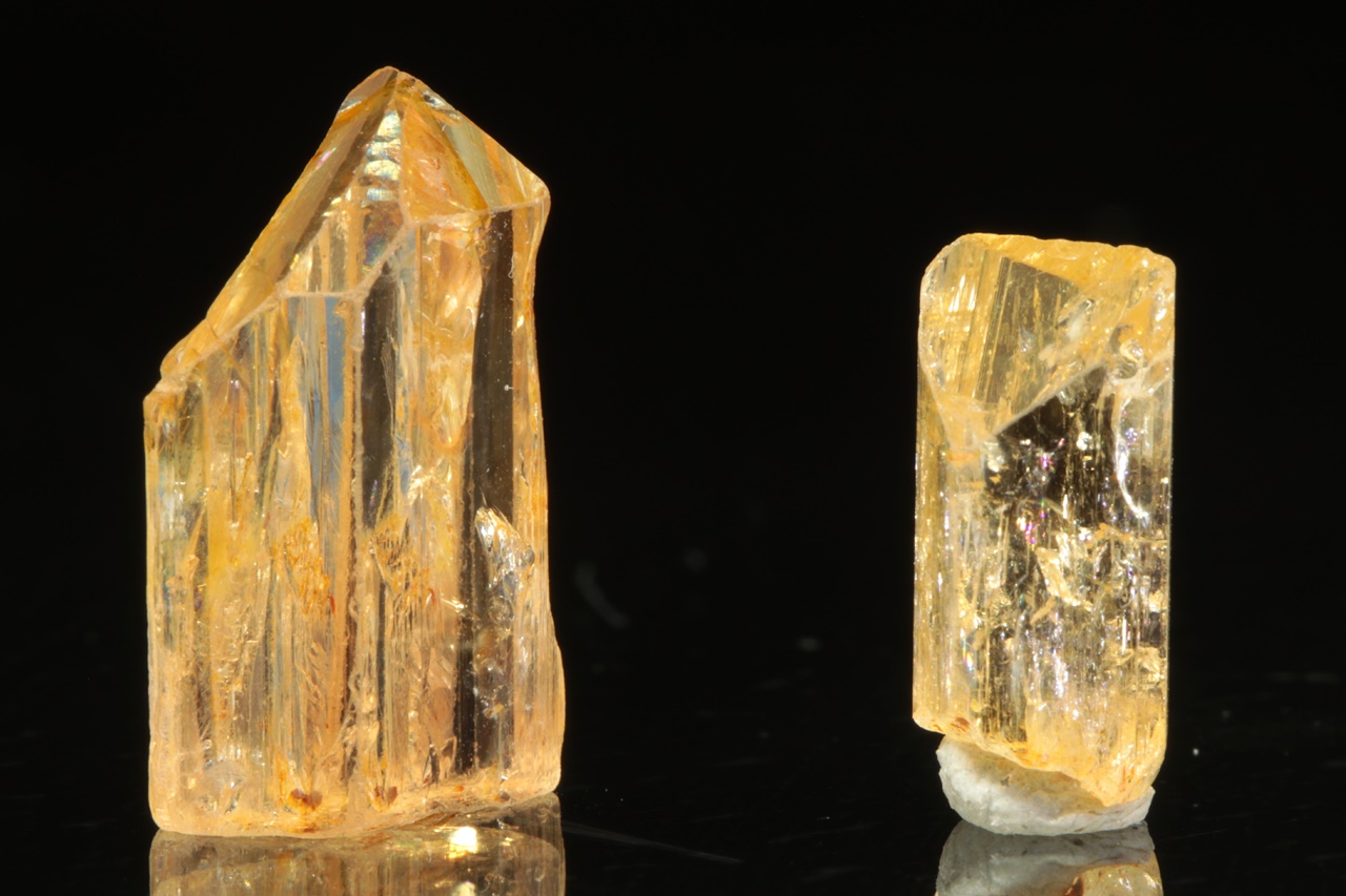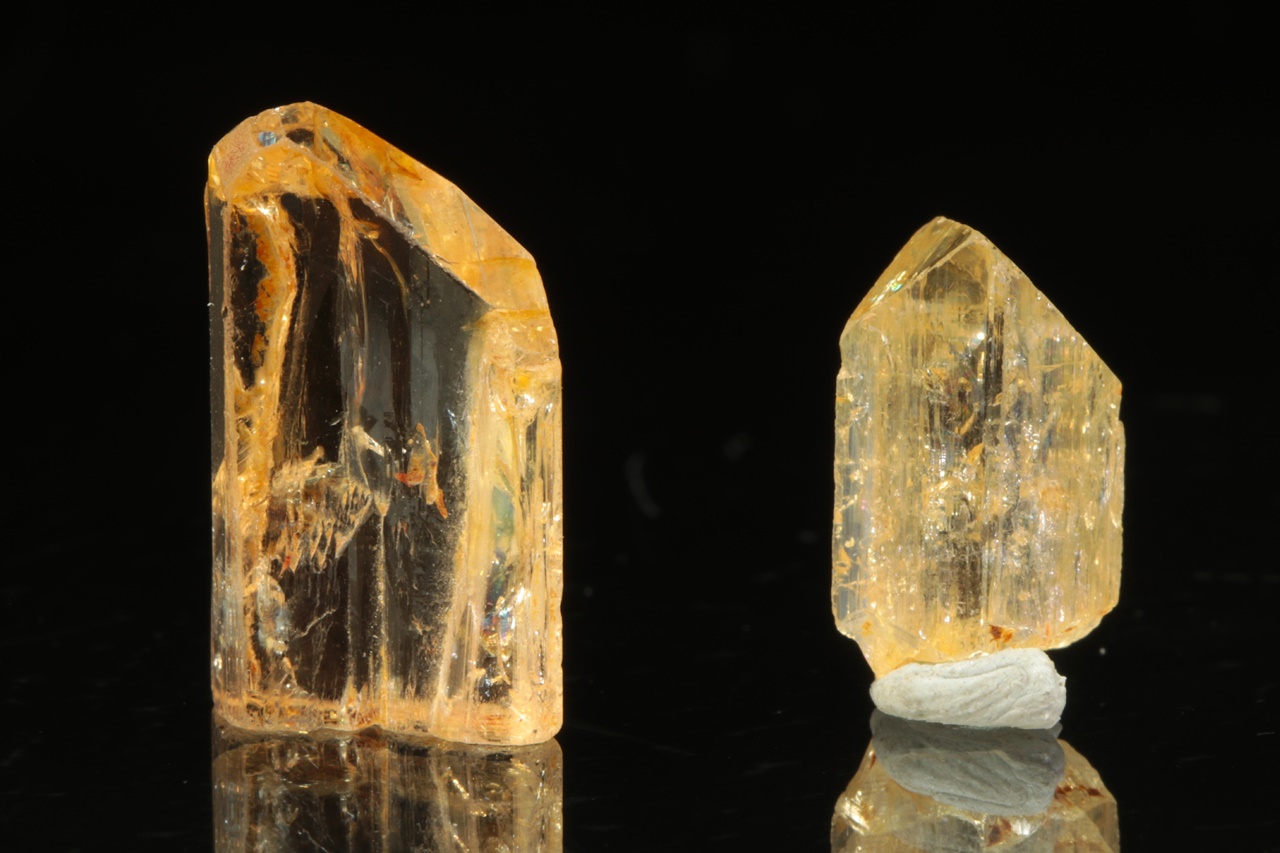Dva nádherné krystaly intenzivně žlutého topazu. Oba krystaly jsou na jedné straně ukončené krystalovými plochami. Velikost krystalu je 18 a 14 mm, hmotnost je 2,7 a 1,4 g.