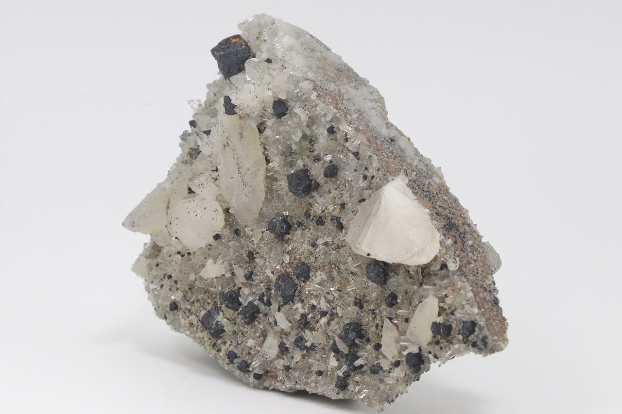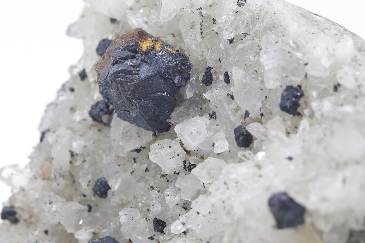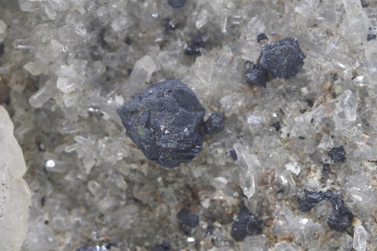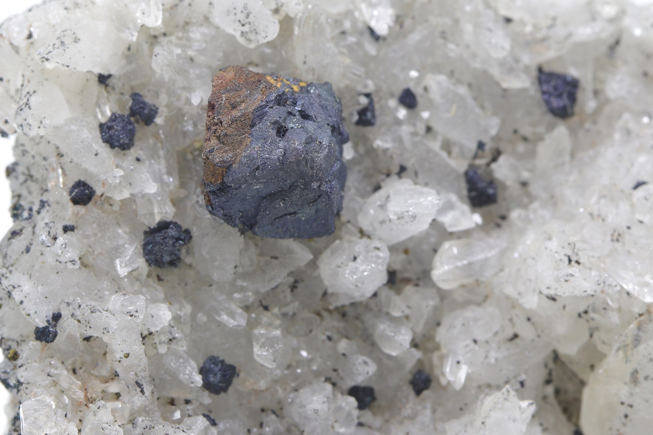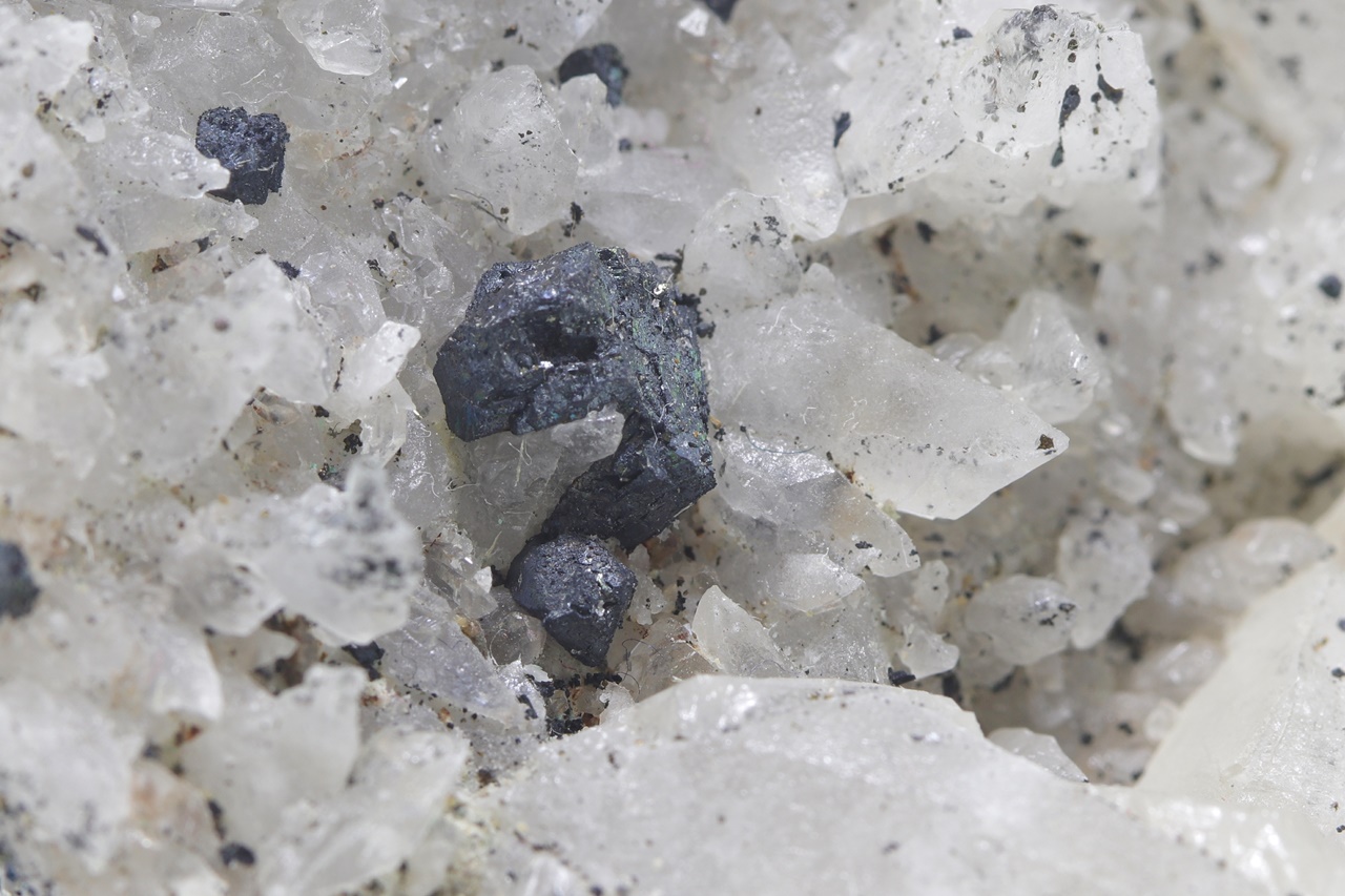 A rich sample of octahedral bornite crystals grown on crystals of clear quartz with white scalenohedral calcite from the reported copper location. The largest bornite crystal is 8 mm in size.
