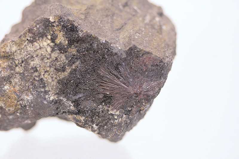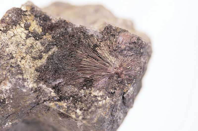 Pěkné “slunce” kermezitu ze slovenské lokality Pezinok. Vzorek jehlicovitých radiálně paprsčitých krystalů kermezitu