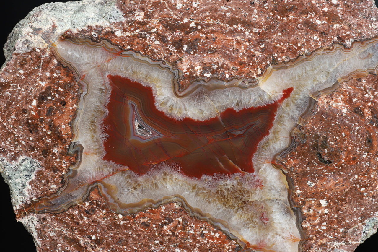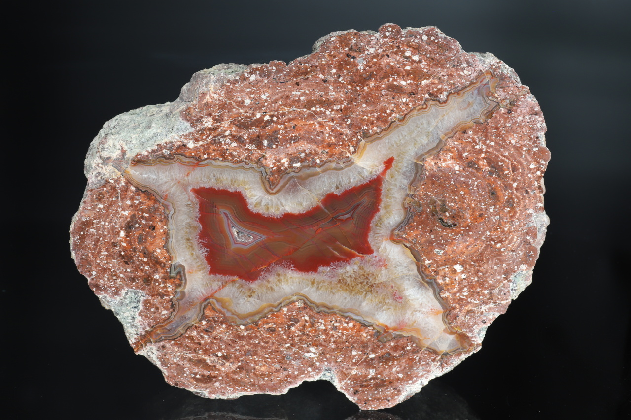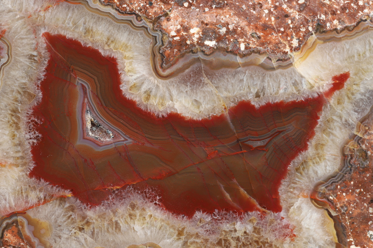 A large polished very nice specimen of rich red agate with a quartz rim from the locality of St. Egidien in Germany.