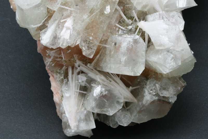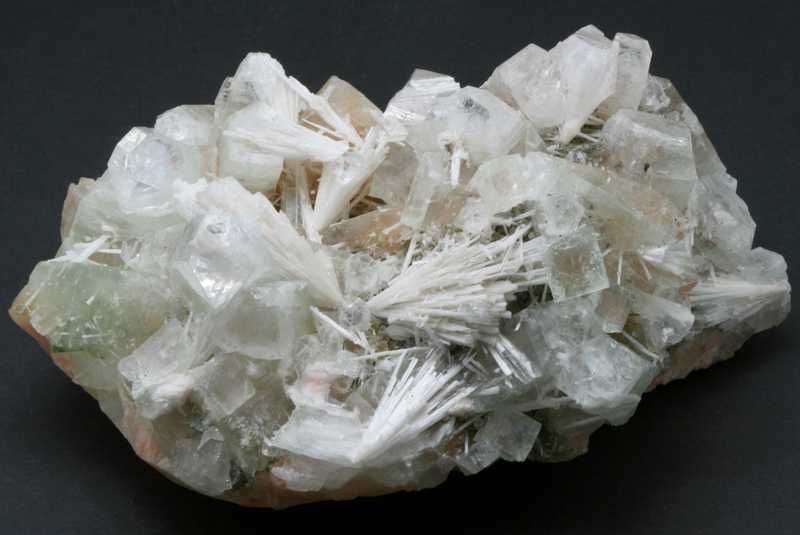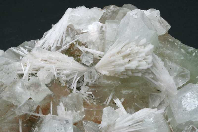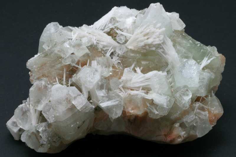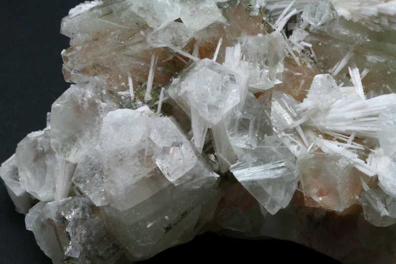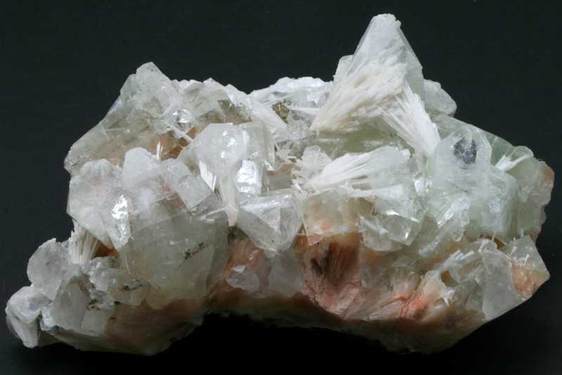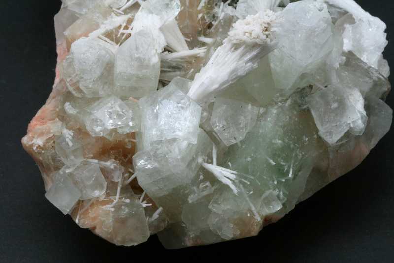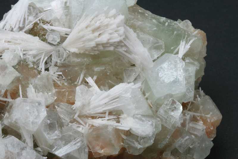 Large druse of greenish apophyllite crystals up to 40 mm in size, into which needle-shaped scolecite crystals up to 40 mm in size grow, on stilbite crystals