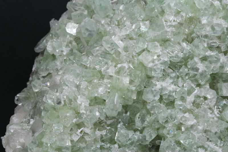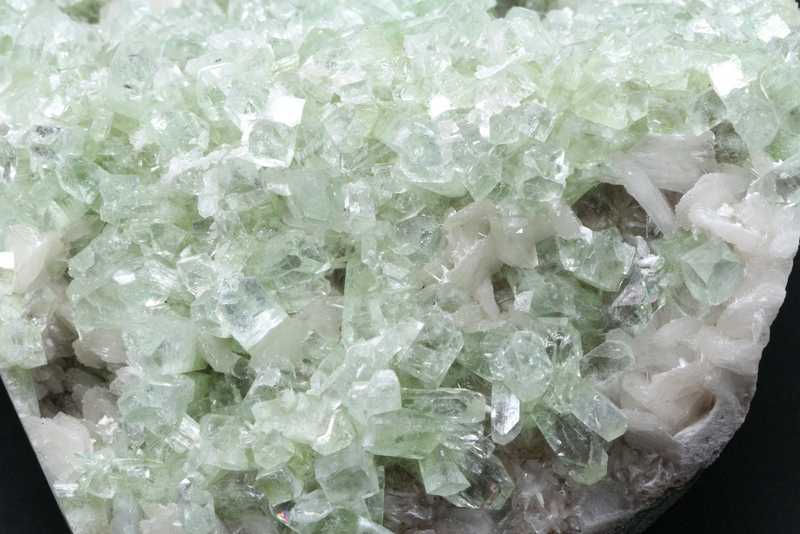 A very aesthetic larger sample of apophyllite with stilbite from India. A large druse of green apophyllite crystals up to 15 mm in size on smaller stilbite crystals.
