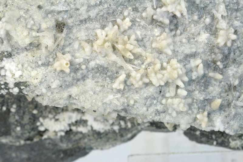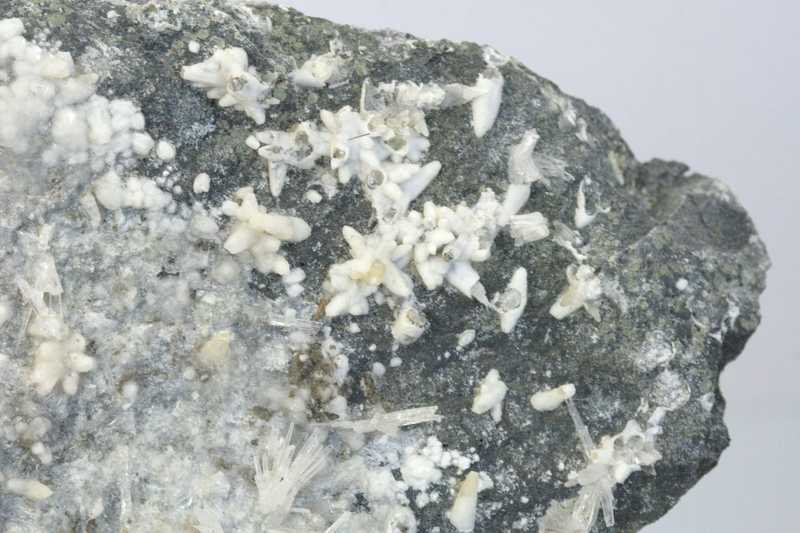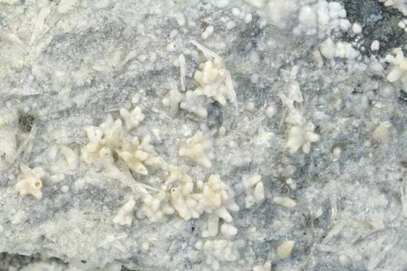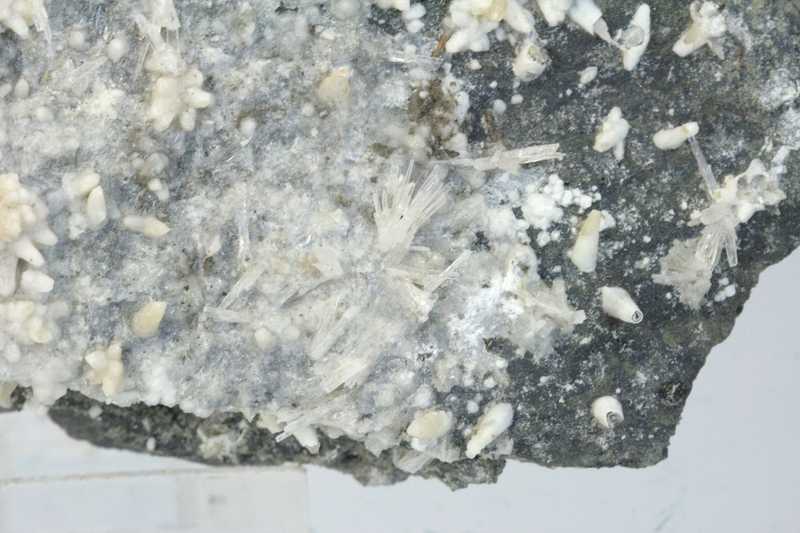 A beautiful specimen of calcite with aragonite from the Bulhary quarry near Lučenec. A very nice specimen of basaltic rock, which is covered with a crust composed of calcite developed in the form of stalactites, on which colorless needle-like crystals of aragonite grow.