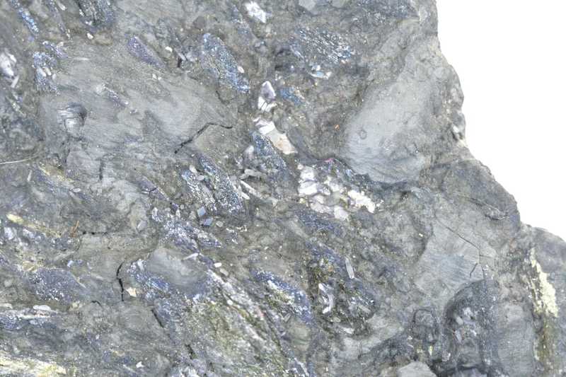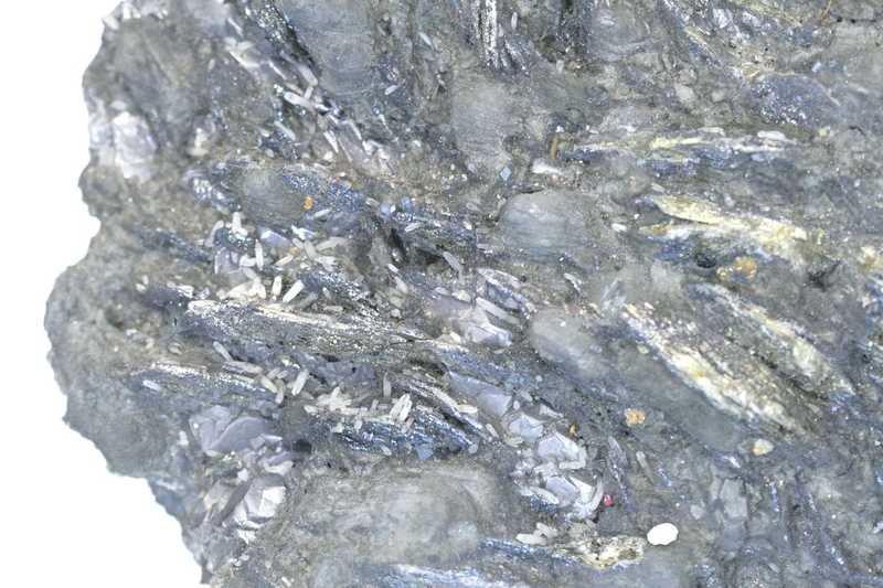 A very high quality specimen of minerals typical of the Trepča ore deposit. A very high quality specimen of a large druse of galena crystals, which is largely overgrown with typical disc-shaped pyrrhotite crystals, on which small quartz crystals are attached; the entire specimen is abundantly overgrown with gray felt-like aggregates of boulangerite