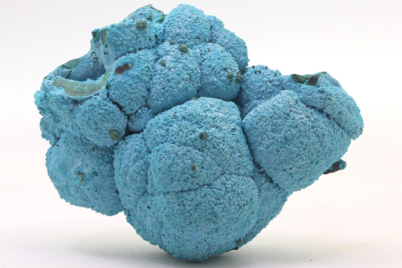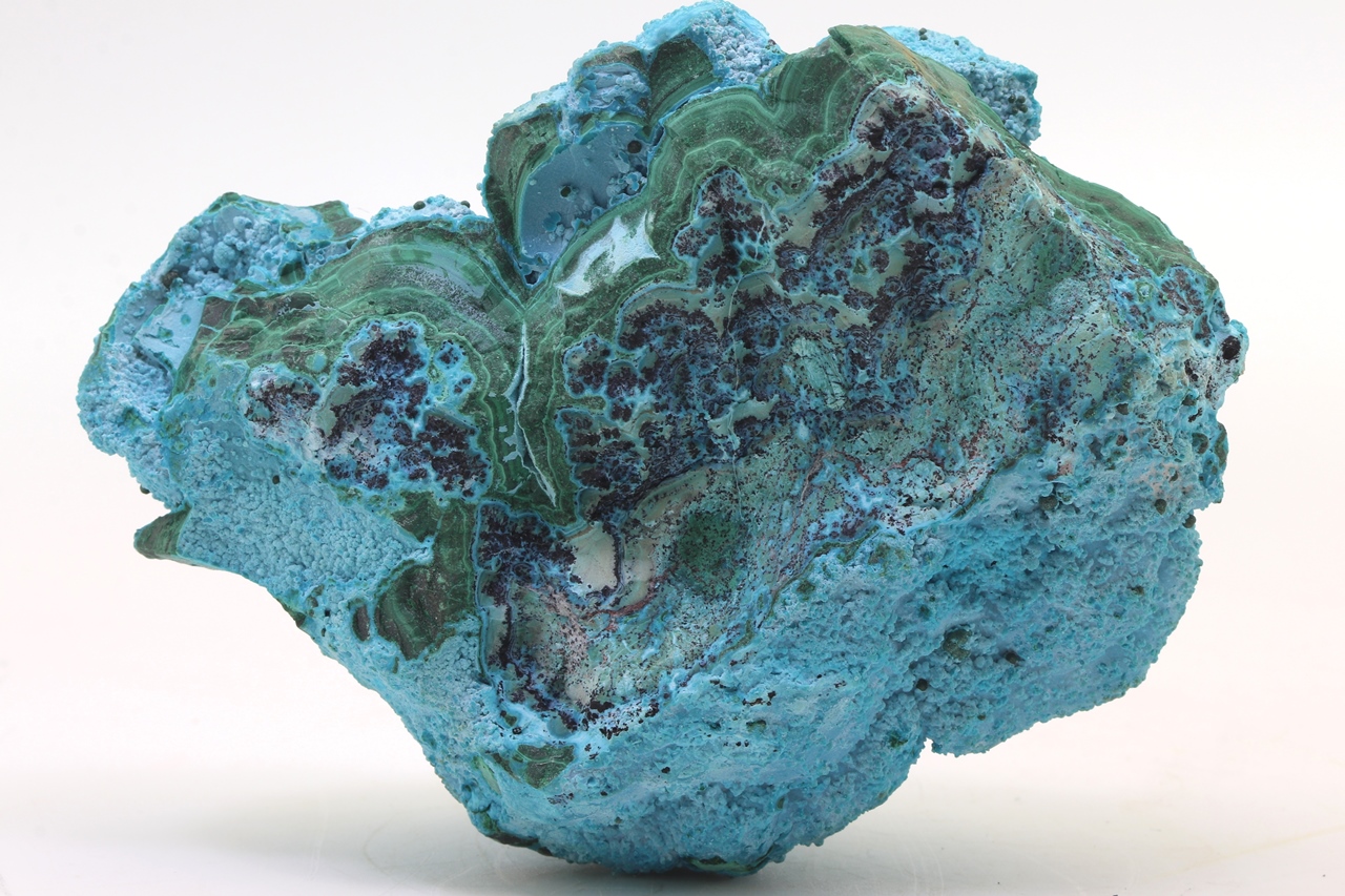 Beautiful, chrysocolla-covered color-zonal malachite from the Democratic Republic of Congo. On the chrysocolla, even another generation of malachite grows.