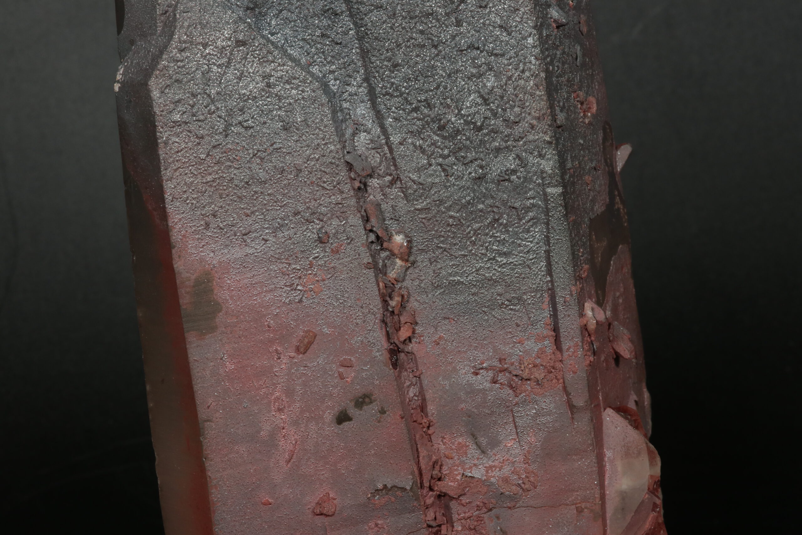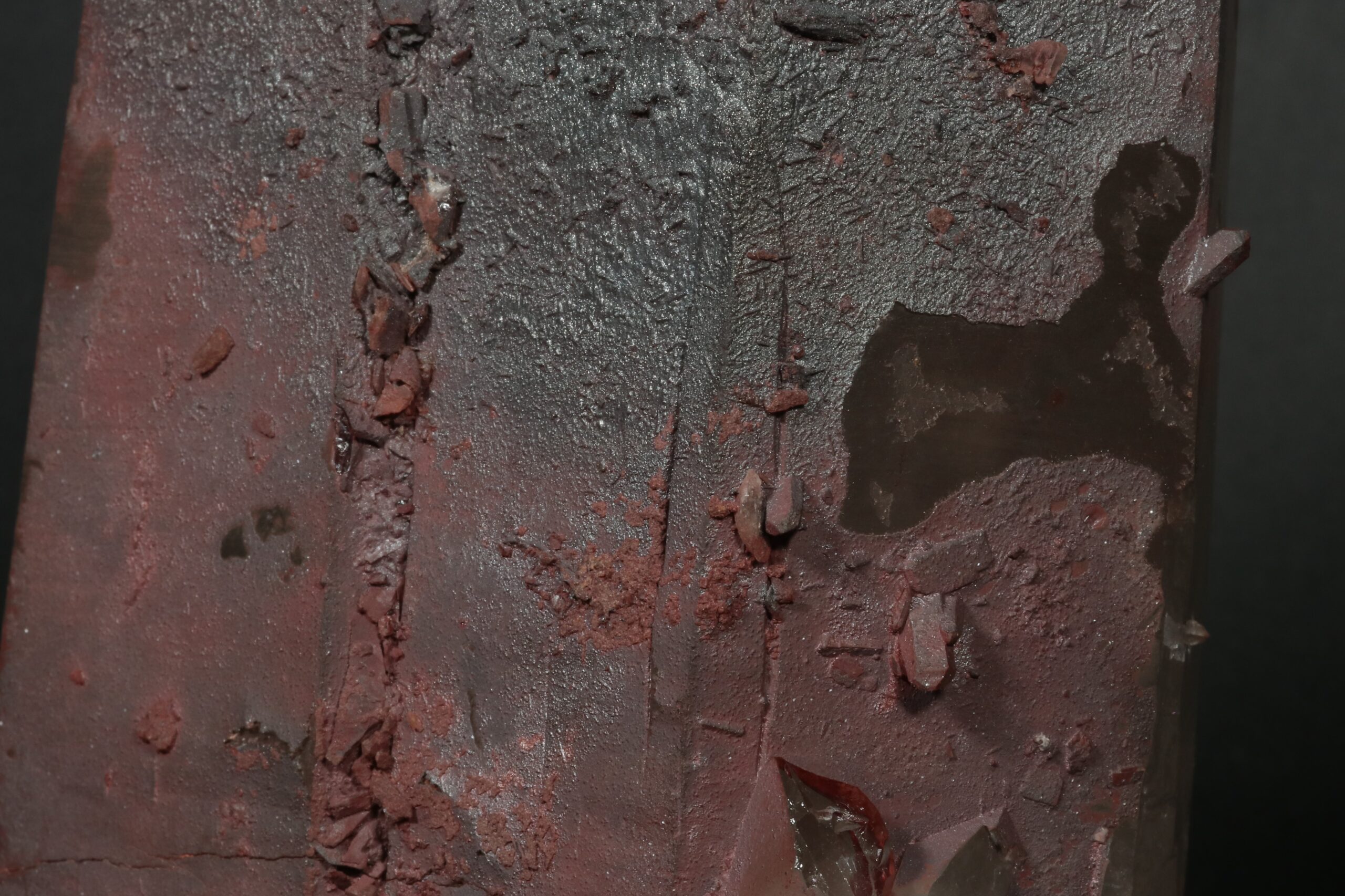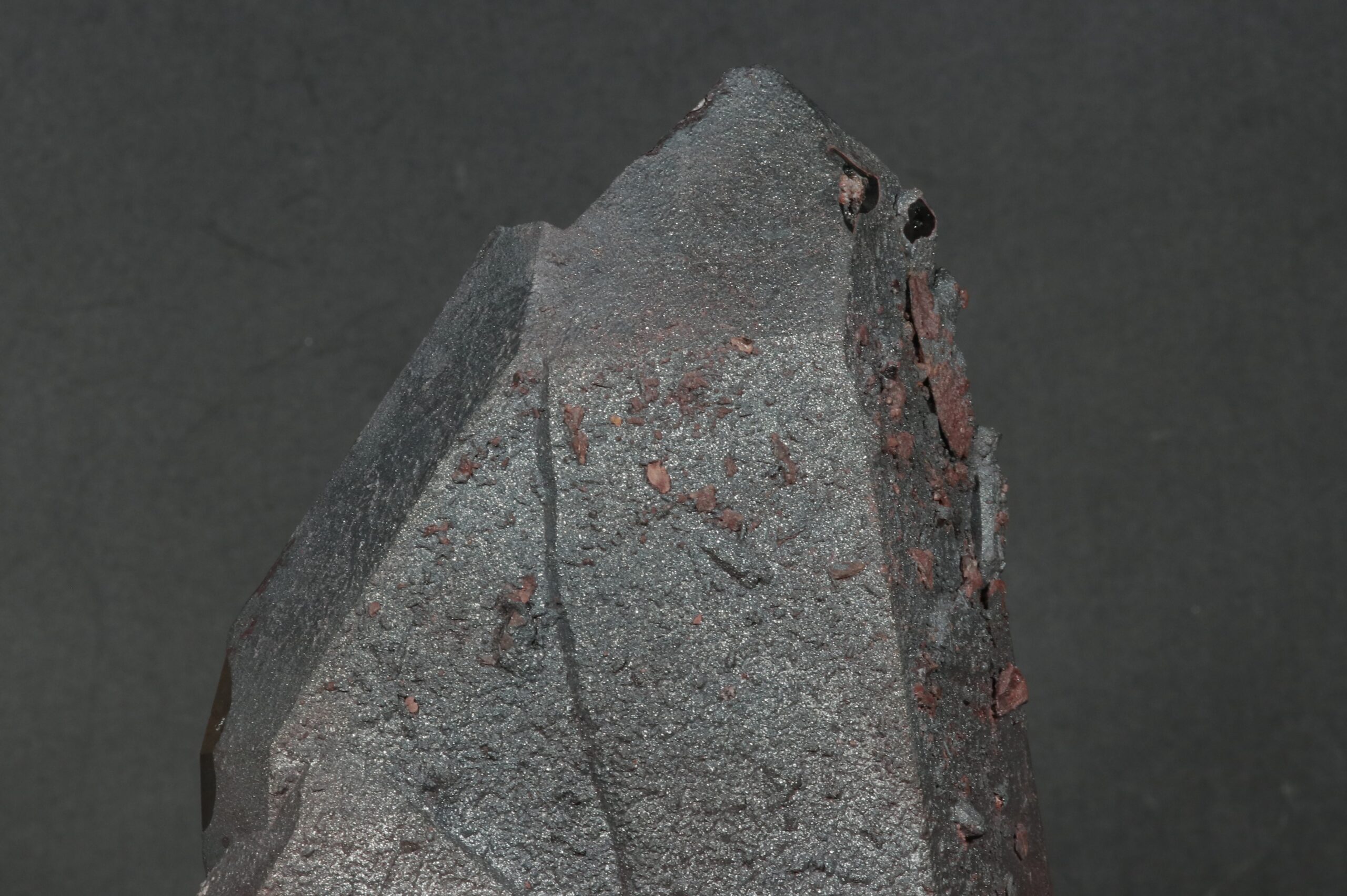 An exceptionally large cluster of quartz crystals overgrown with hematite. This is a very aesthetic and mineralogically interesting specimen. The crystals have perfectly terminated tips.