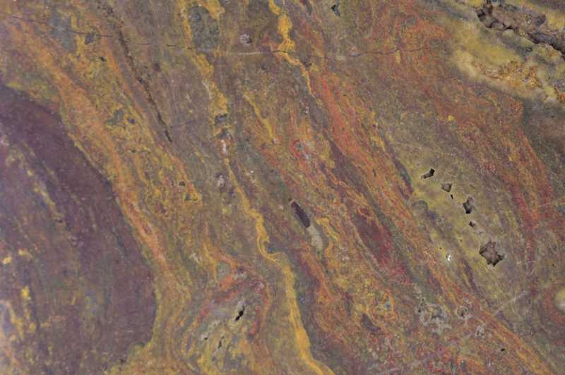 Aesthetic specimen of “ironstone” with predominantly green-yellow colors, into which red color enters. A very high-quality specimen of a large polished plate of iron quartz with classic green-yellow banded texture, transitioning into a streaky texture.