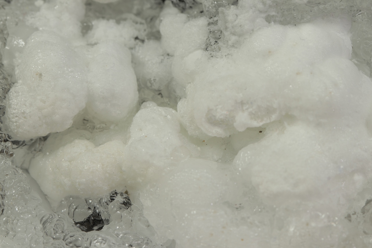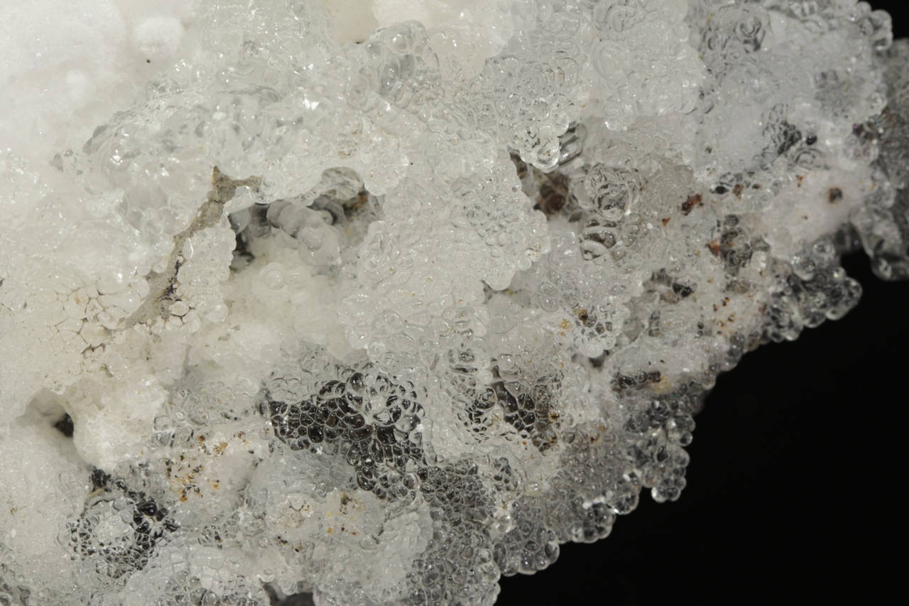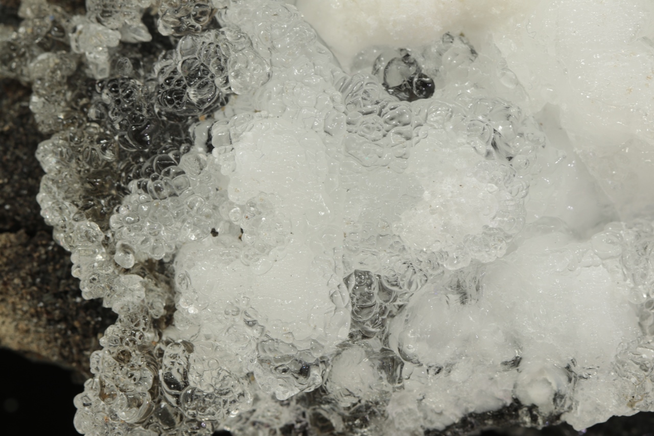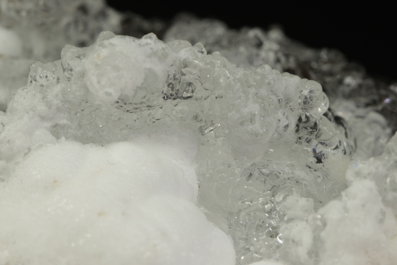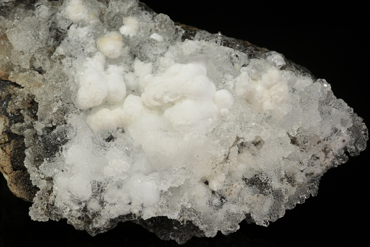 Large sample of clear and white crowns of hyalite. The sample glows under UV light.