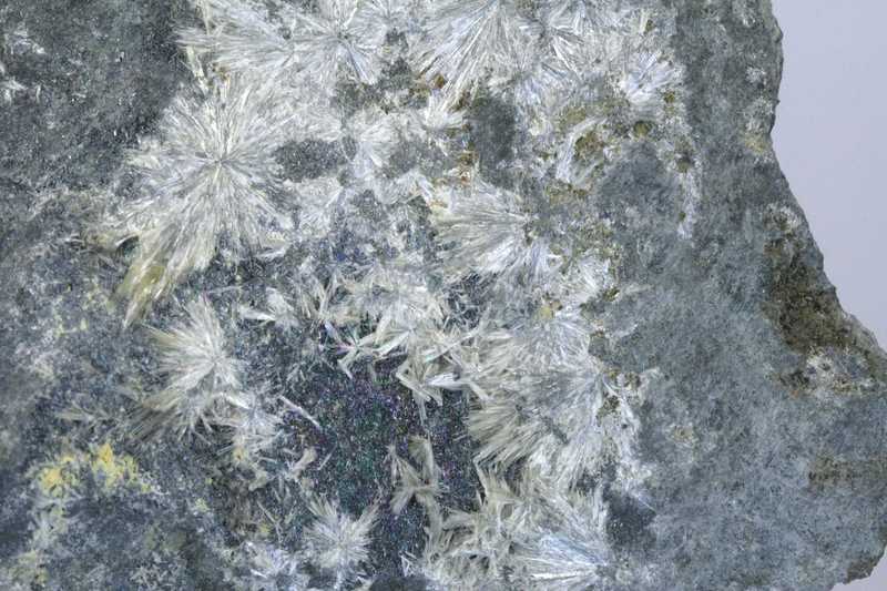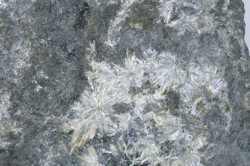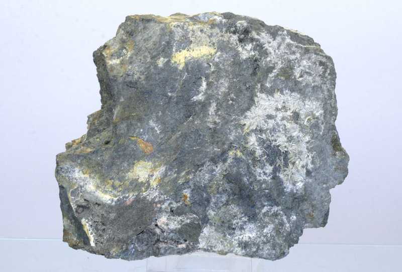 A very nice specimen of the beautiful antimony oxide valentinite from the Slovak deposit in Pezinok. A very high-quality specimen of white, silky shiny, radially starburst aggregates of valentinite, which abundantly sit on a large piece of antimony ore.