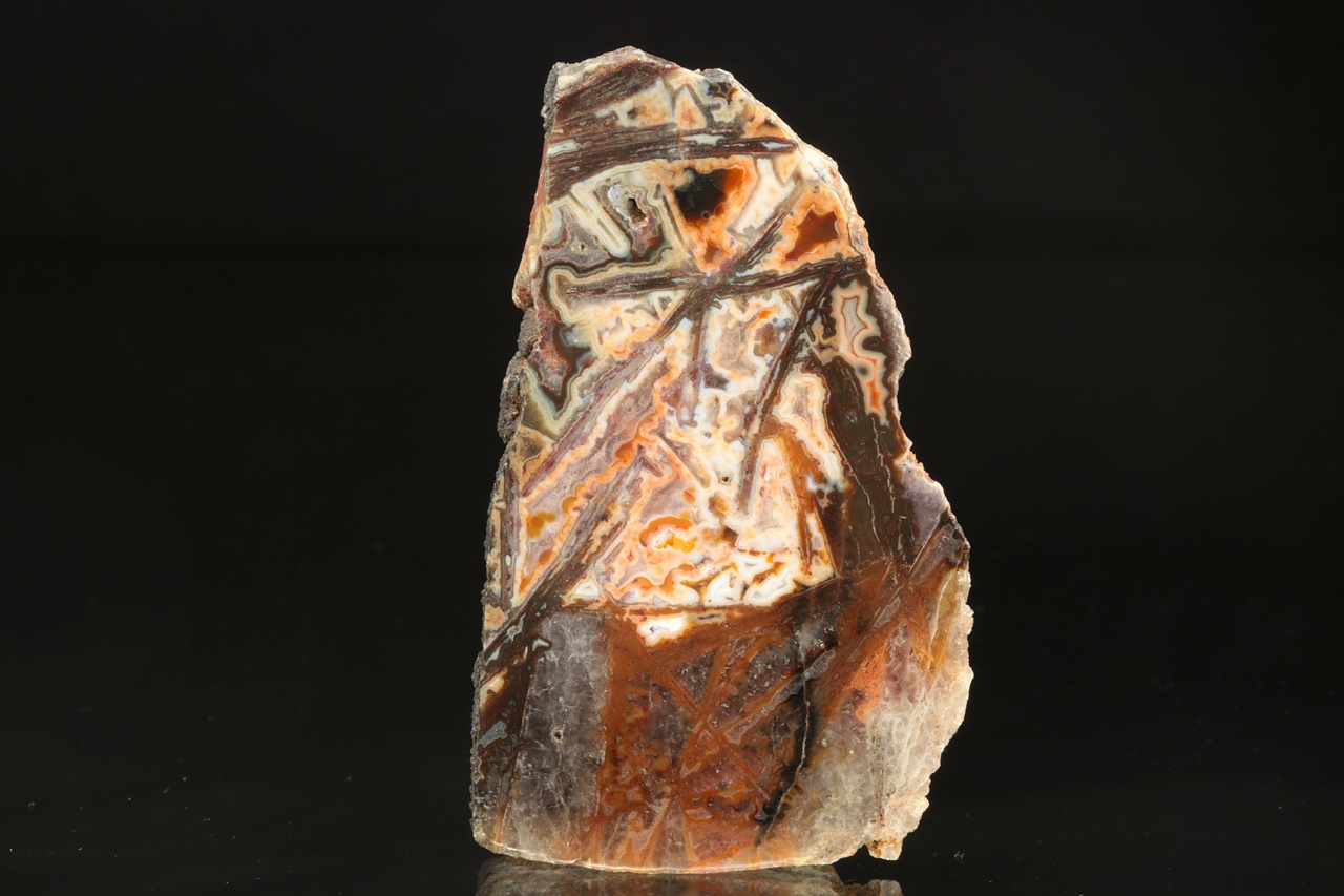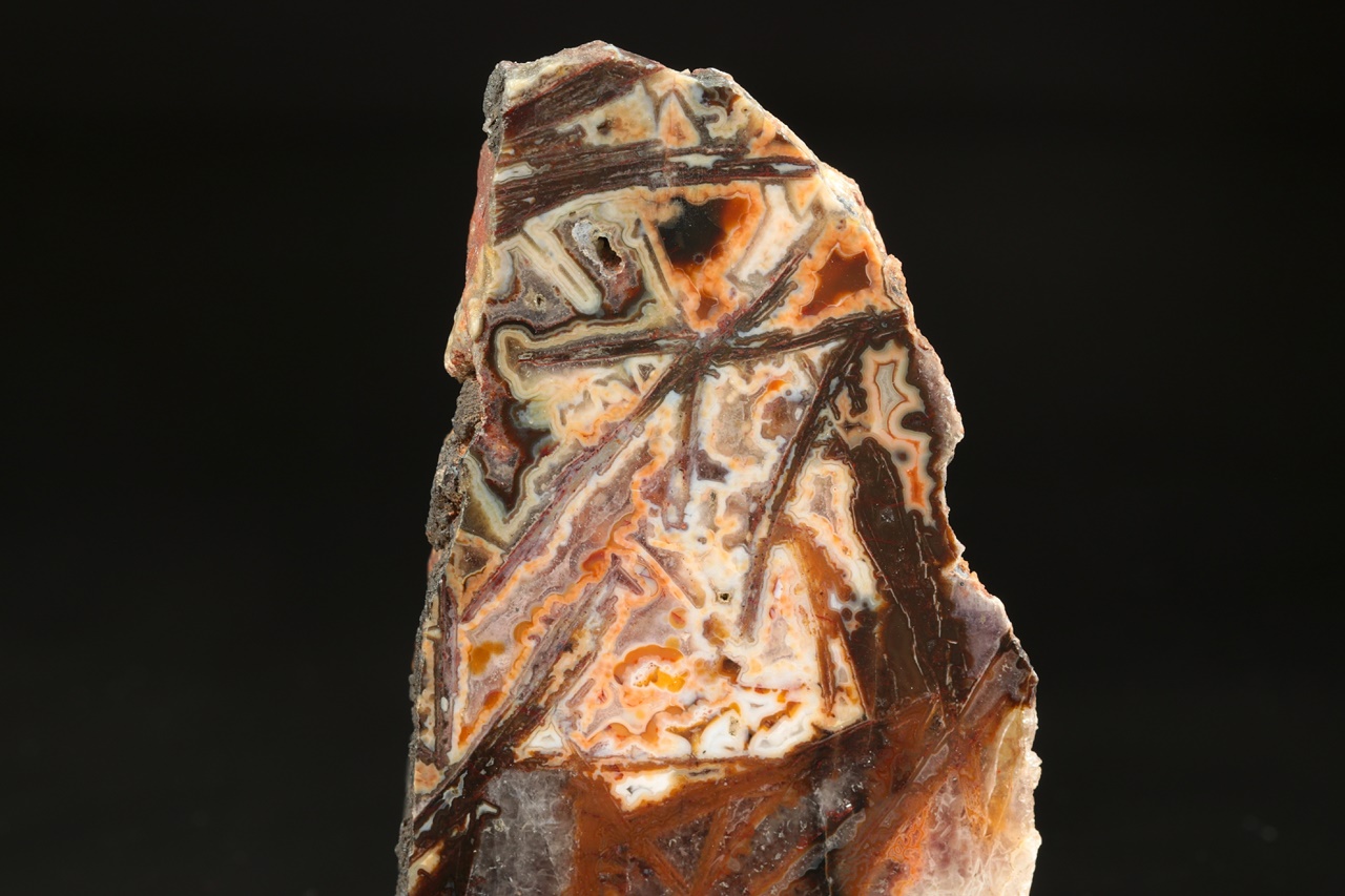 Bílo černo oranžový, leštěný achát s texturou s protáhlými žilkami.