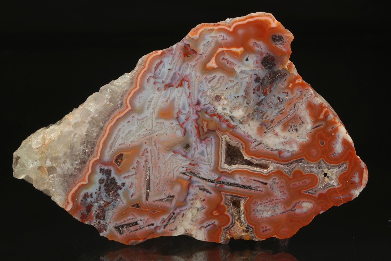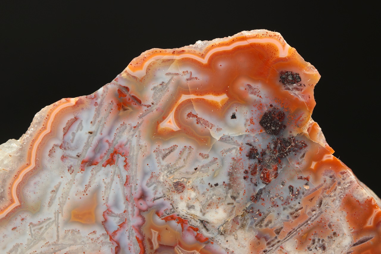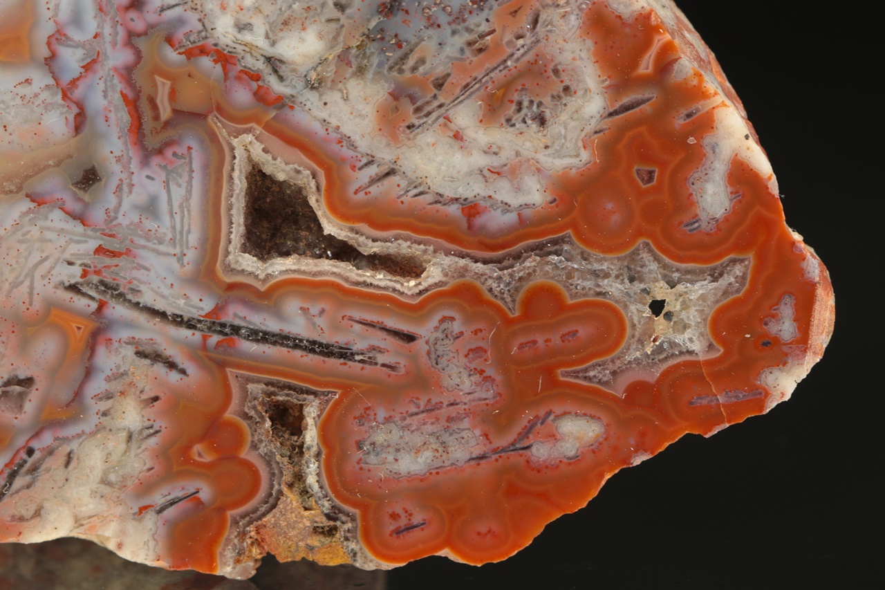 Leštěný vzorek achátu ze známé krušnohorské lokality se sytě červenými linkami. Uprostřed vzorku je drobná křemenná dutinka.