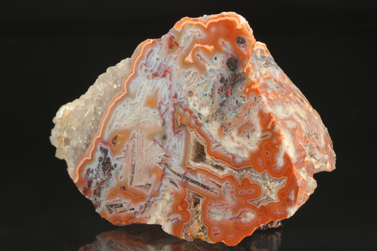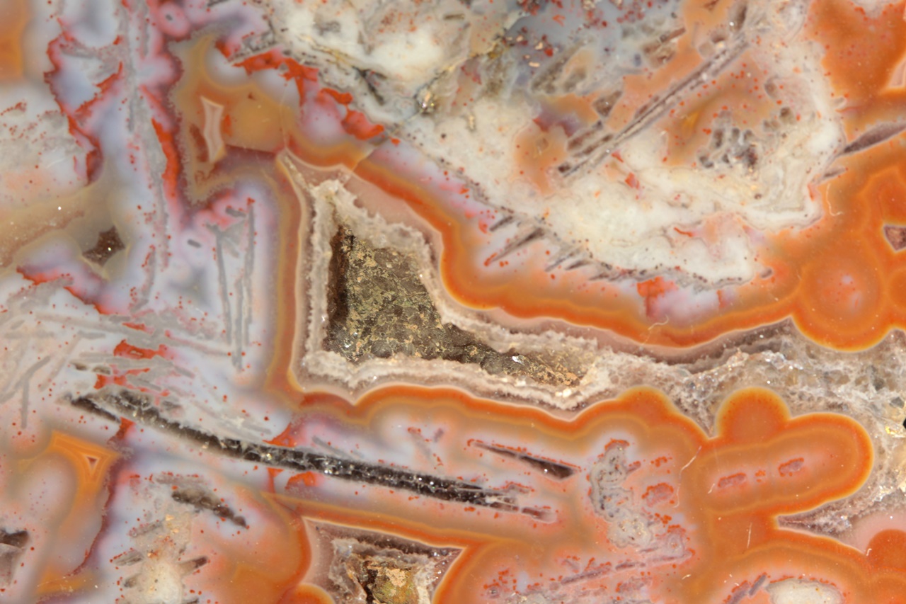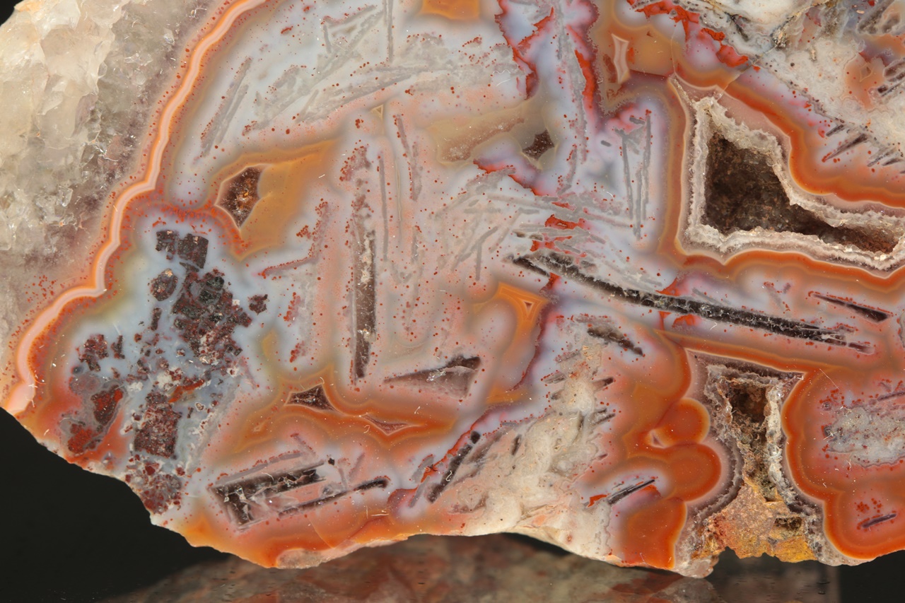 Leštěný vzorek achátu ze známé krušnohorské lokality se sytě červenými linkami. Uprostřed vzorku je drobná křemenná dutinka.