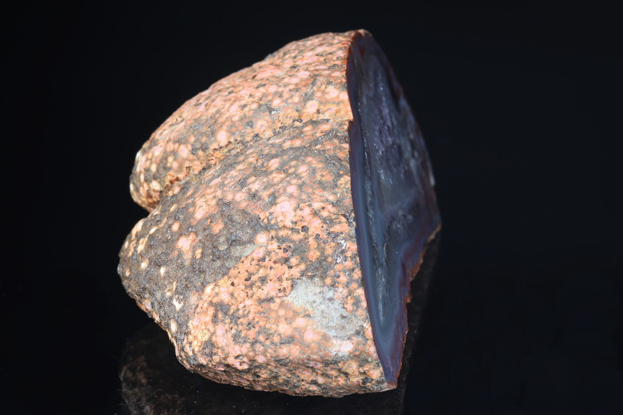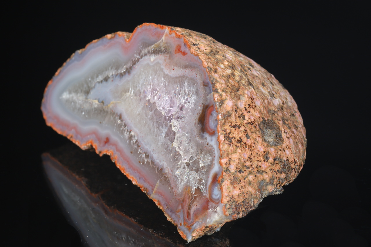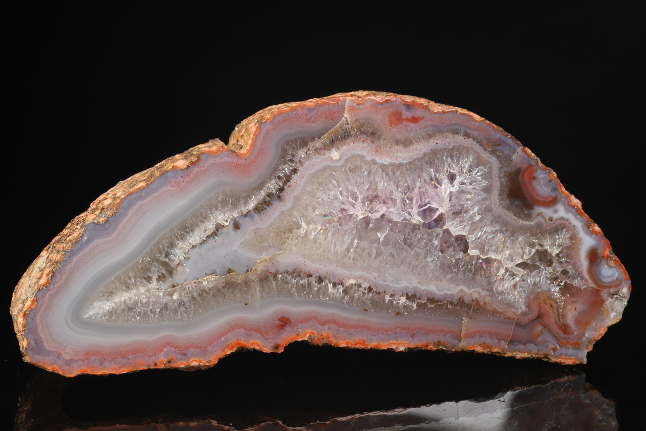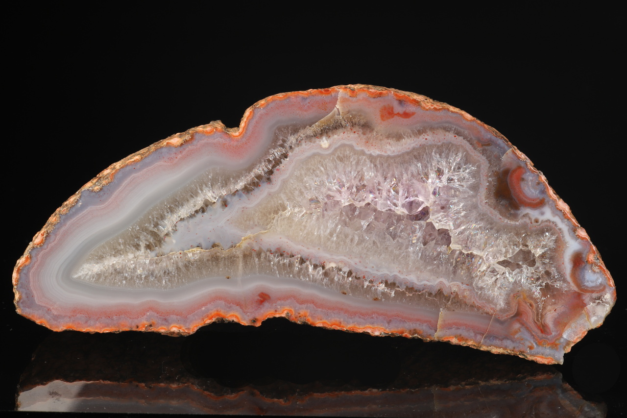 Pěkná ukázka kompletní leštěné poloviny geody s achátovým lemem, který přechází ve světlý ametyst. Vzorek pochází ze slavného naleziště Rašovka u Liberce.