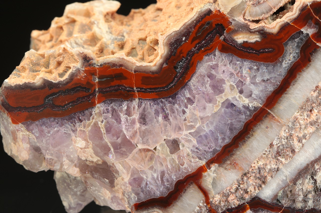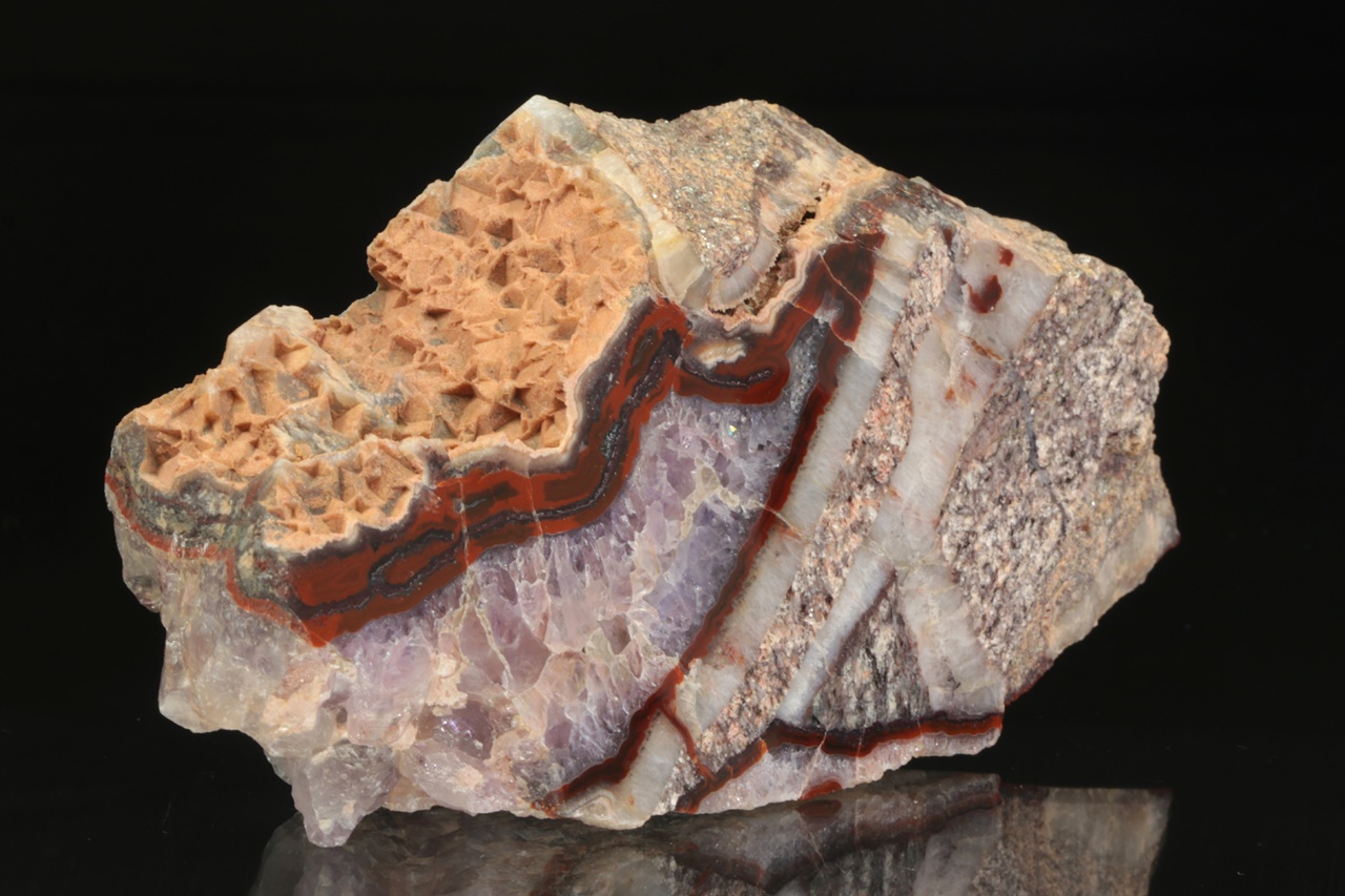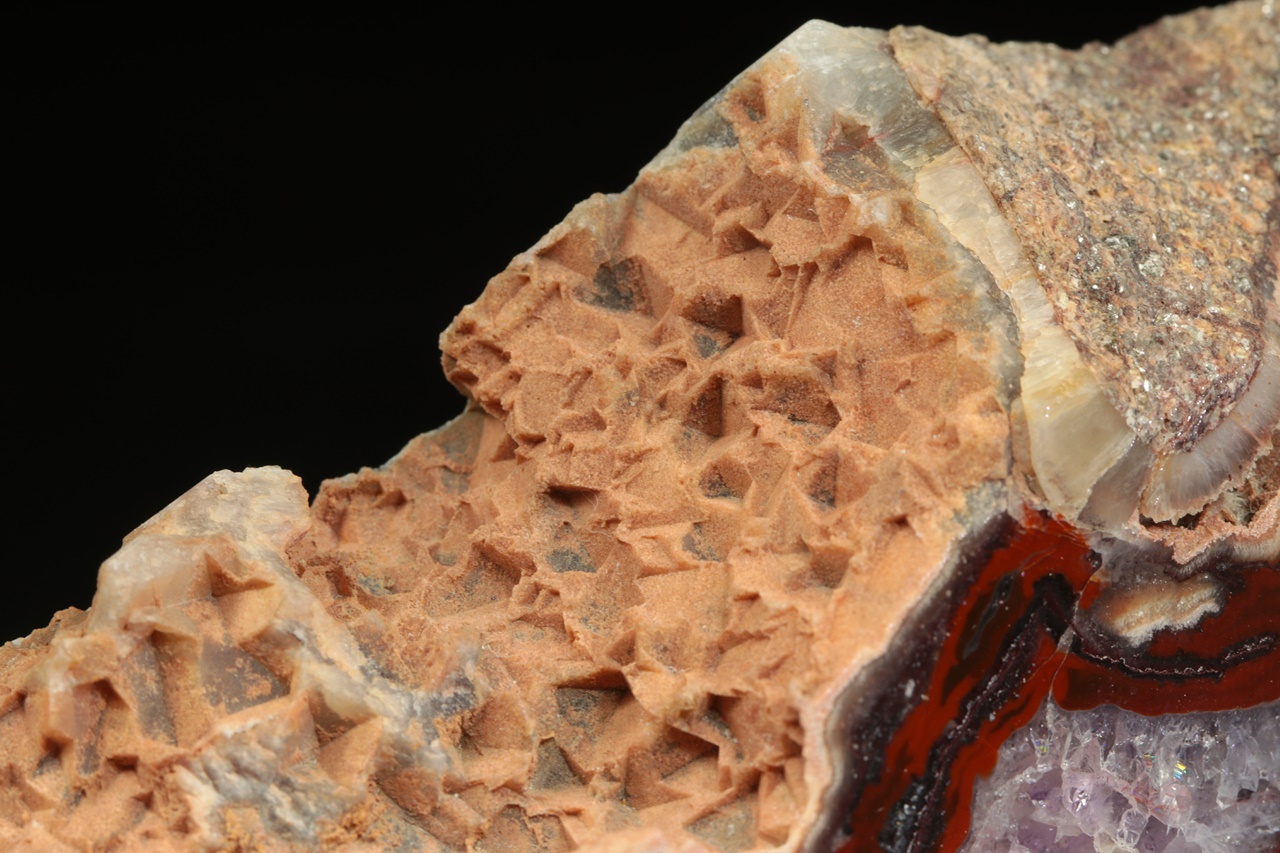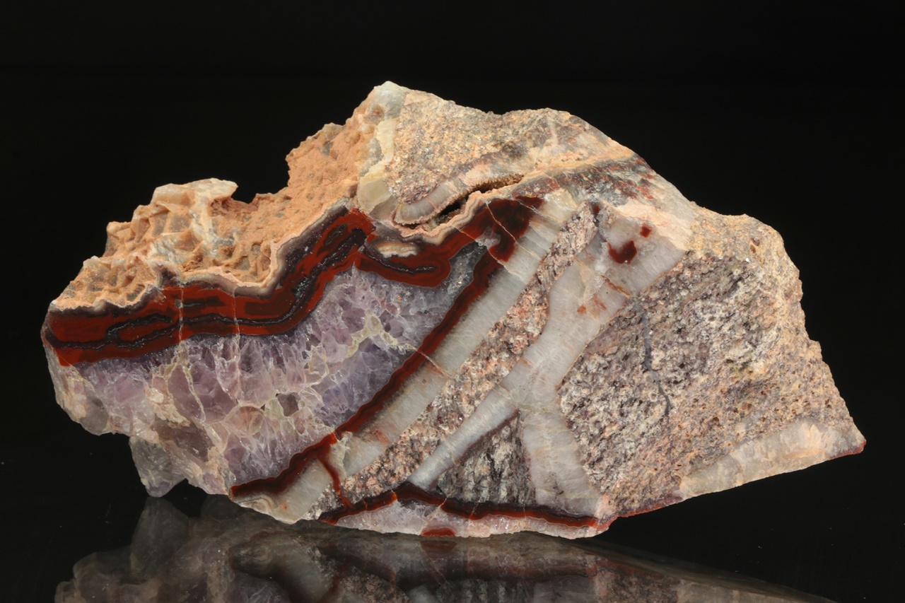 Ametyst ohraničený sytě červeným achátem s brekcií tmelenou křemenem z klasické krušnohorské lokality. Vzorek je ze zadní strany seřízlý.