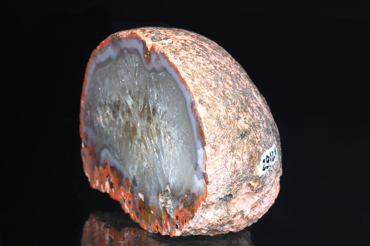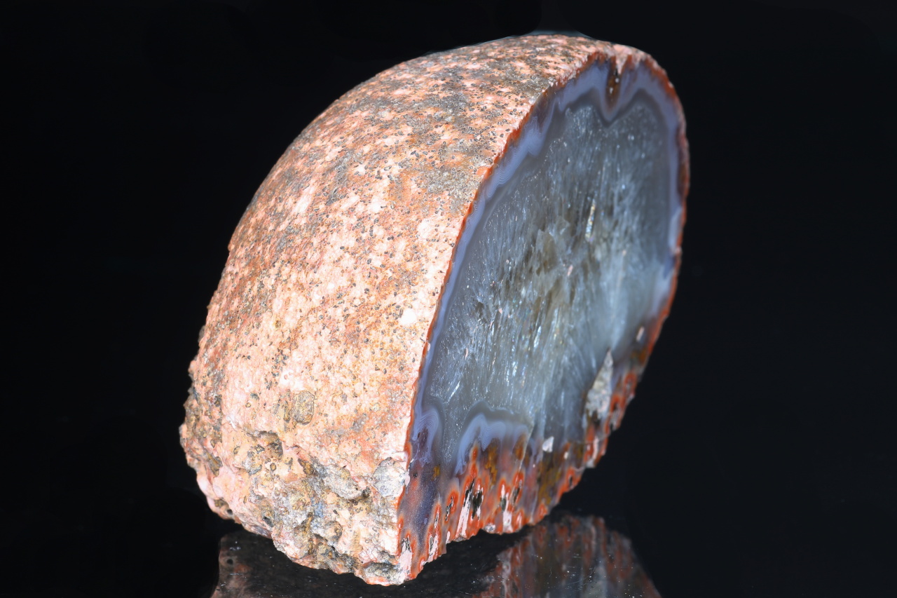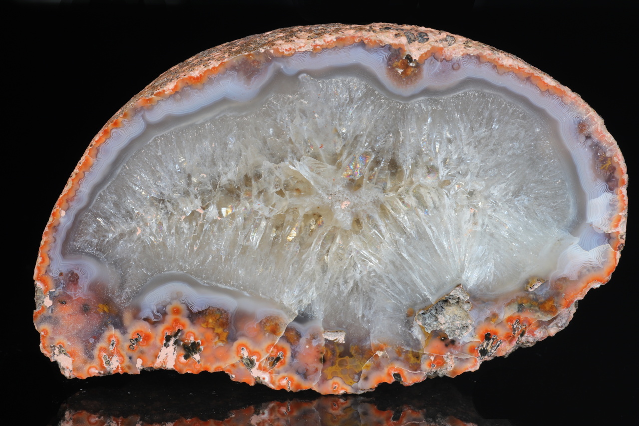 Pěkná ukázka kompletní leštěné poloviny geody s achátovým lemem, který přechází v křišťál. Vzorek pochází ze slavného naleziště Rašovka u Liberce.