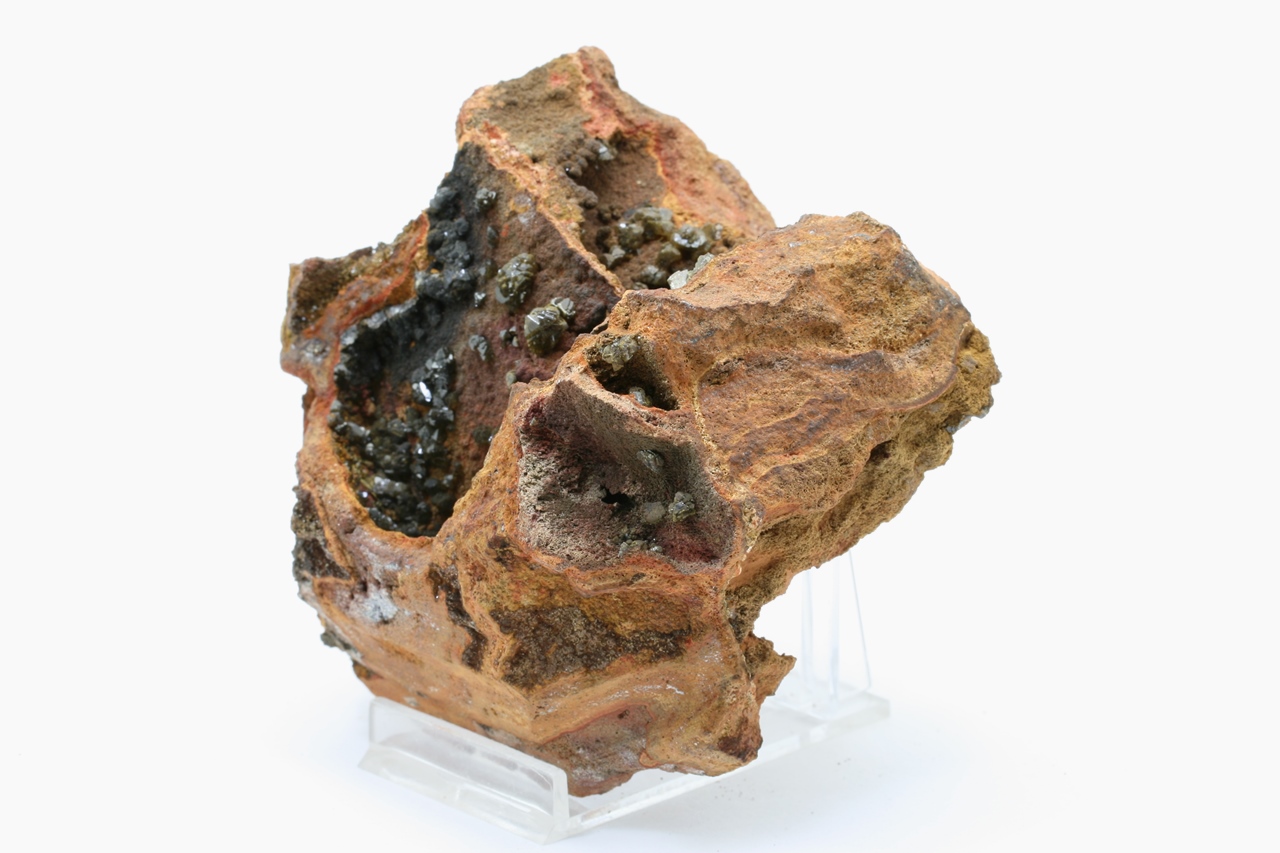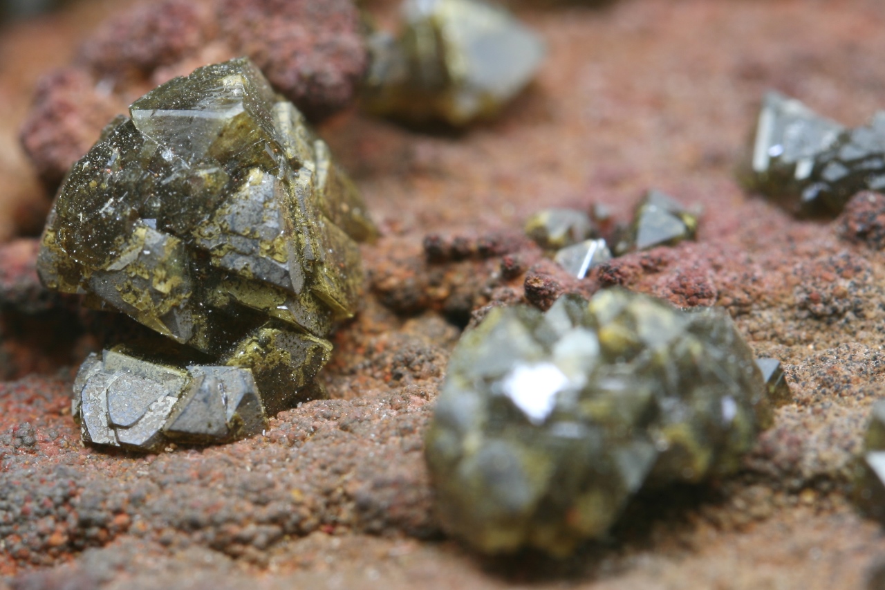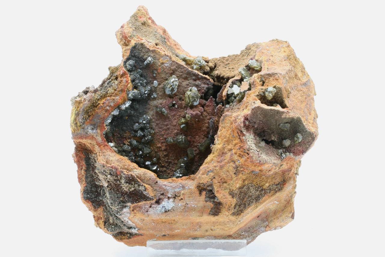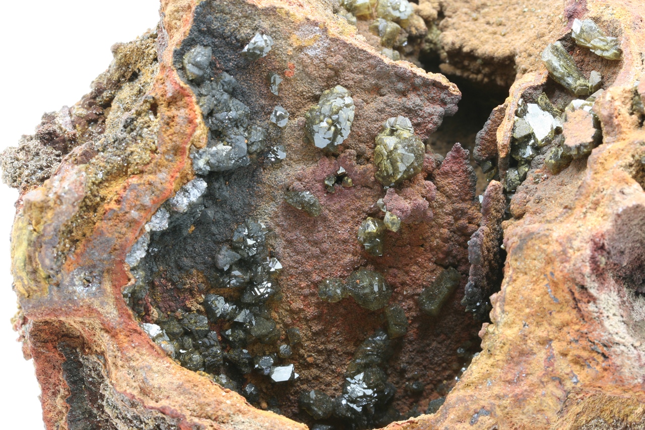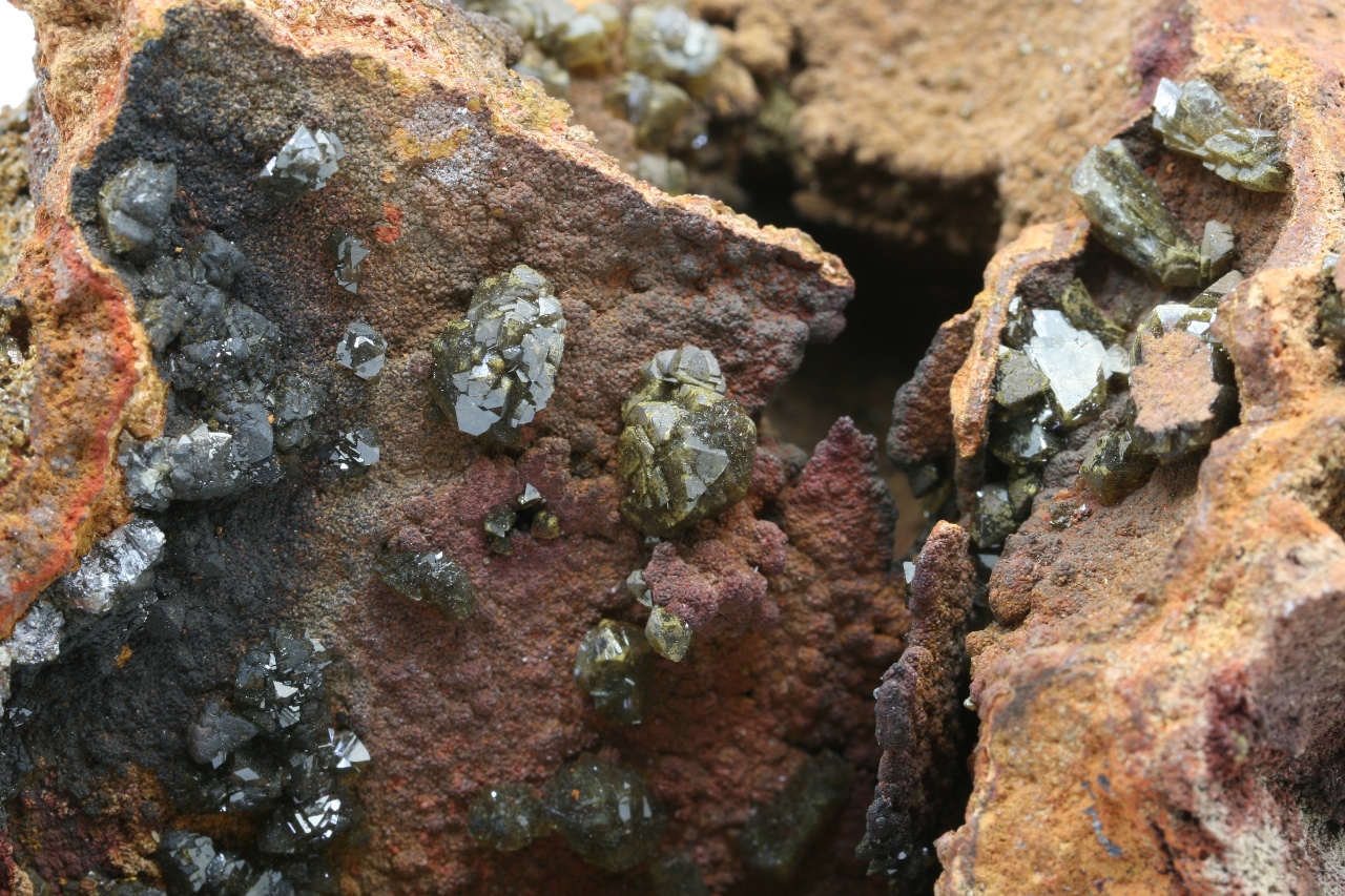 Dark green, shiny crystals and aggregates of zinc arsenate grown in a limonite cavity. The cavity measures approximately 4 × 5 cm, and the largest aggregate is 8 mm in size.