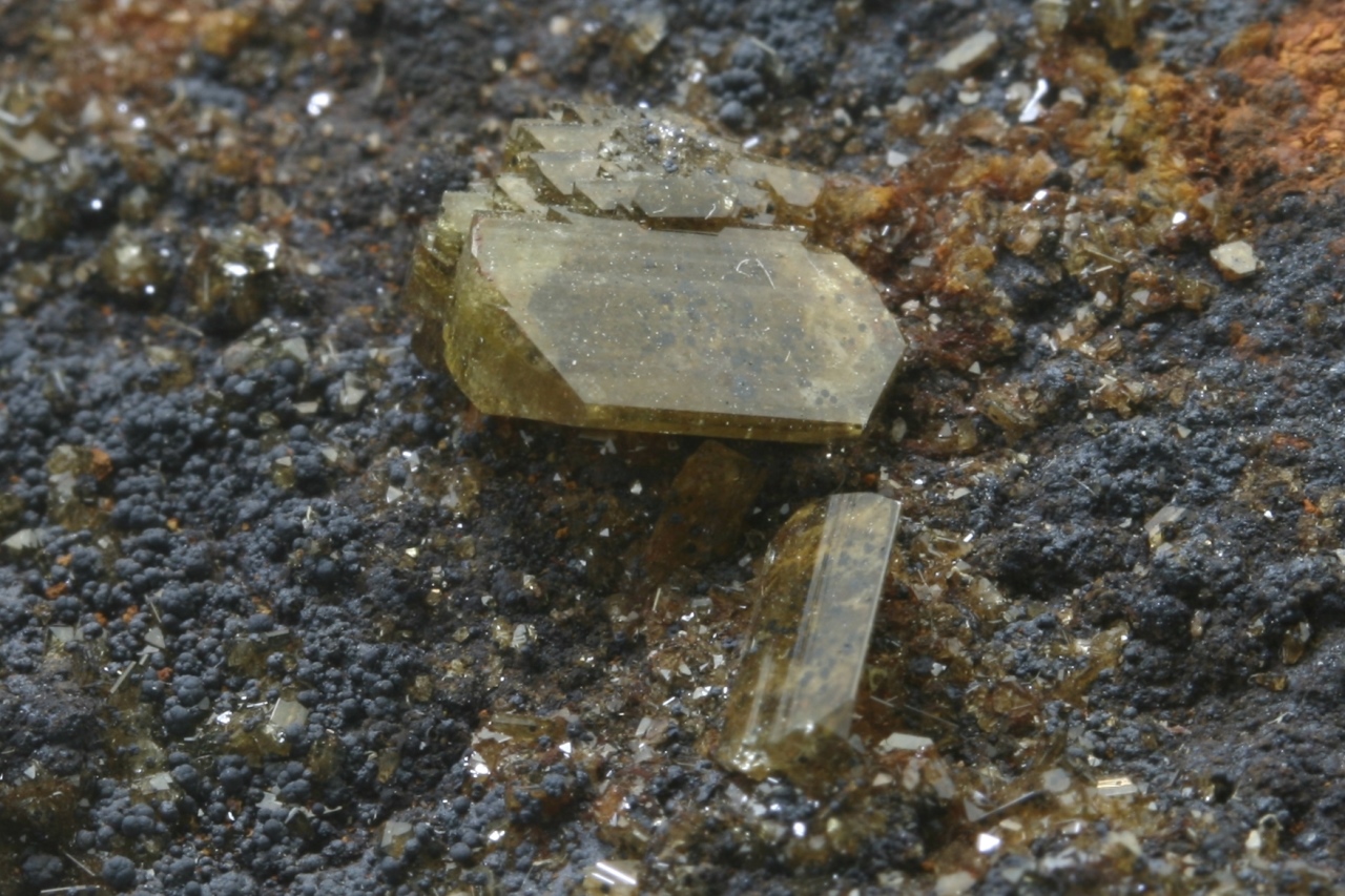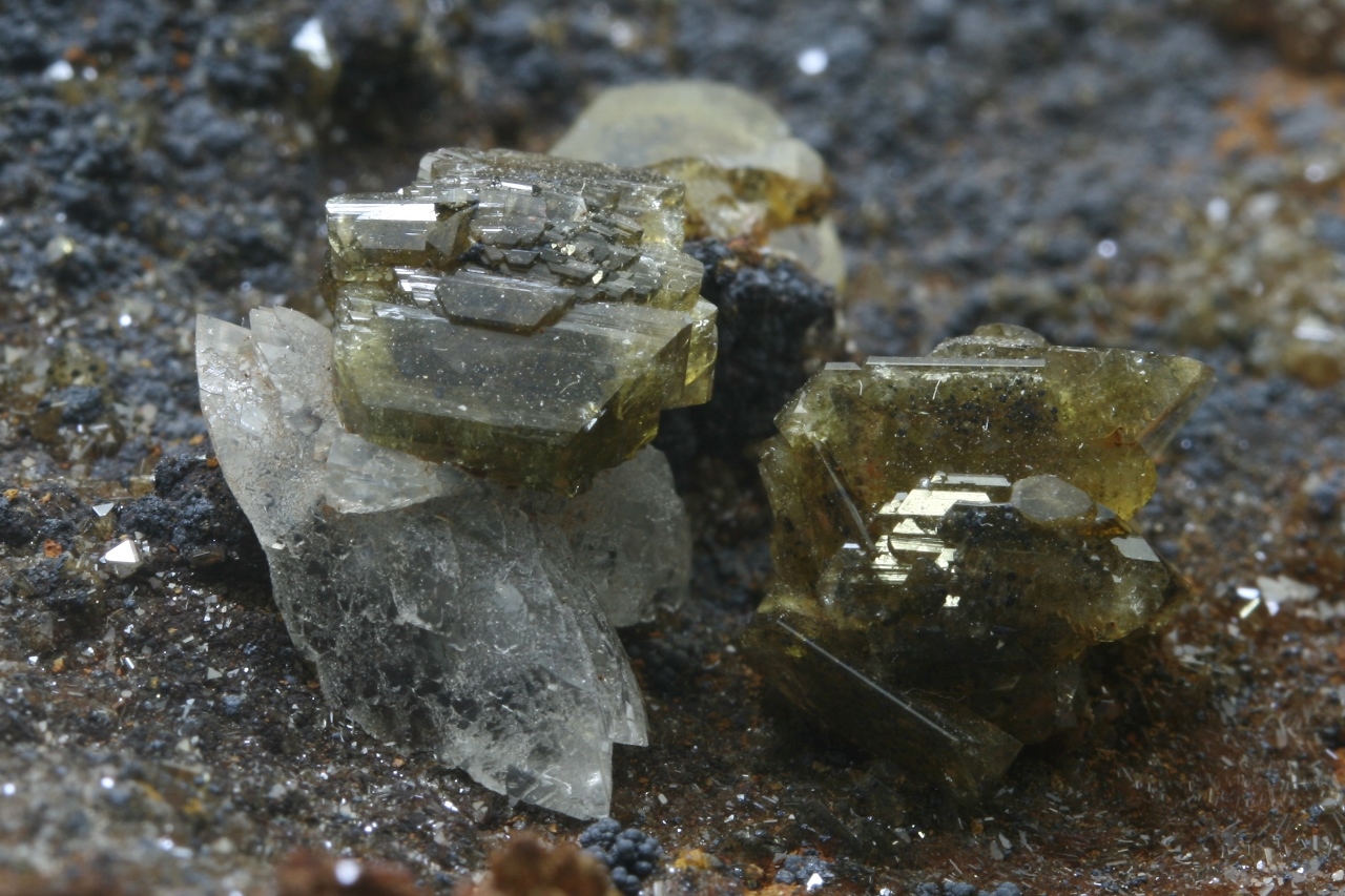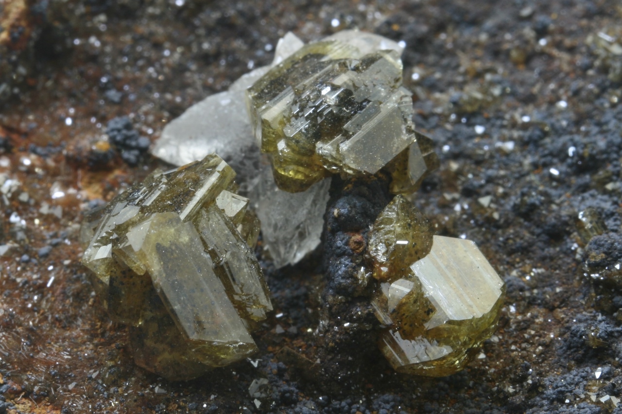 Large, shiny, beautifully defined crystals of lead arsenate – adamite up to 9 mm in size with a crystal of white calcite.