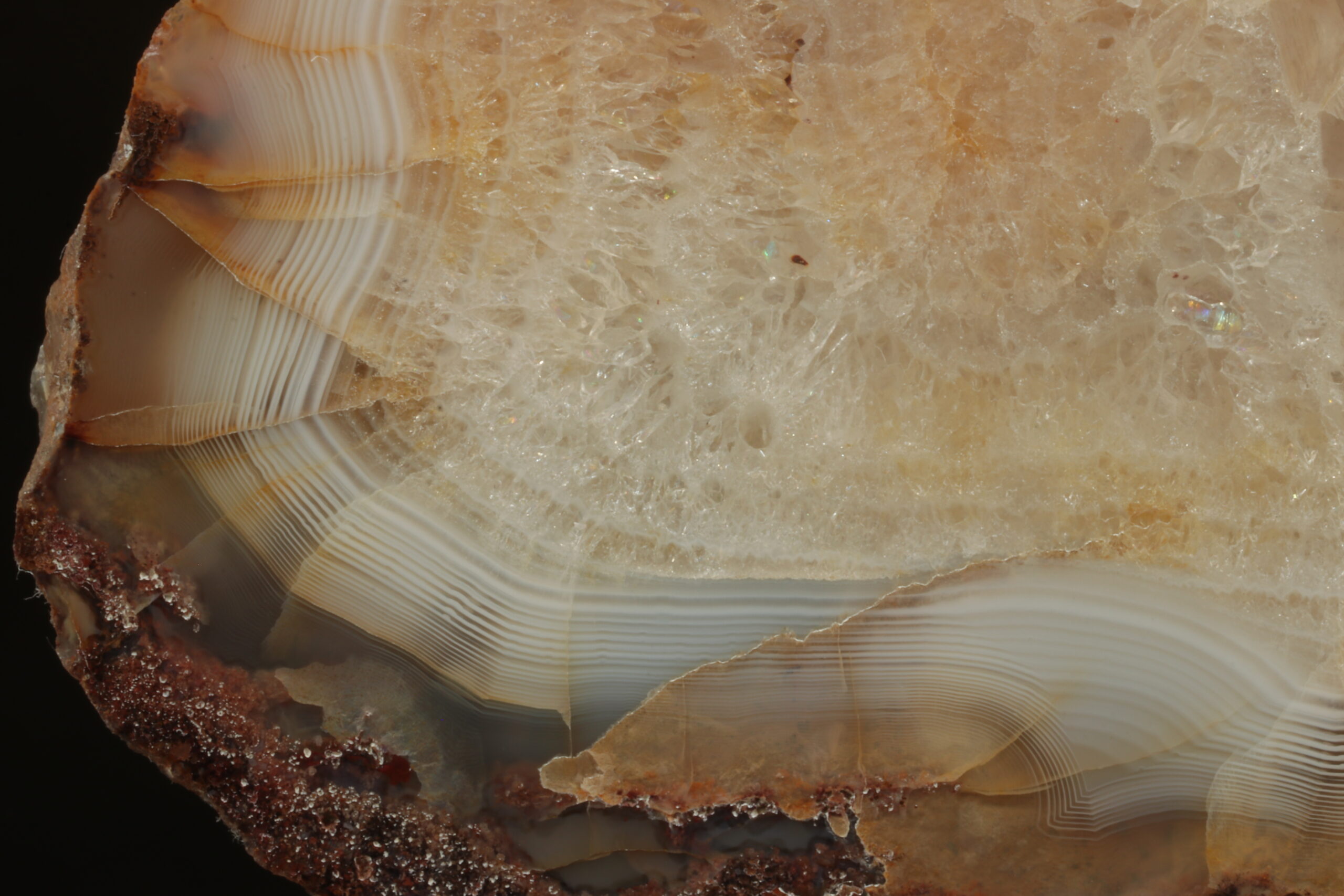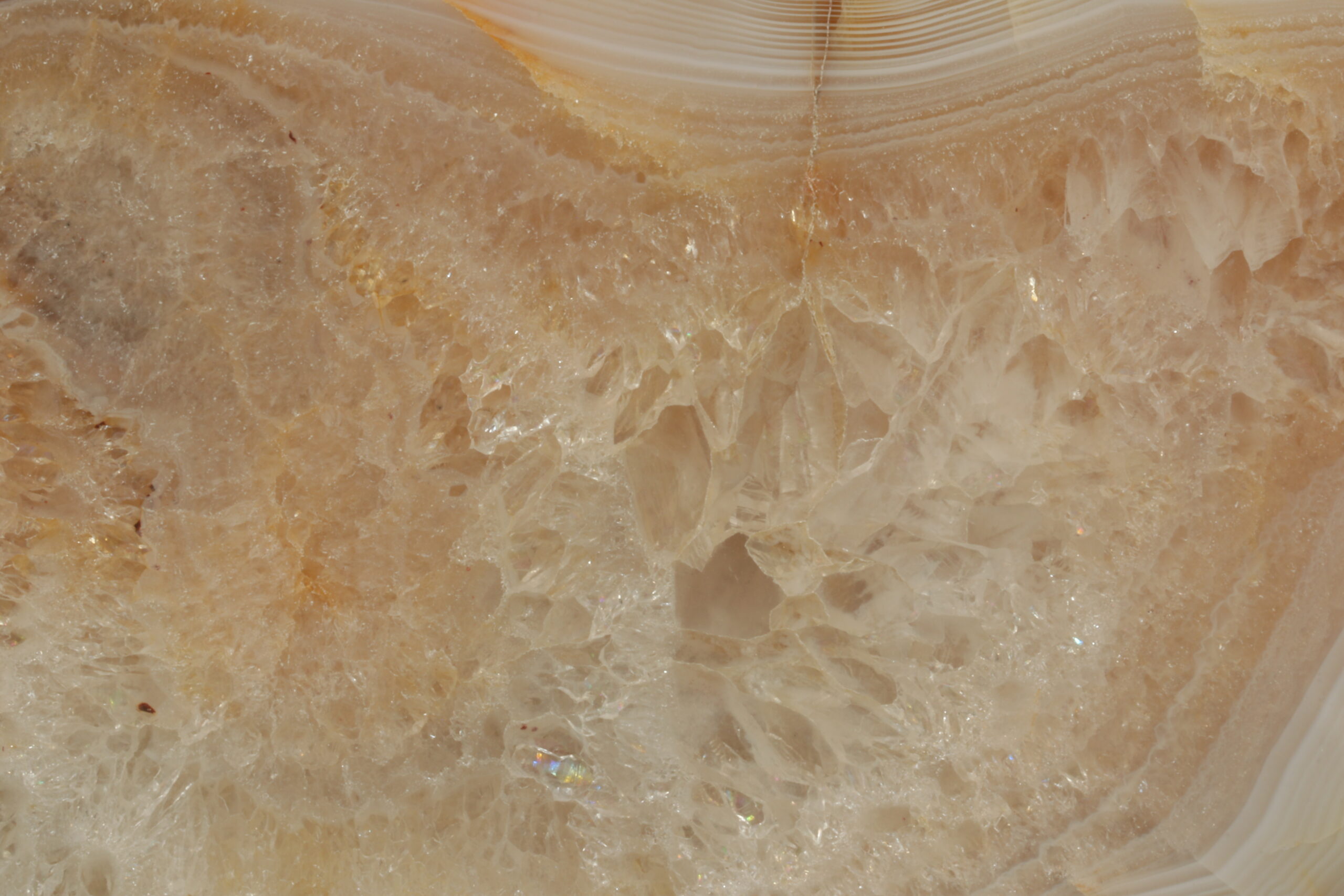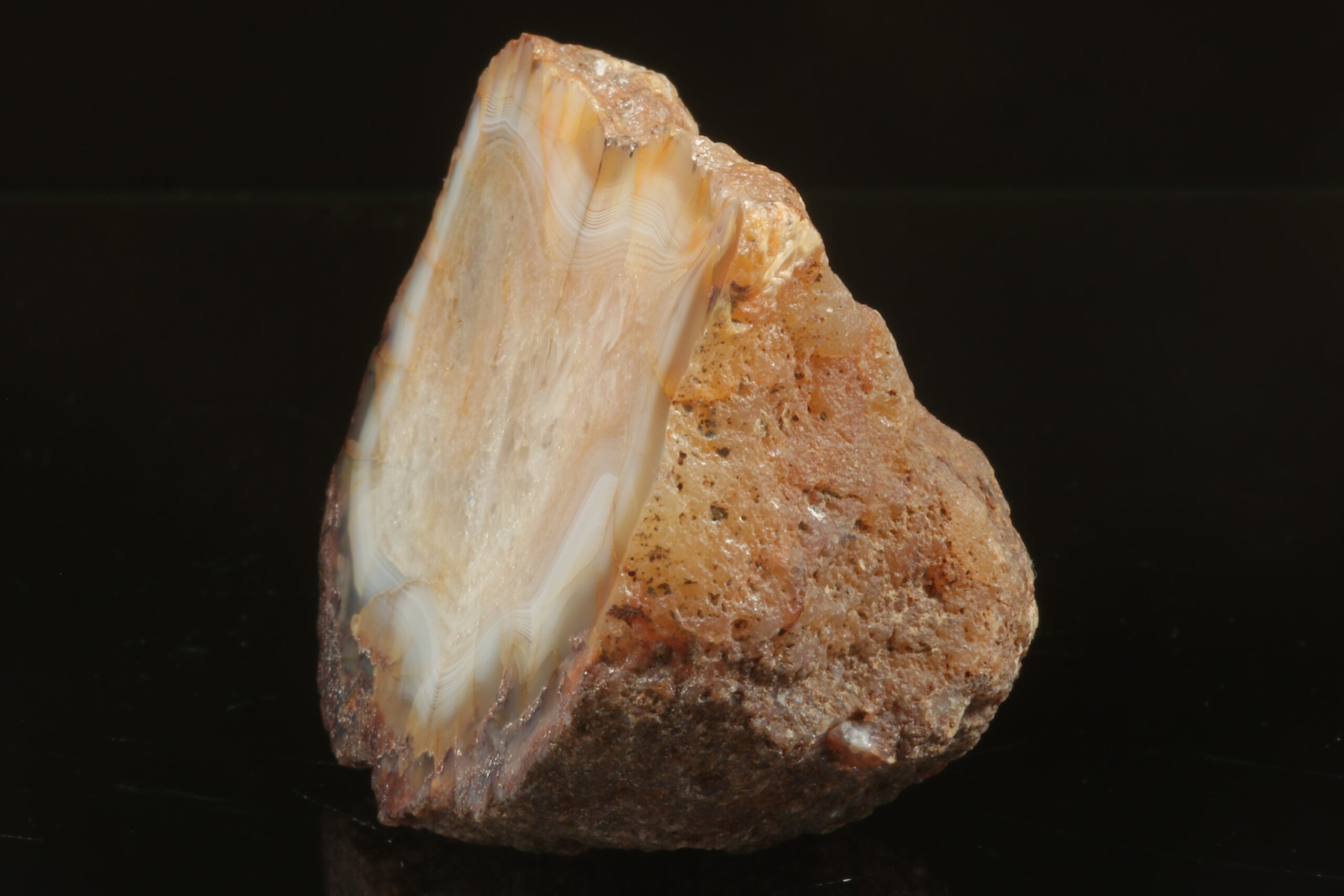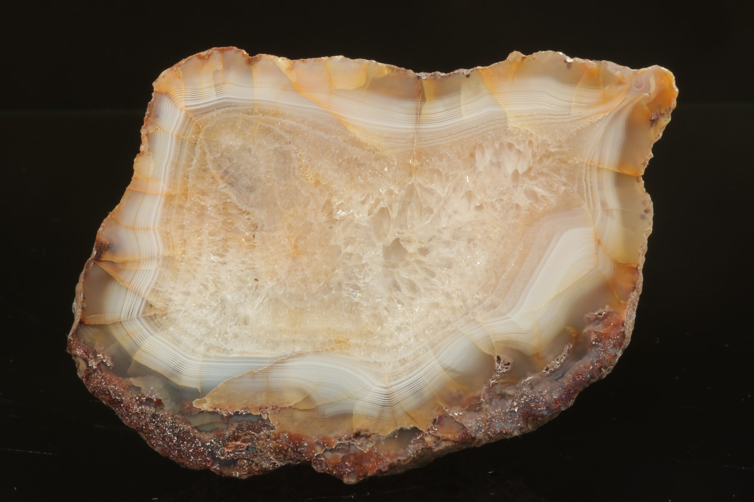 Sample of agate with an interesting pattern. Crystalline quartz alternates with white and yellowish bands of amorphous material. The sample is polished on one side.