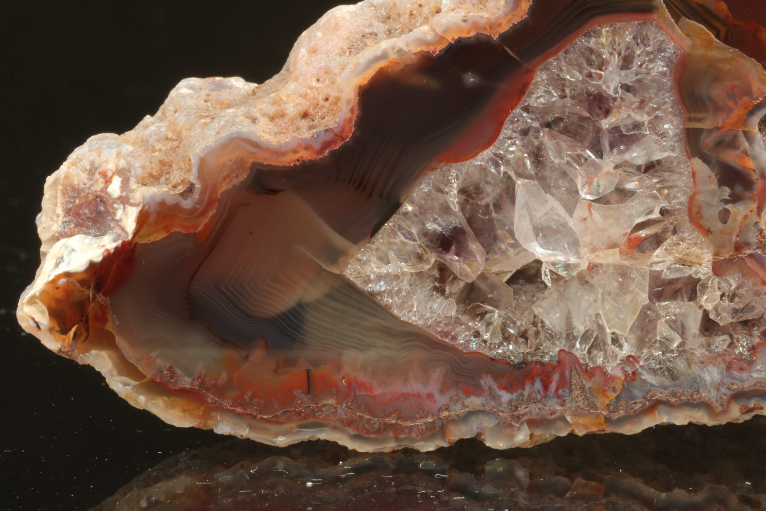 Sample of agate from the year 1994. The stone has an amorphous pattern around the edges and the central part consists of crystals of clear quartz. The front side of the sample is polished. The stone is placed on a base without a stand. The crystals have a high gloss and a so-called rainbow can also be observed.