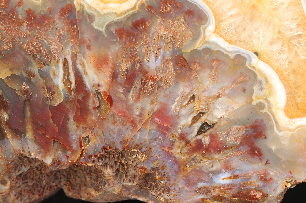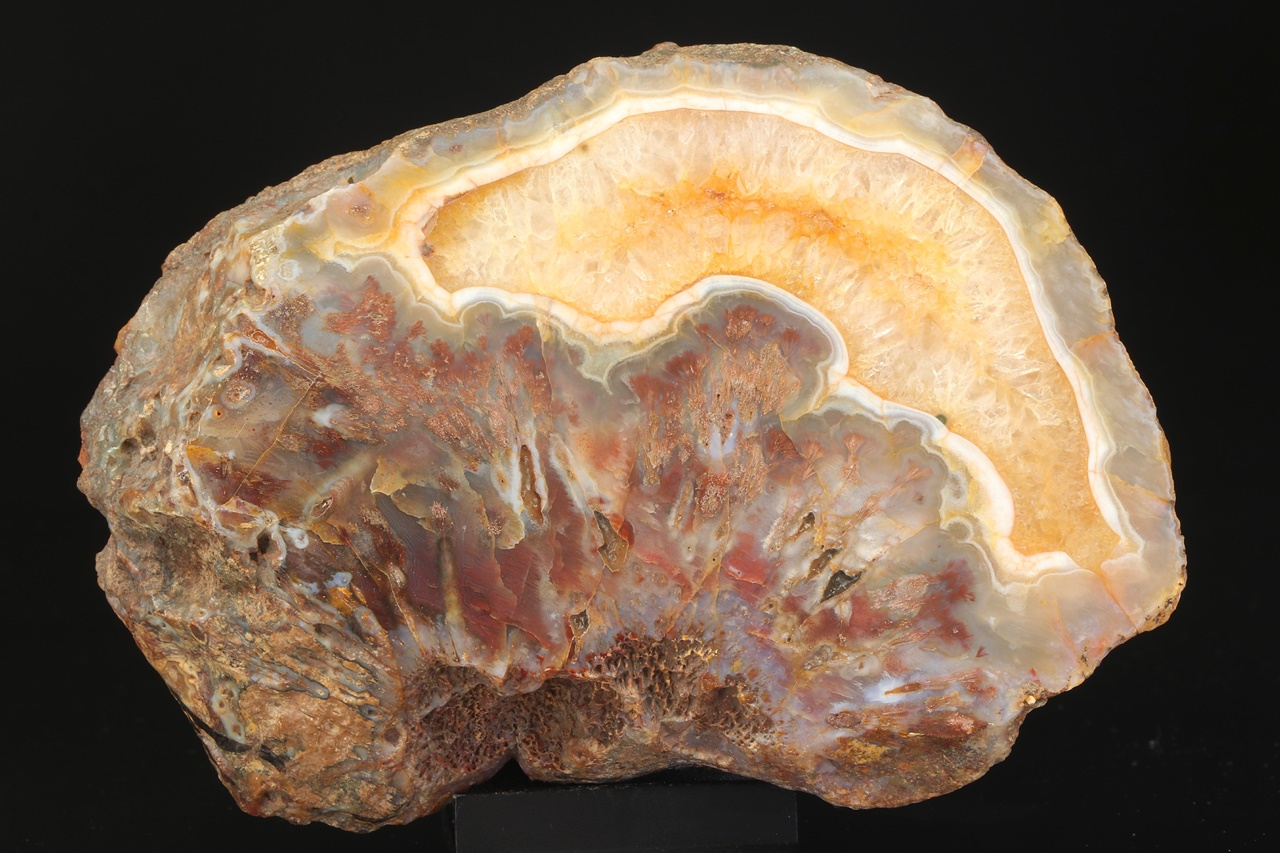 A relatively large agate with nicely grown dendritic patterns and the top part filled with crystalline quartz. The sample is sliced off from the back.