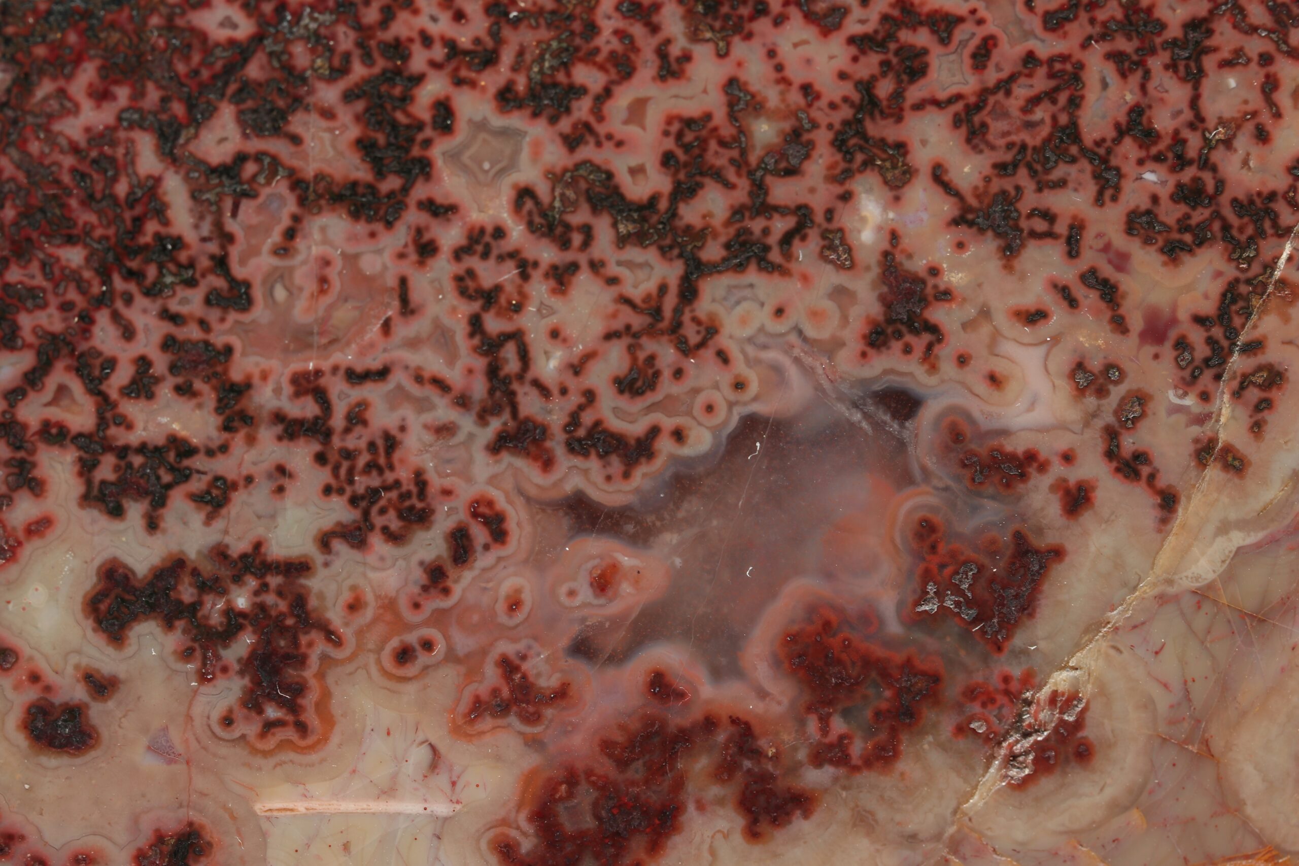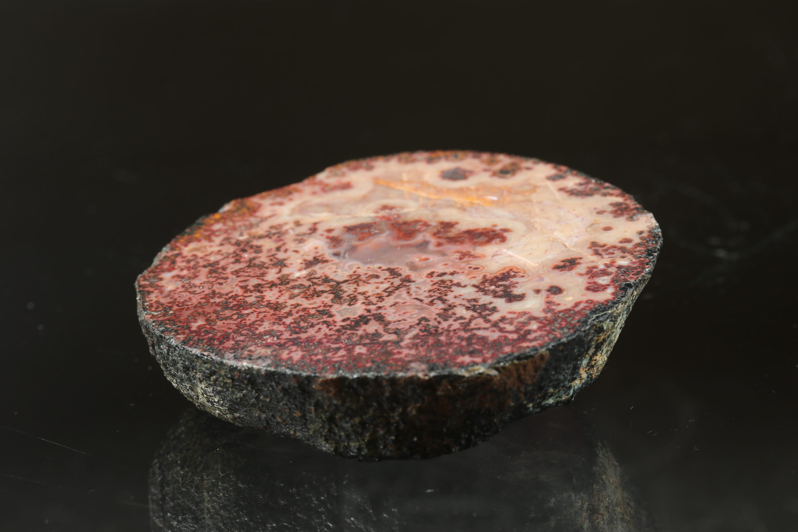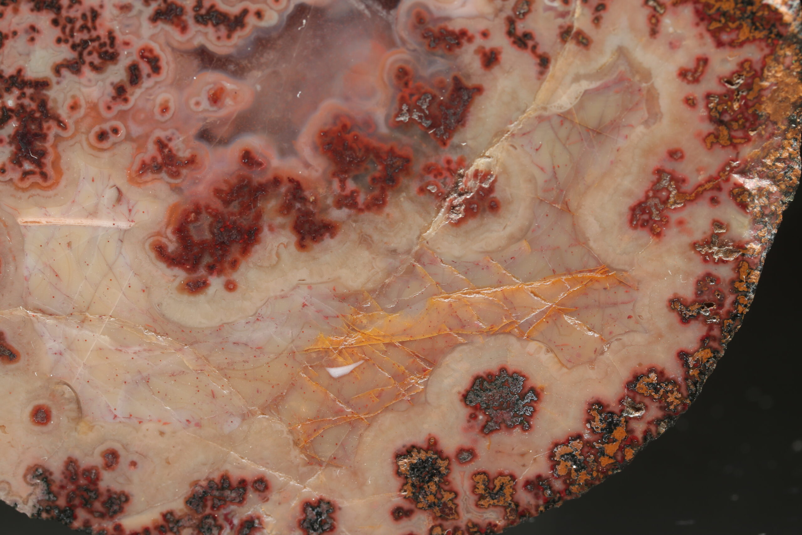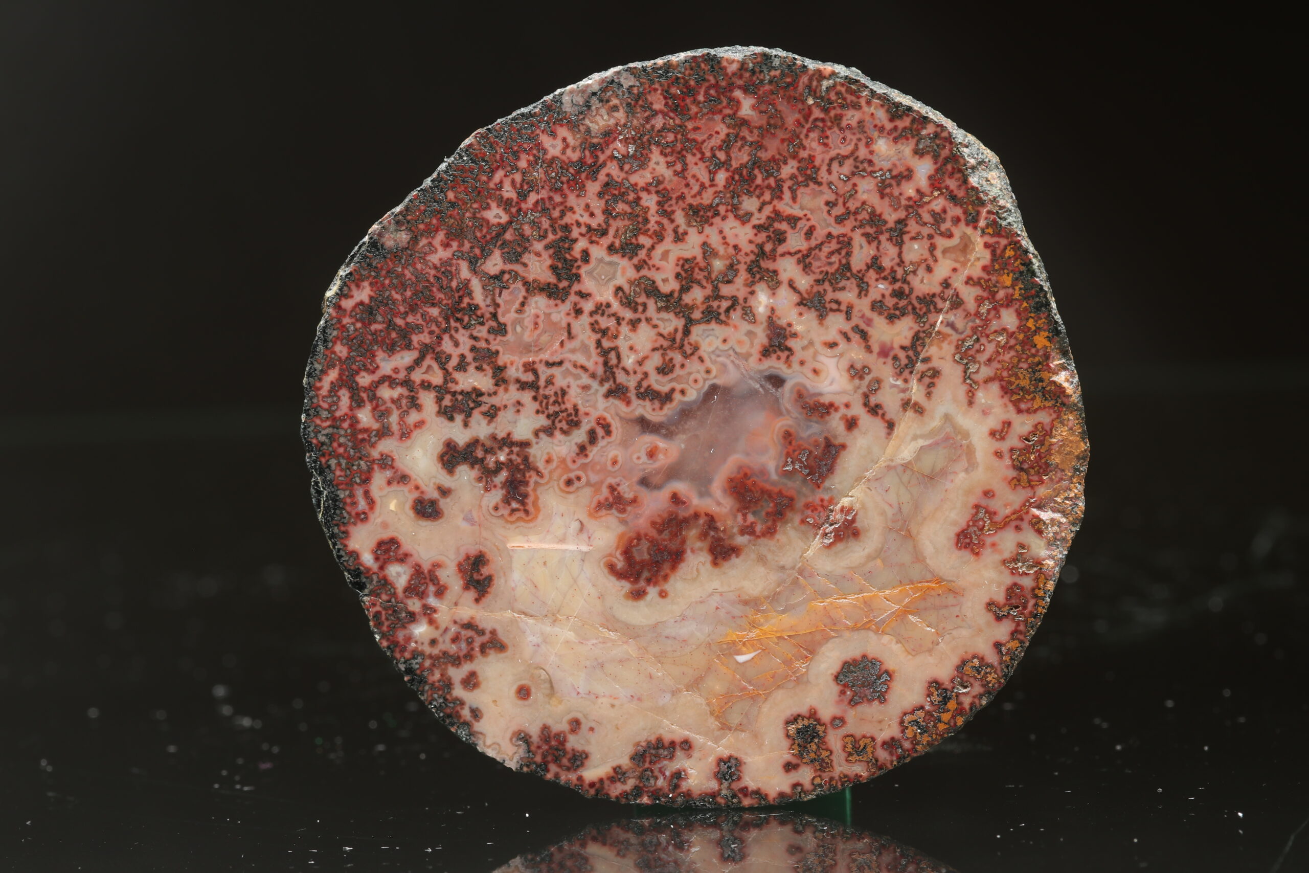 Sample of agate from the Zaječov locality. The specimen has an interesting pattern and a circular shape. One side of the specimen is polished.
