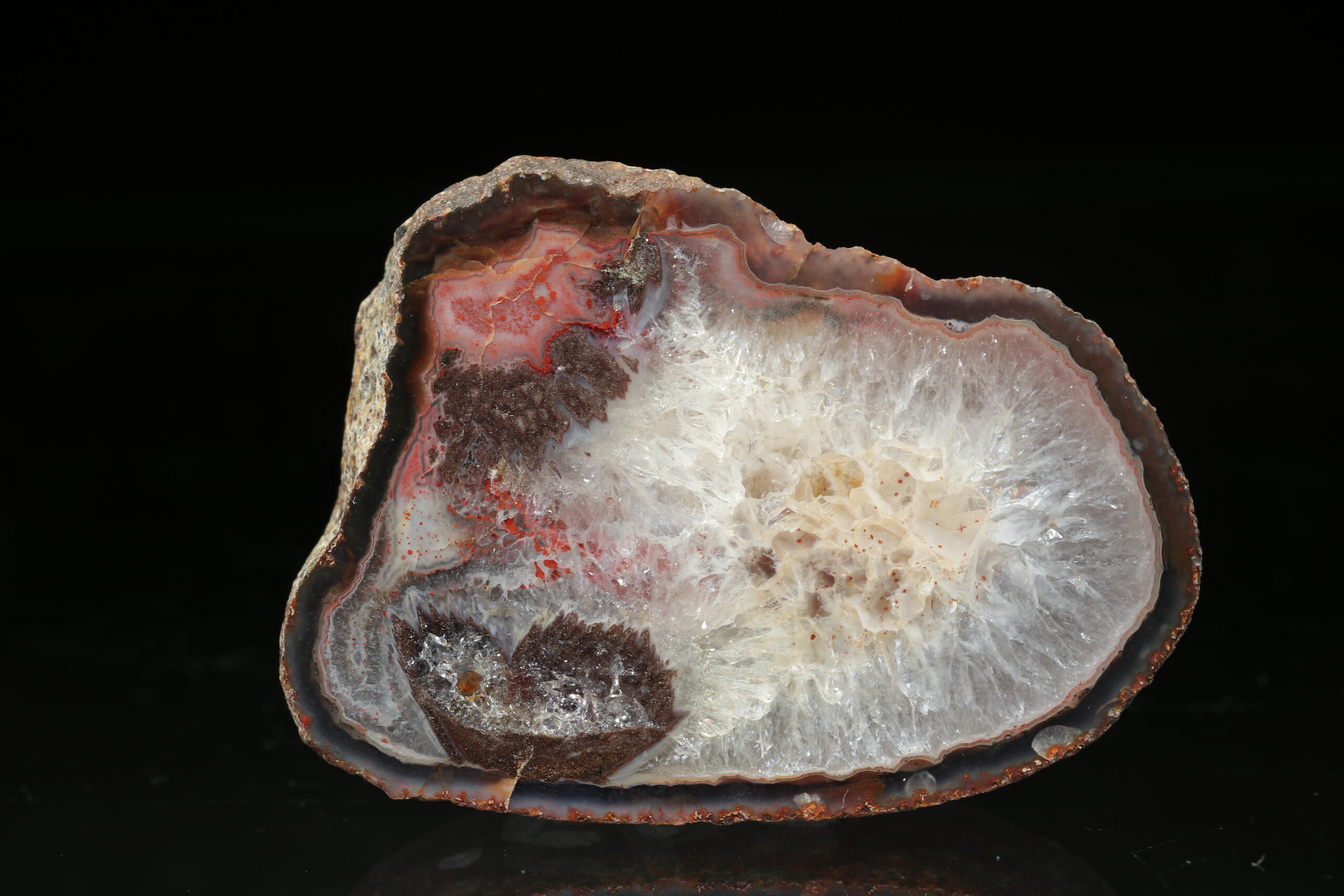 Polished agate nodule, which is polished on one side. The agate is perfectly bounded. The sample stands on a base without a stand, and crystalline quartz can be observed in the center of the pattern.