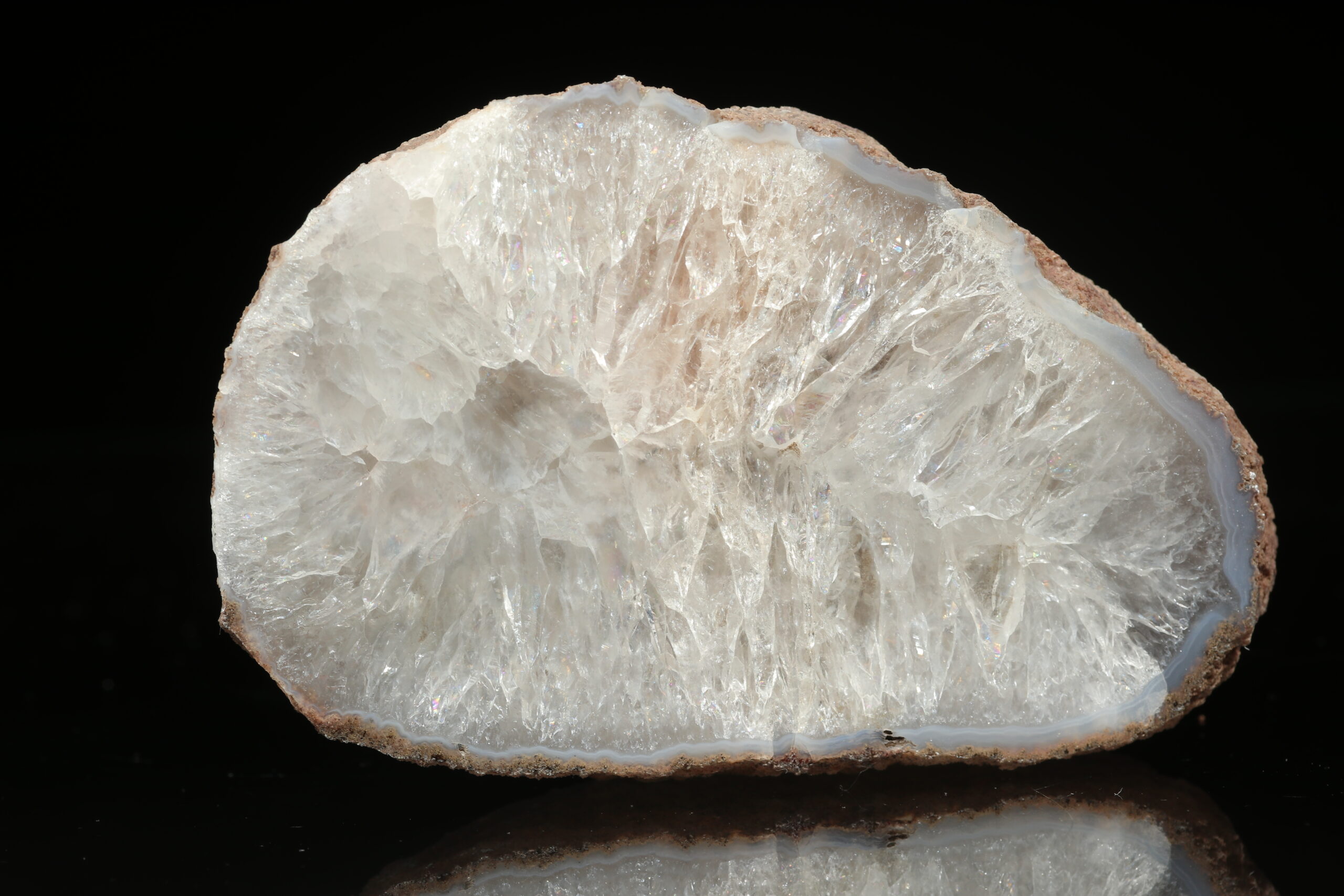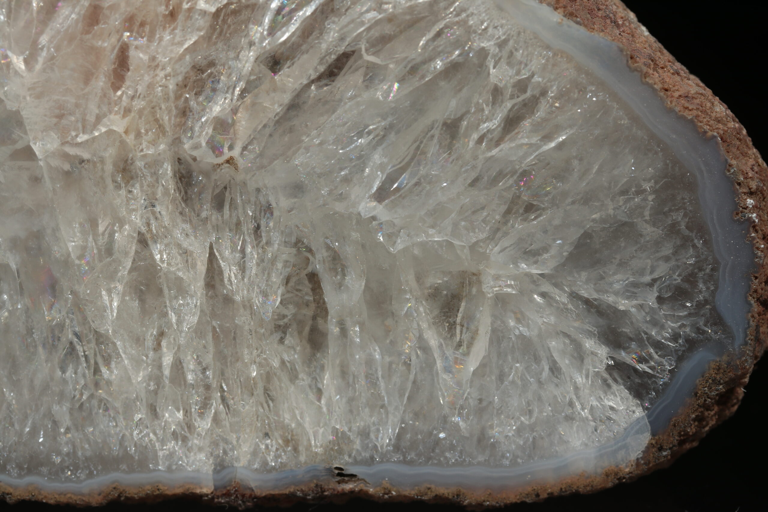 Quartz core, which is bordered by a bluish agate pattern. The sample was found in 1987. It is a complete half that is perfectly delimited.