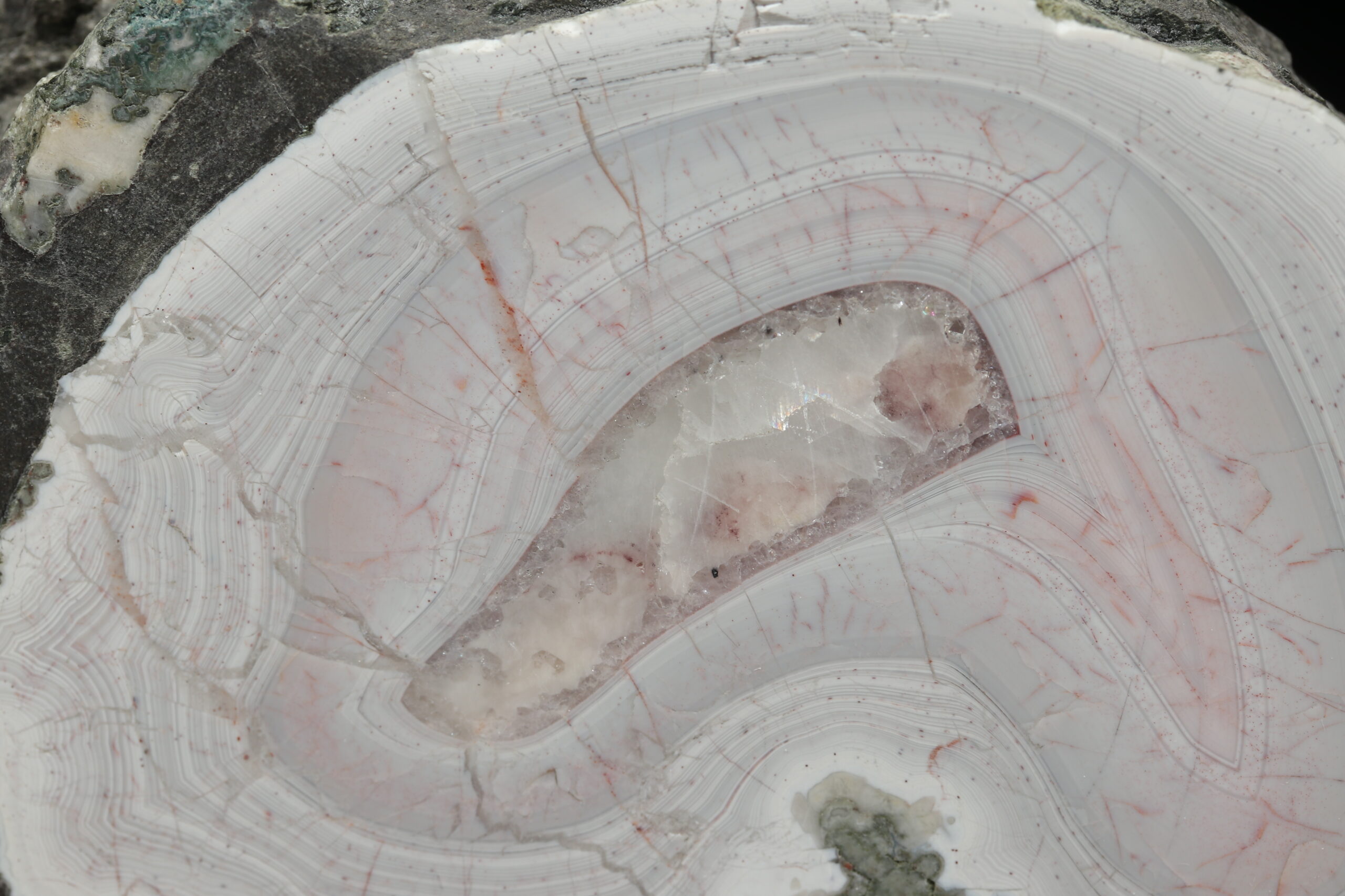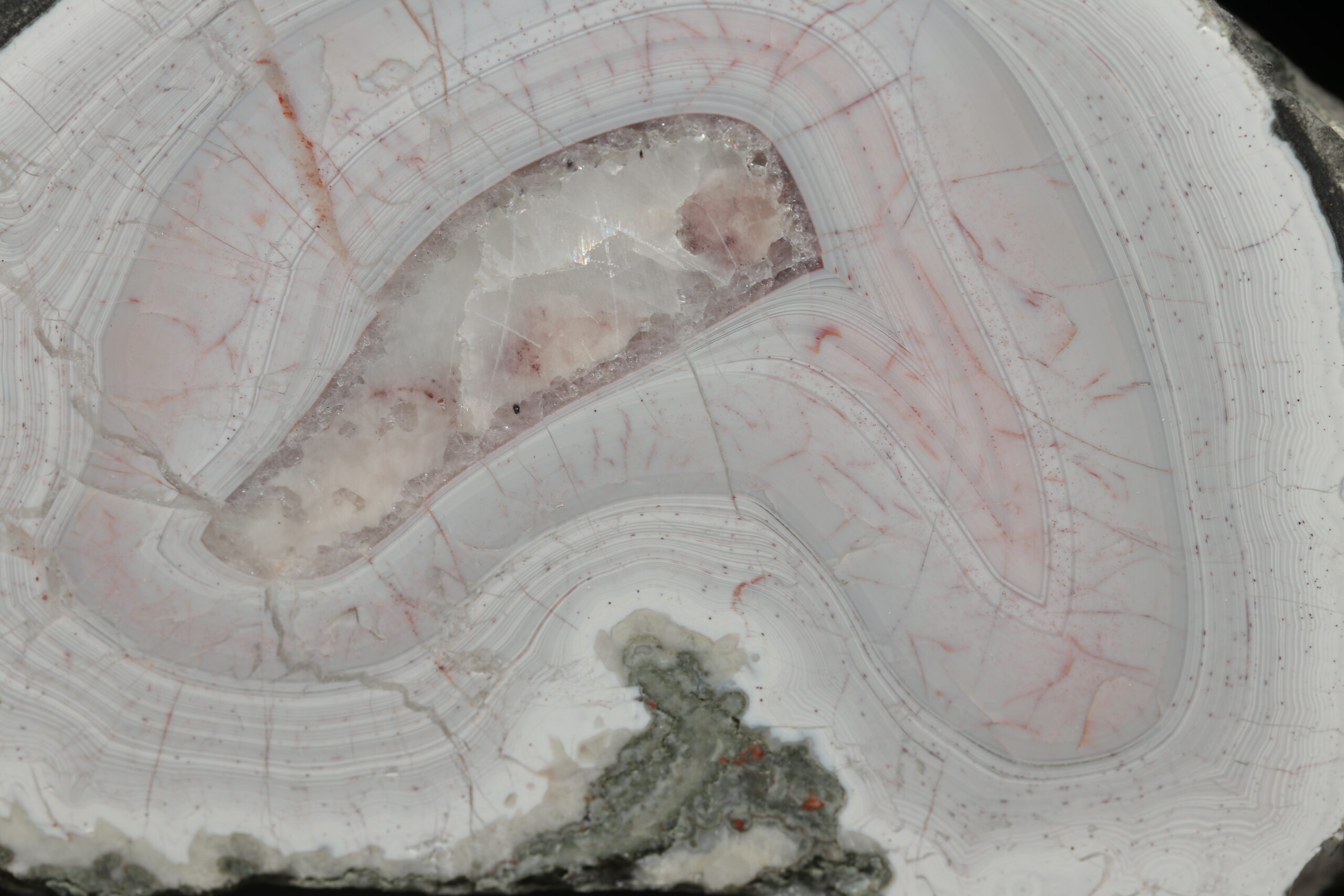 Long agate pit with interesting patterns. The pit is perfectly bordered and polished on the front side.