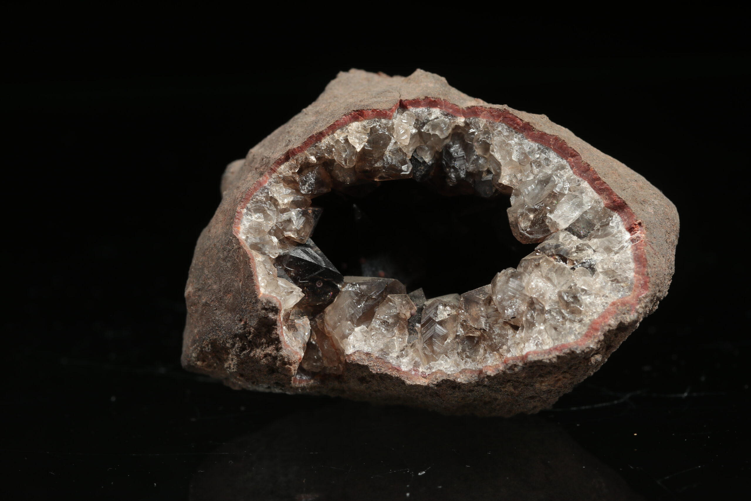 Quartz geode with agate patterns. The cavity of the geode is filled with amethyst crystals.