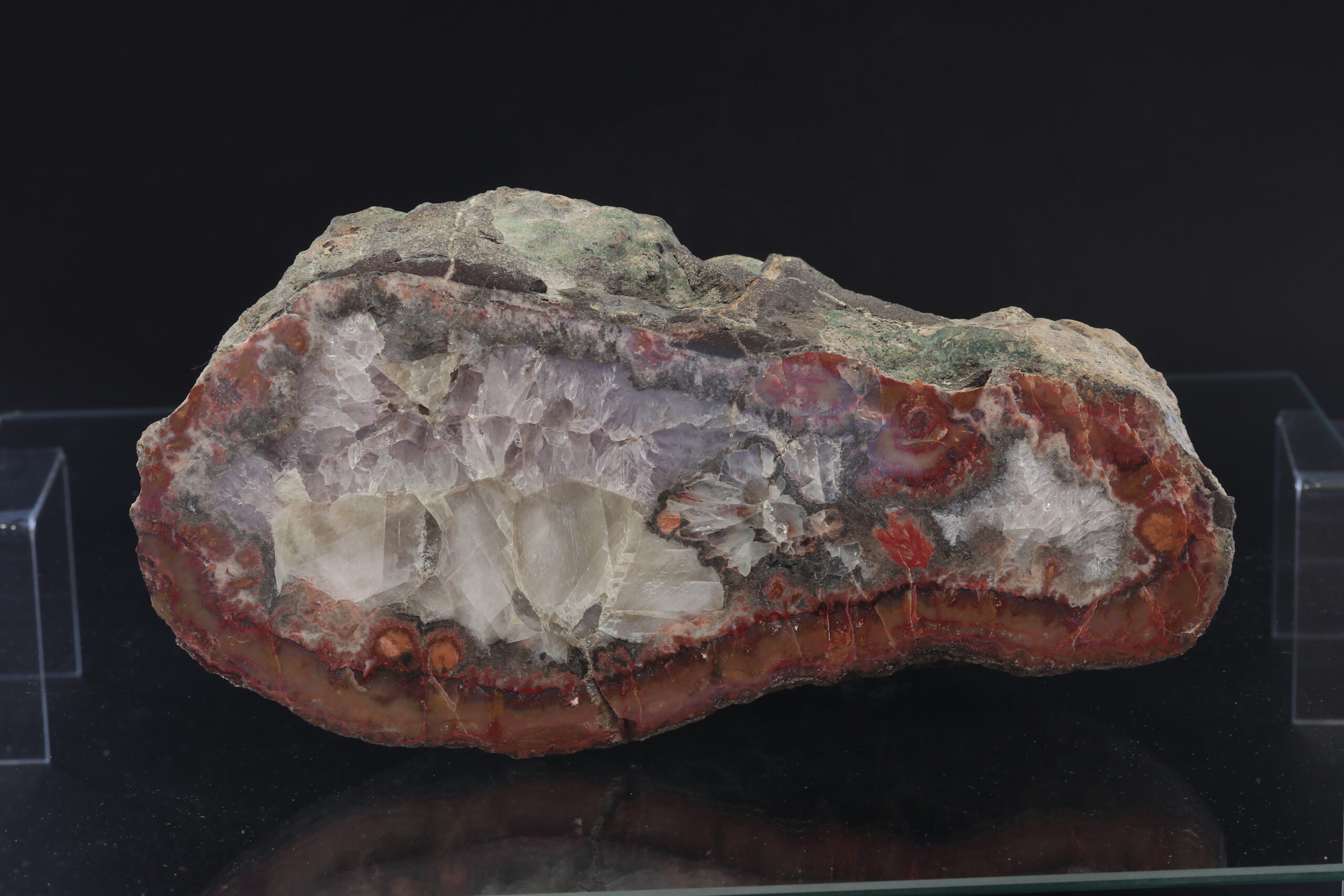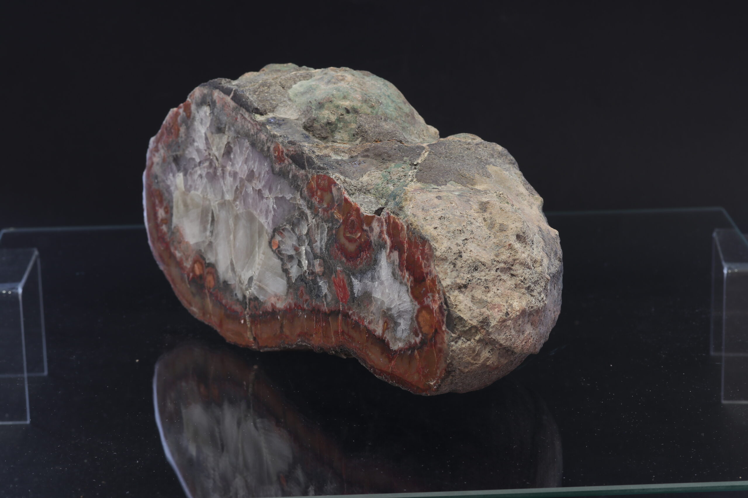 An exceptionally large agate from the Železnice locality. The specimen stands out for its lustre, perfect shape, and varied pattern. The specimen is glued together from two parts. The specimen was found in 1999 .