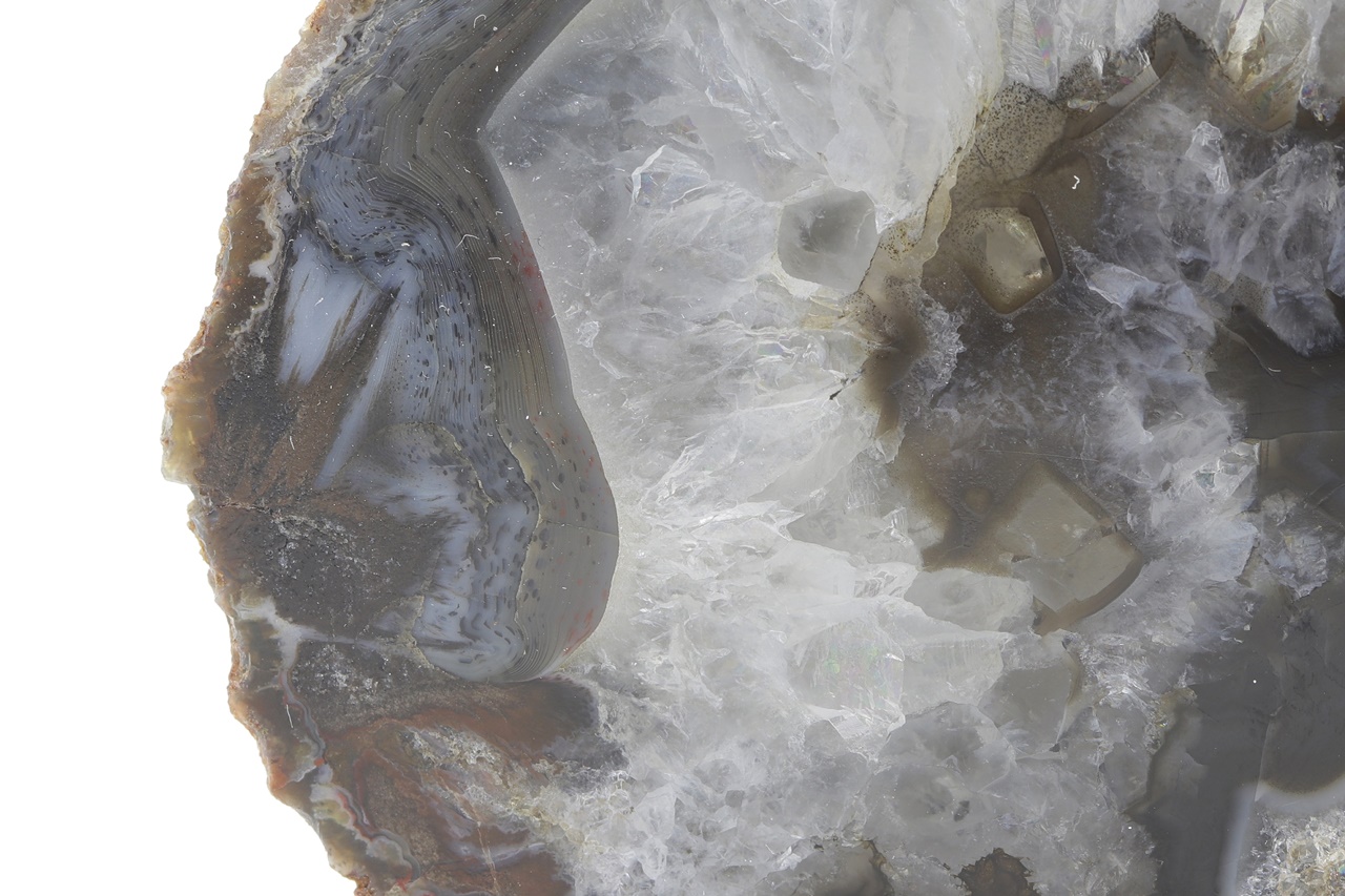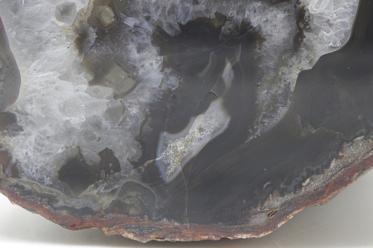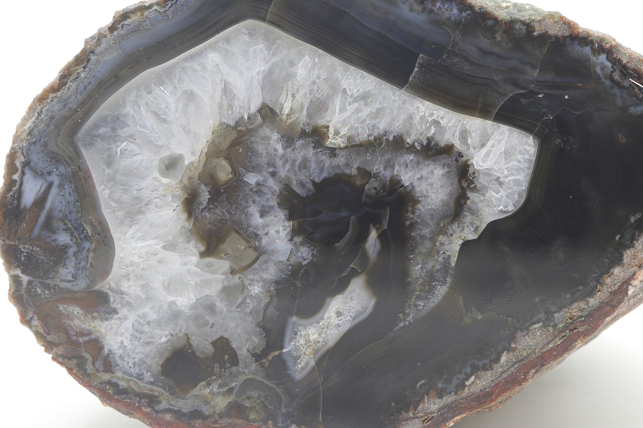 Polished sample of dark agate with a light crystal rim.