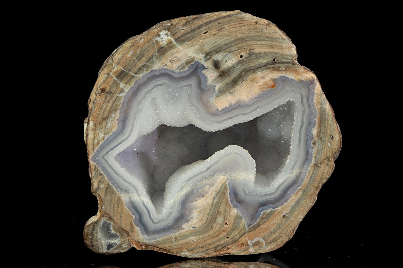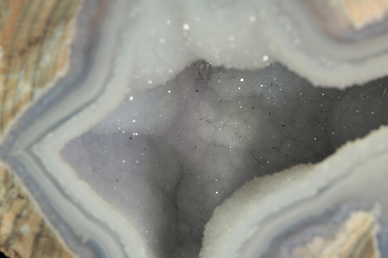 Striped agate with a central cavity filled with small quartz crystals .