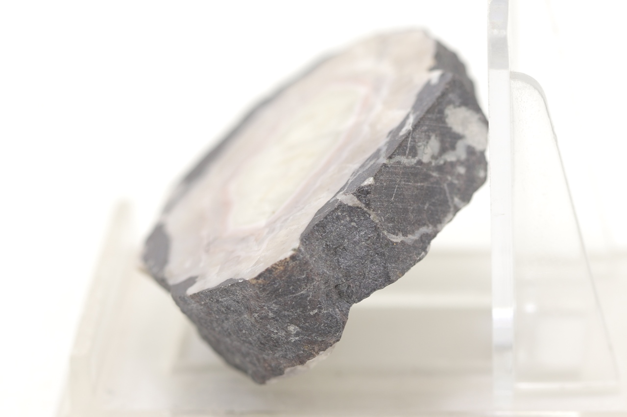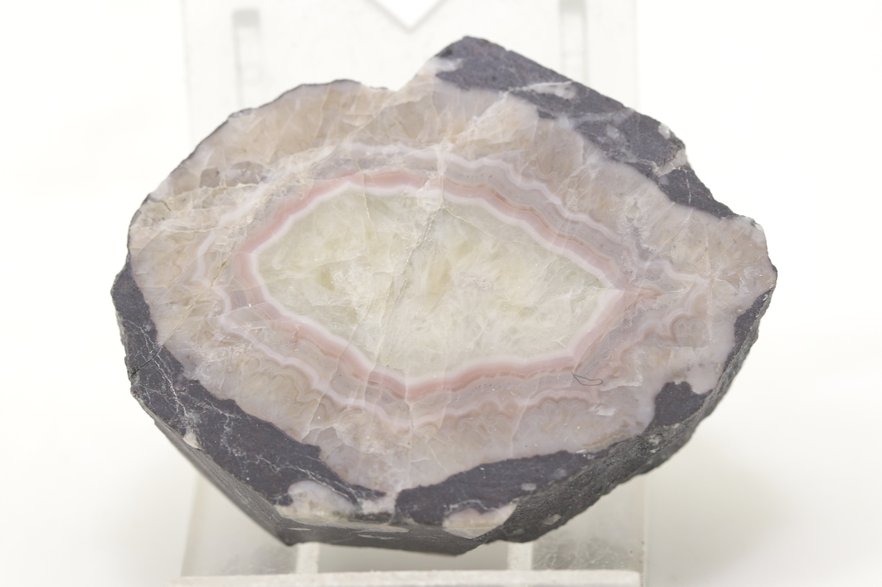 A nice example of a light-colored agate. The color changes from light brown to light pink away from the dark parent rock. This trend is interrupted by a light white layer. The core is yellowish-white. The sample is cut at two places on the perimeter.