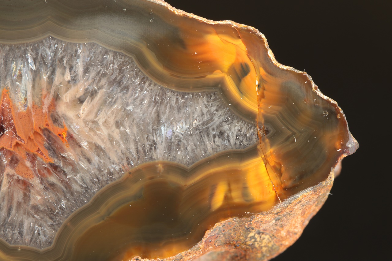 A polished specimen of Argentinian agate from the locality known as “Condor agate”. The specimen glows under UV light .