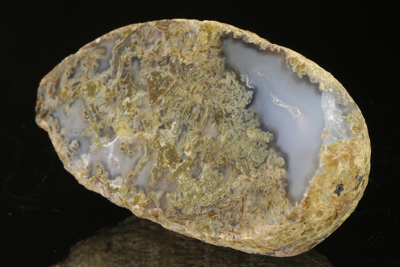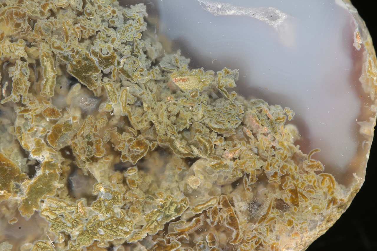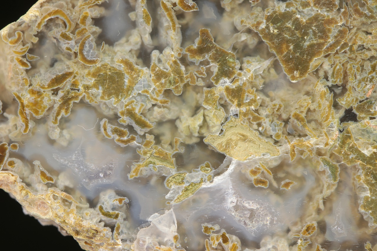 Ochre to green jasper bands embedded in partially transparent agate from the renowned agate locality.