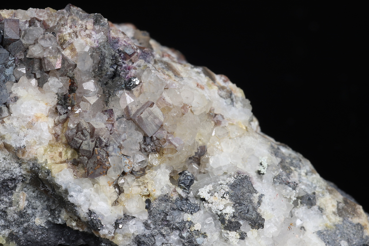 Silver-gray aggregates and irregular crystals of acanthite up to 3-4 mm in size along with cubic crystals of fluorite and crystals of quartz. A sample of silver sulfide on a fluorite-quartz vein from the Moldava mine.