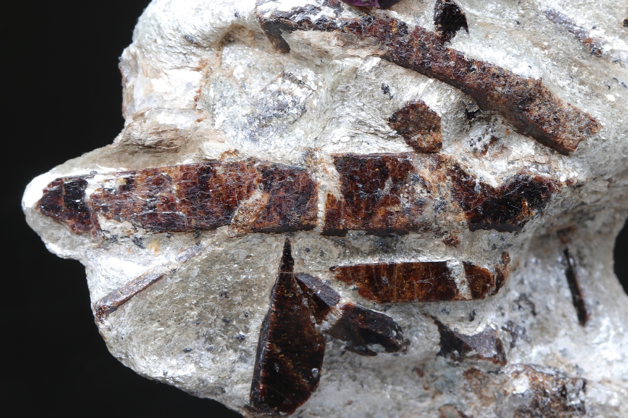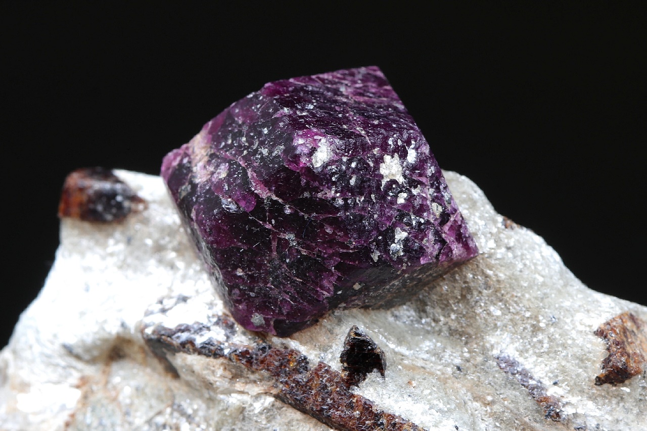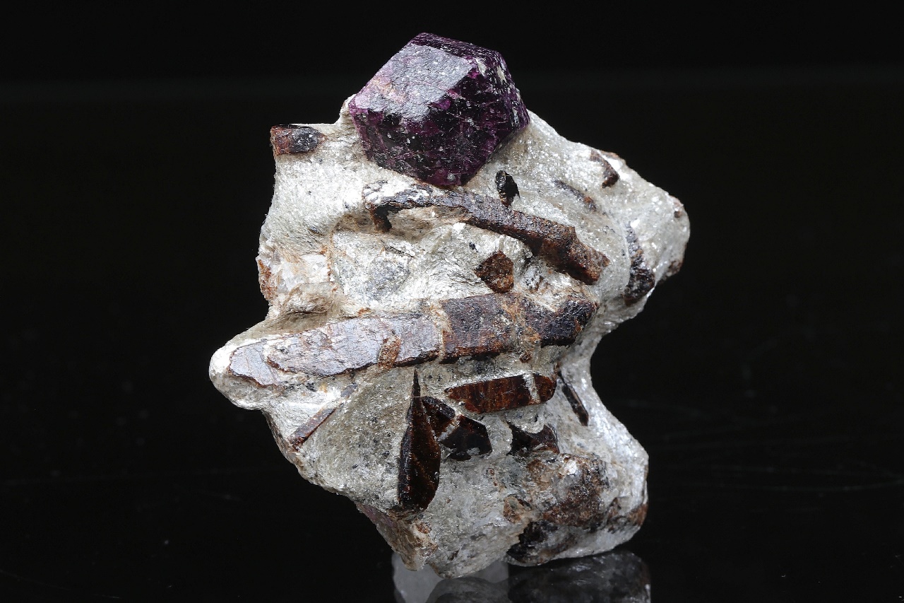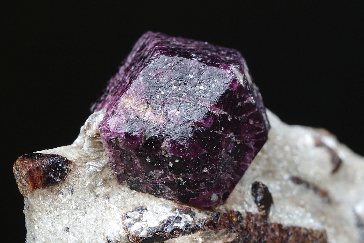 A dark purple almandine crystal (23 mm in size) with crystals of shiny staurolite. The largest crystal is 4.5 cm in size.
