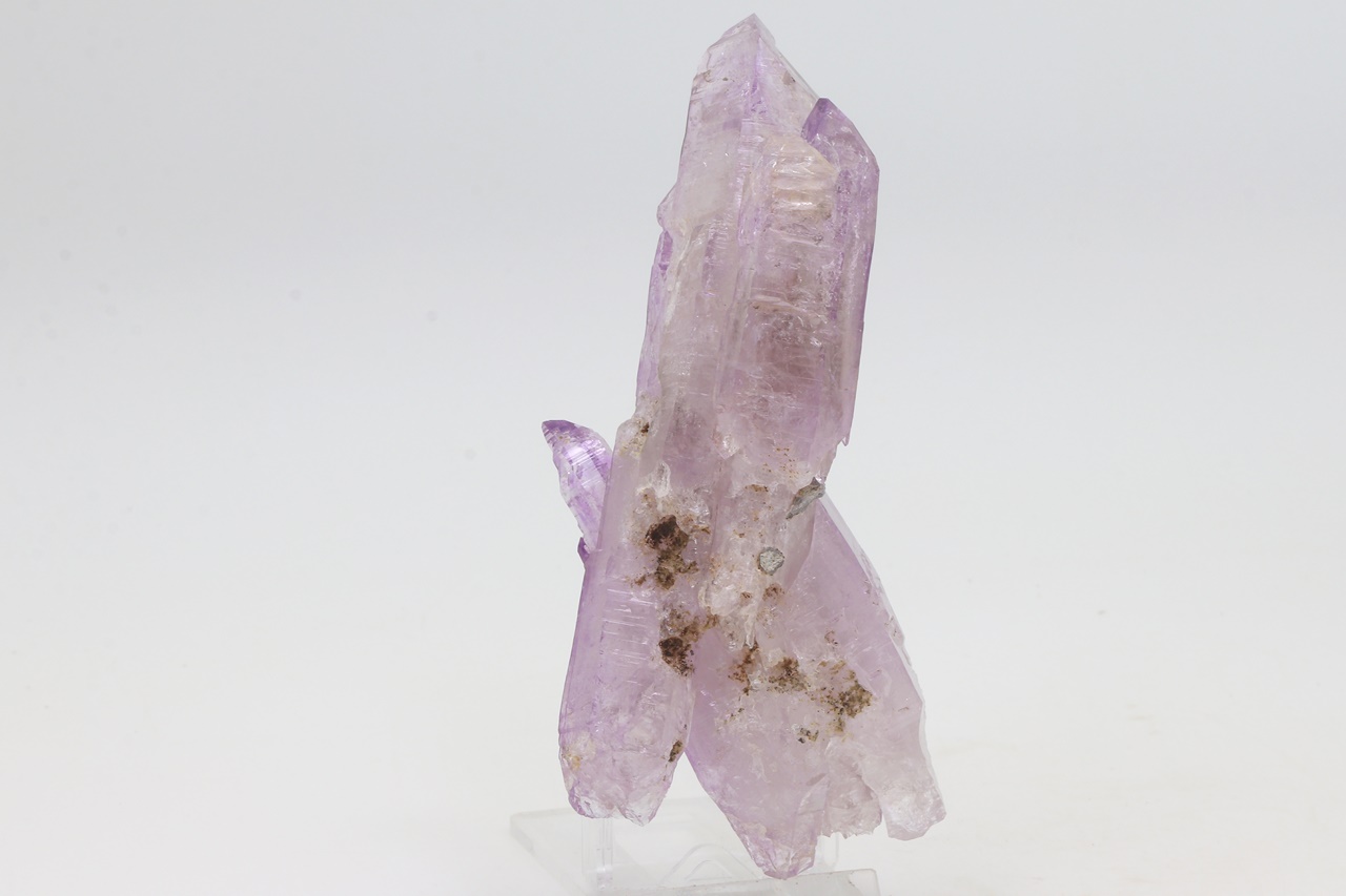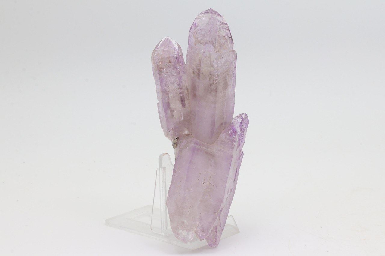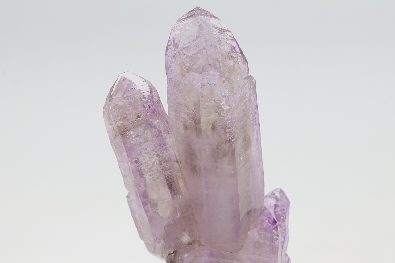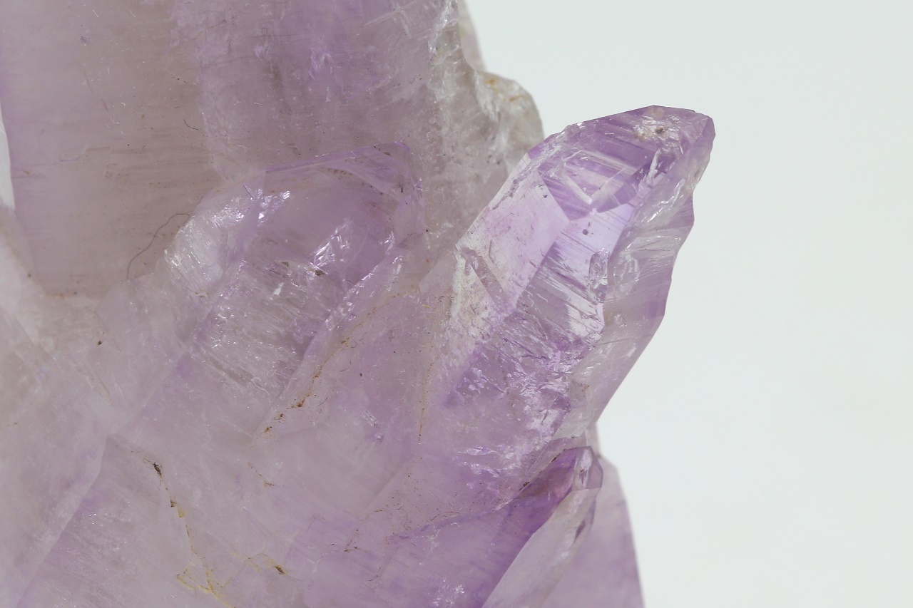 Cluster of large amethyst crystals from a well-known locality. The largest crystal has a skeletal development at the top and is 12.5 cm long.