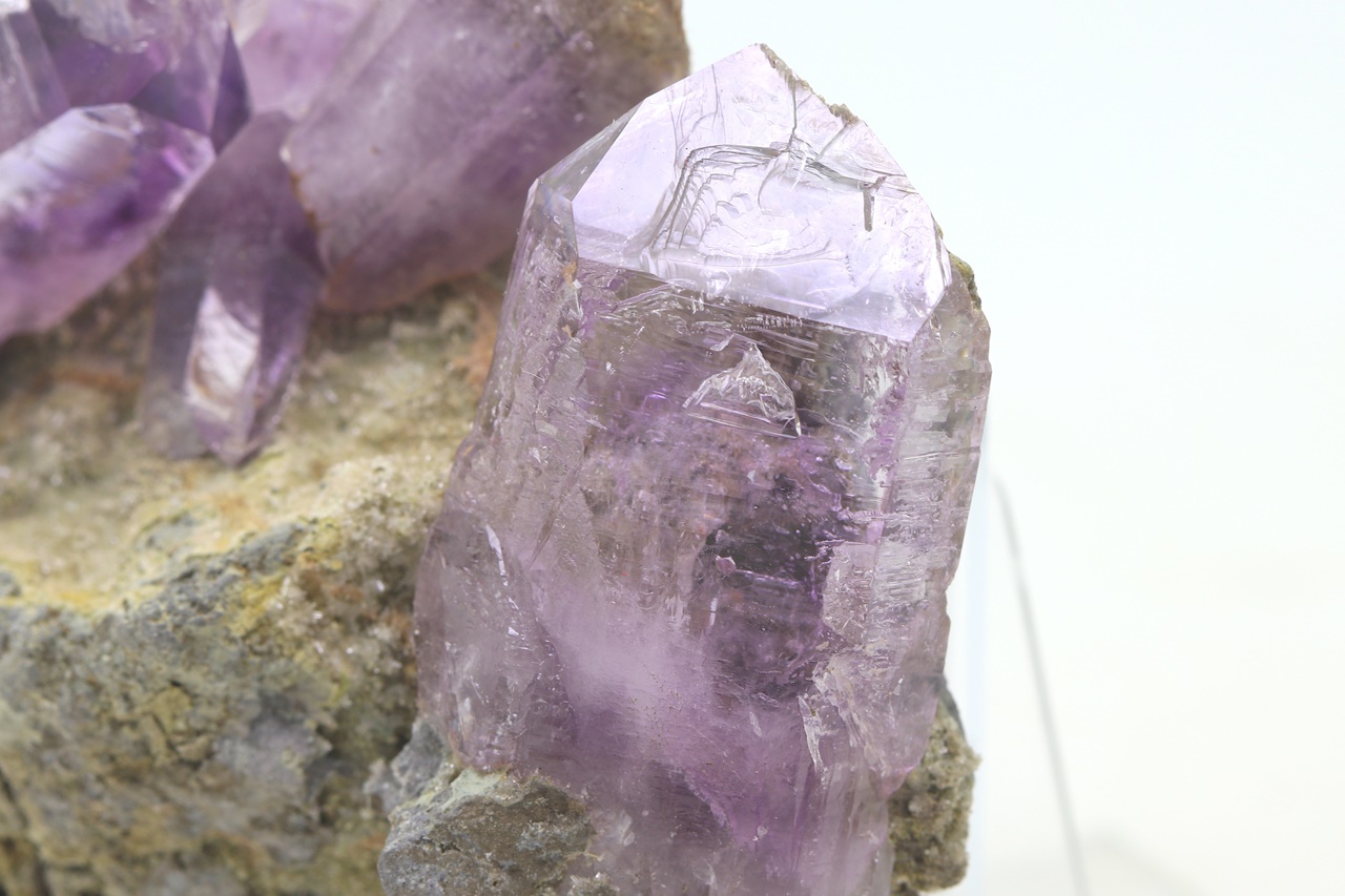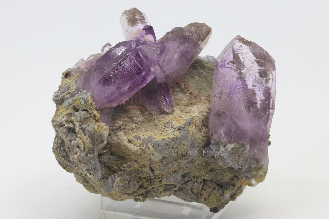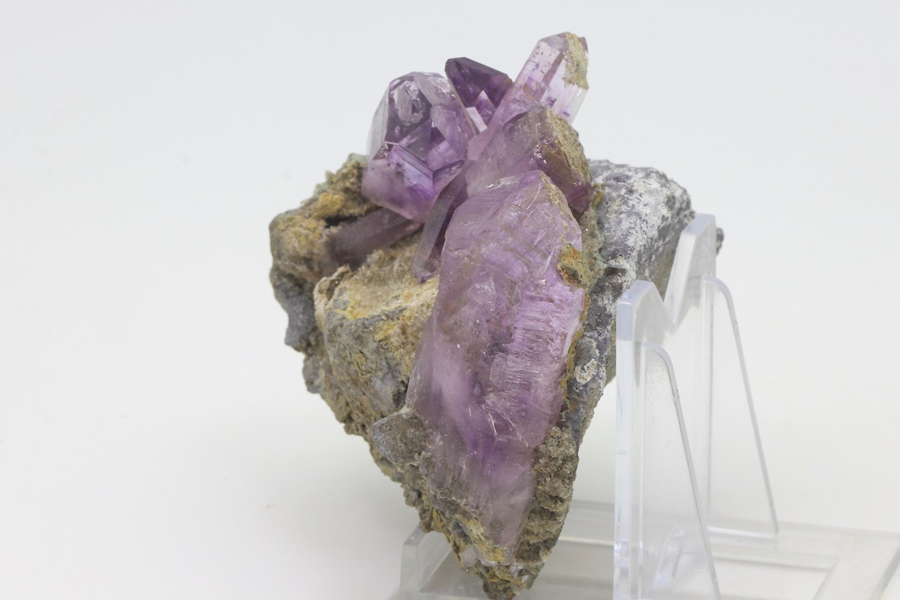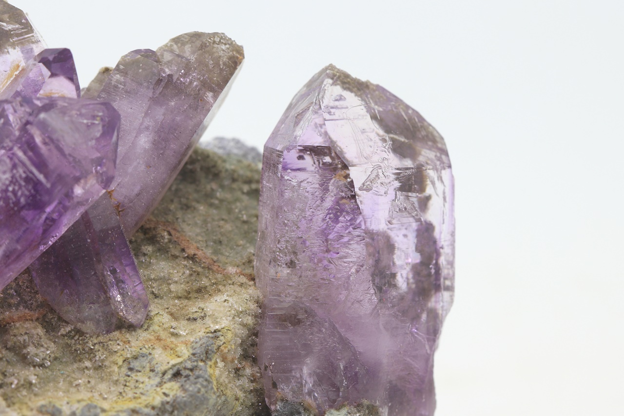 A beautiful specimen of pure, shiny amethyst crystals grown on a base. The largest crystal on the left side of the specimen is 5 cm big.