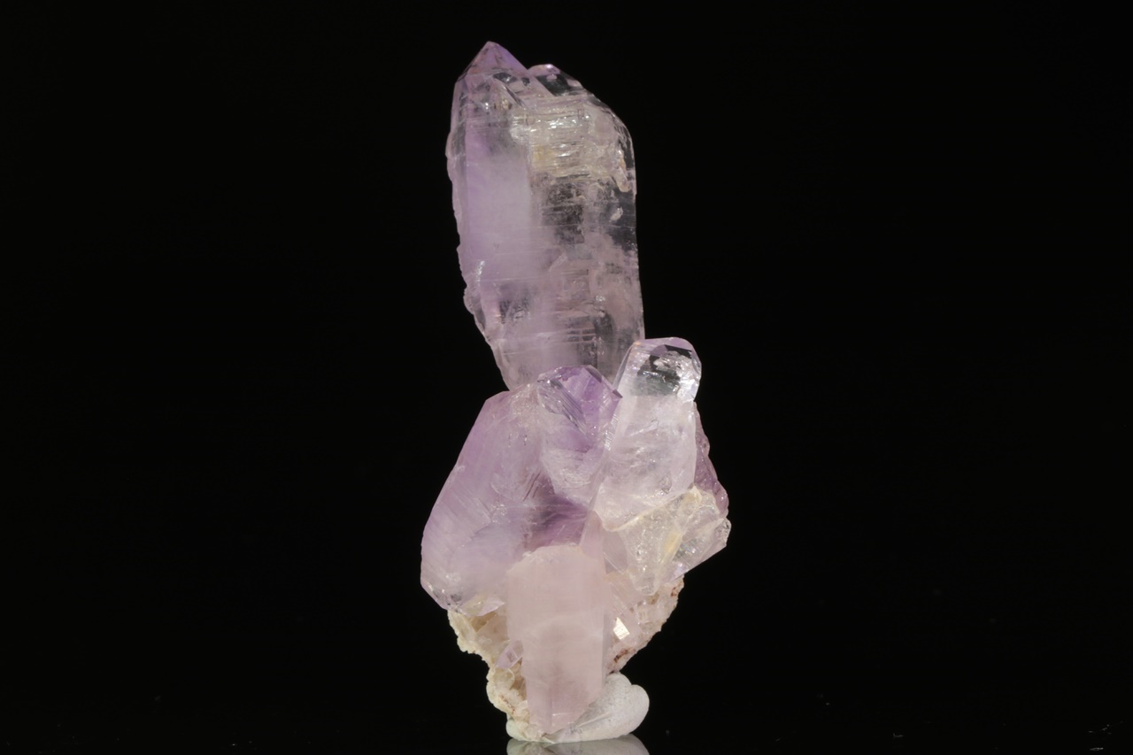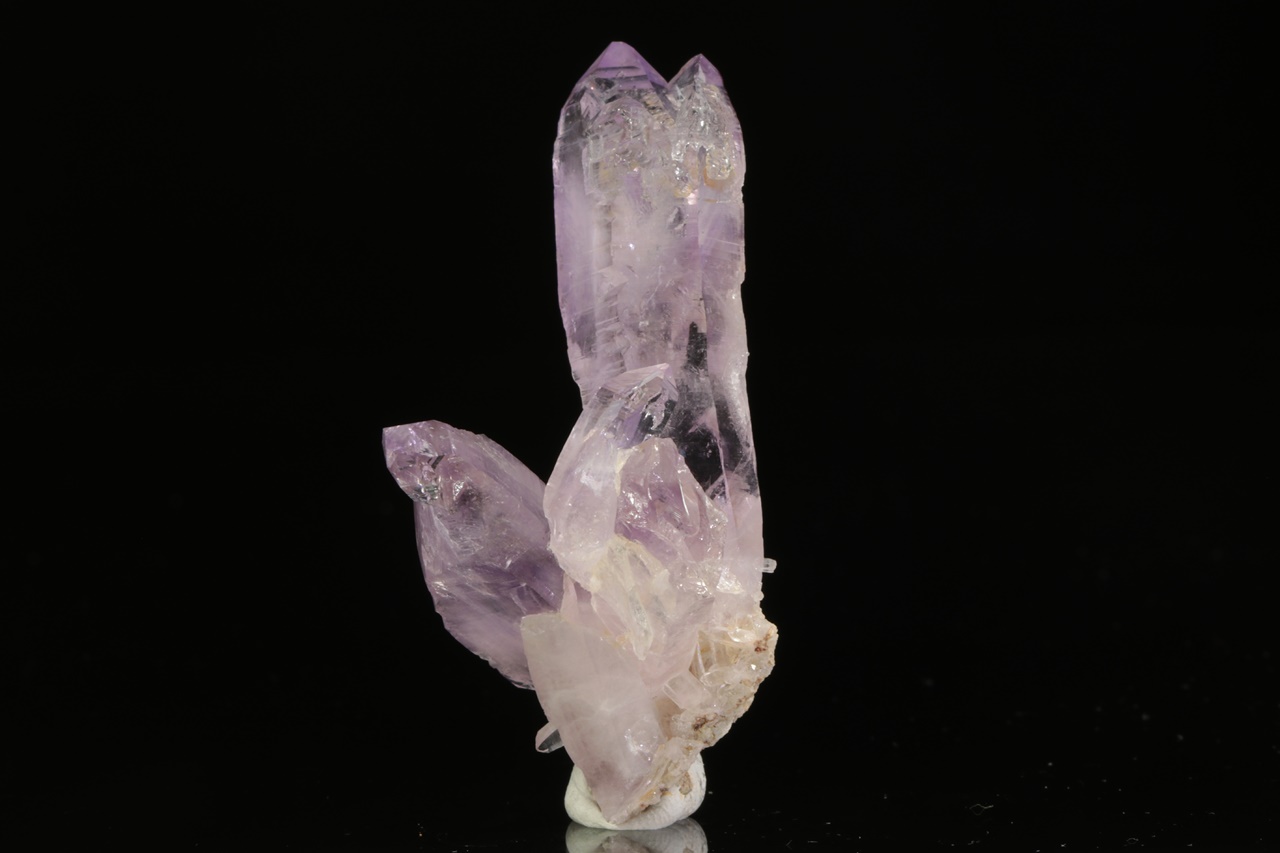 Amethyst crystal clusters with a pale purple hue, where a 5 cm long crystal forms a skeletal scepter.