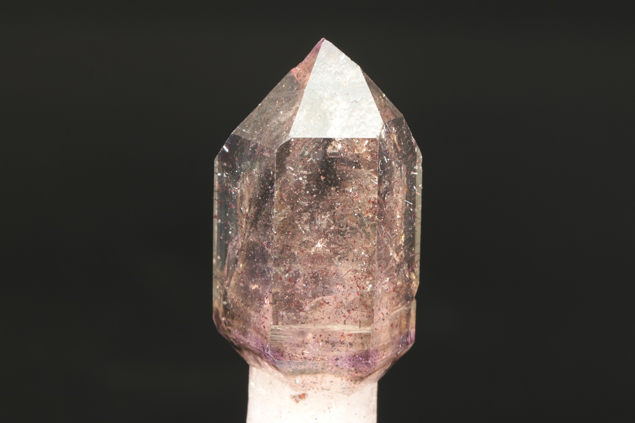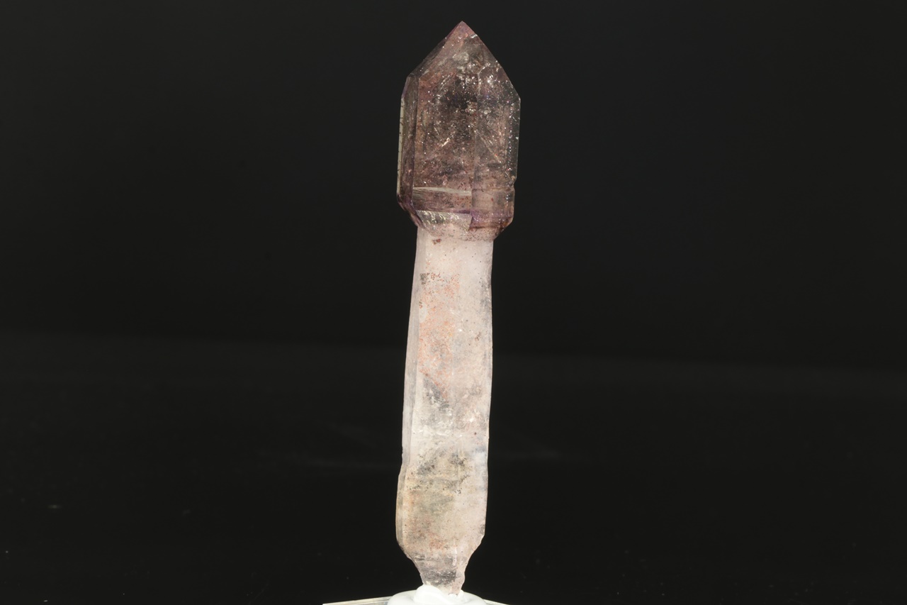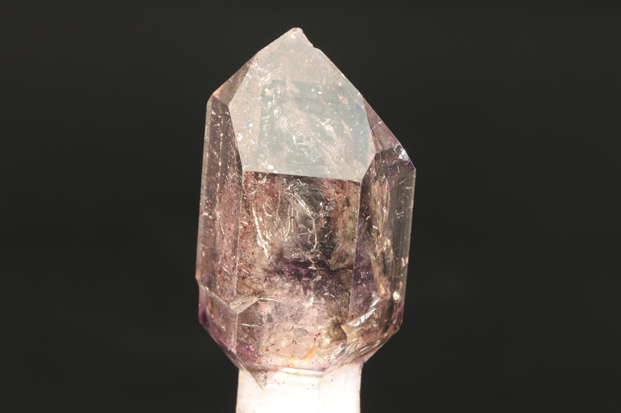 A double-terminated quartz crystal with a translucent “amethyst scepter” with inclusions of goethite. The scepter measures 4 × 2.5 cm, the tip of the amethyst is slightly damaged.