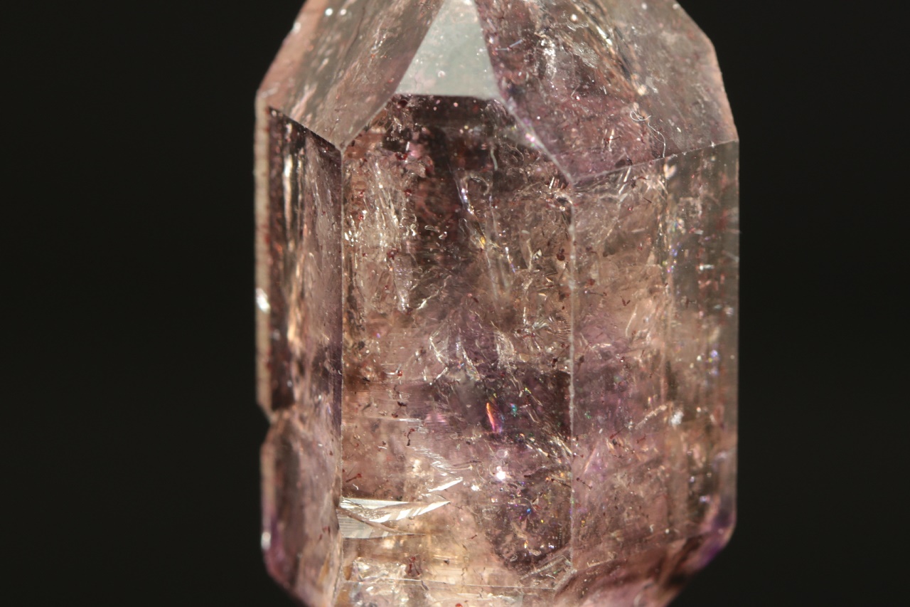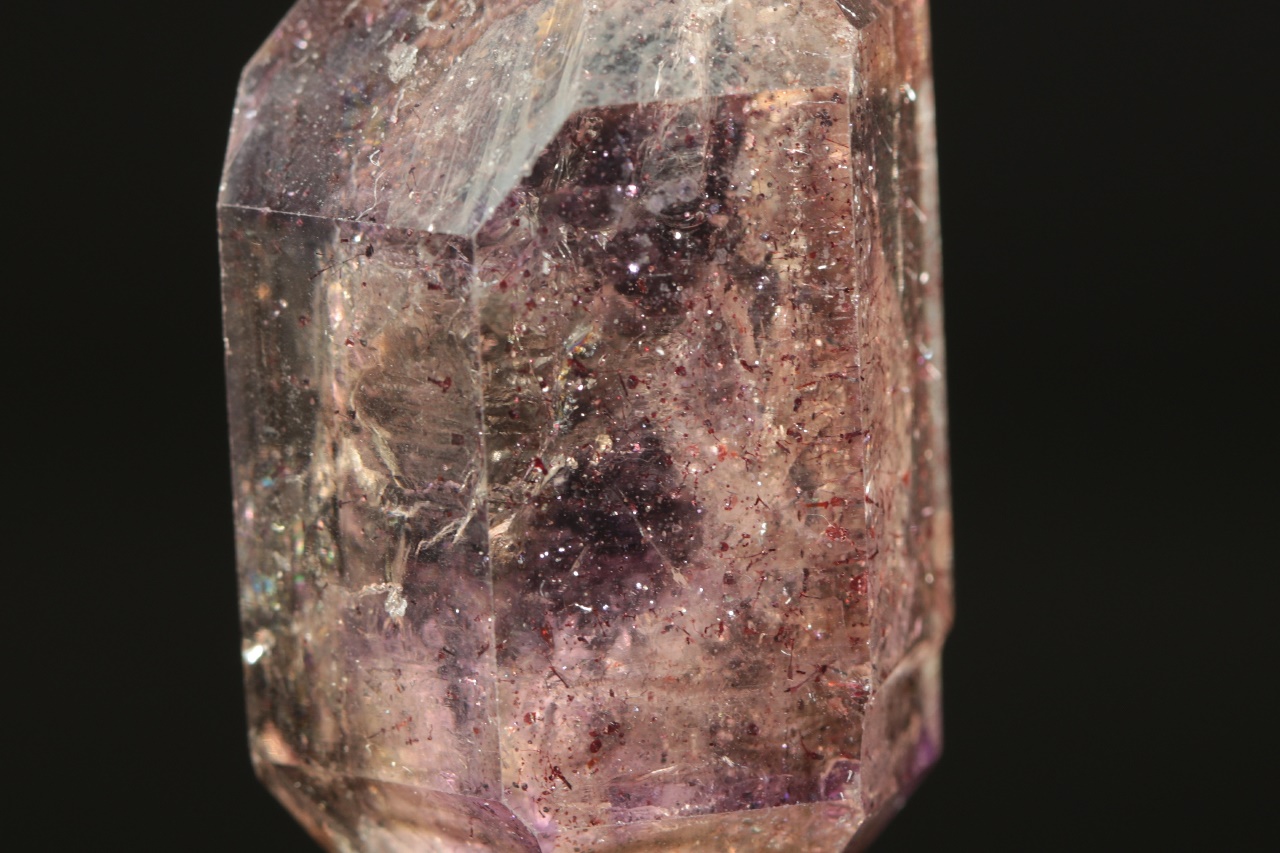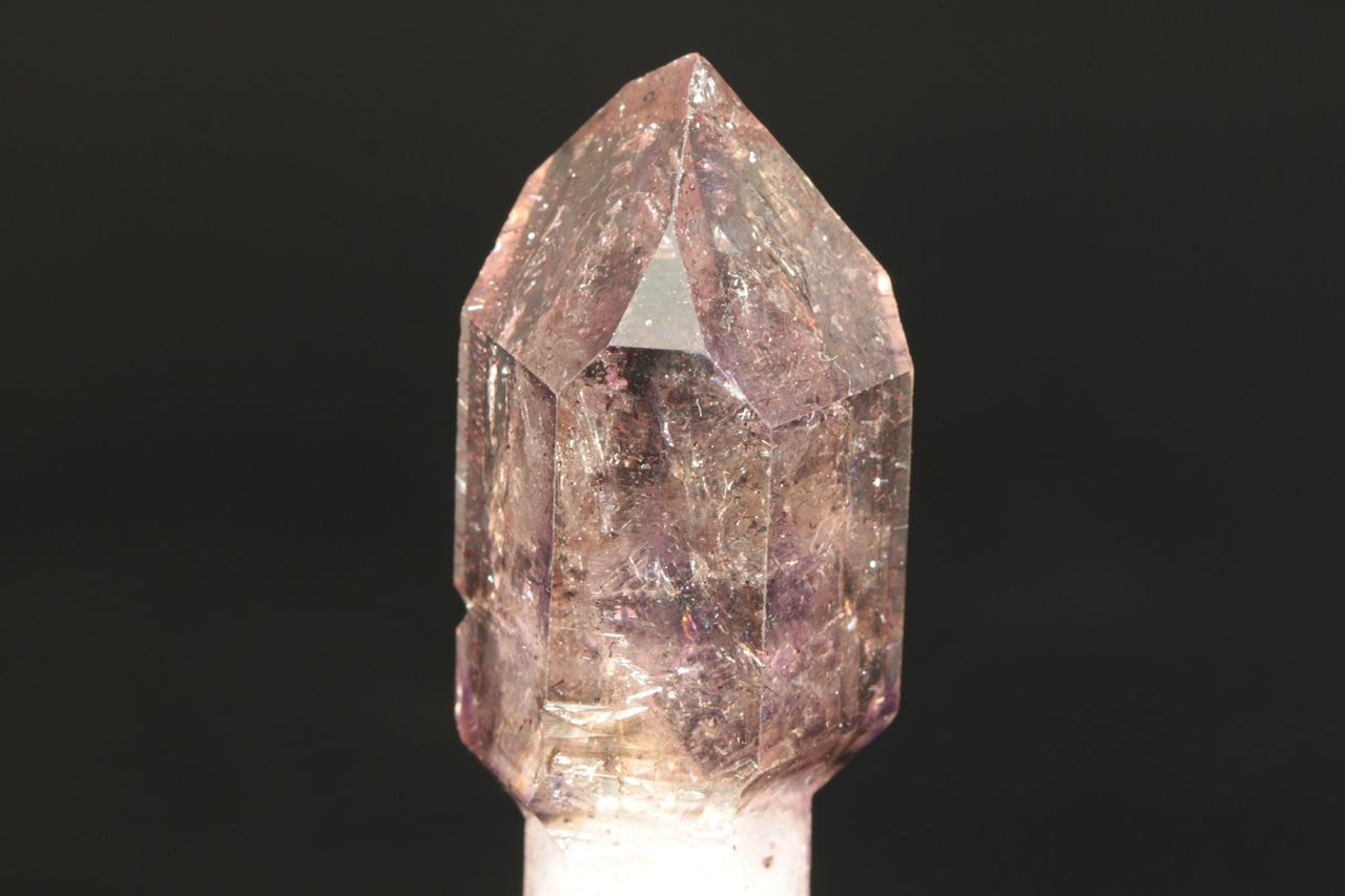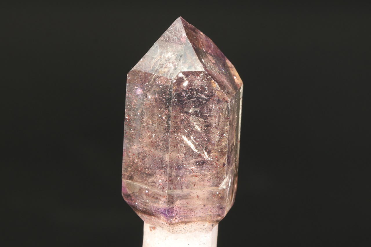 A double-terminated quartz crystal with a translucent “amethyst scepter” with inclusions of goethite. The scepter measures 4 × 2.5 cm, the tip of the amethyst is slightly damaged.