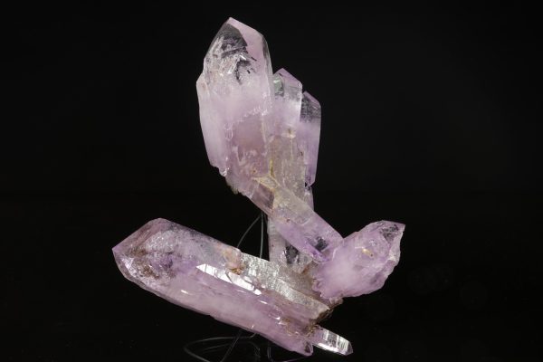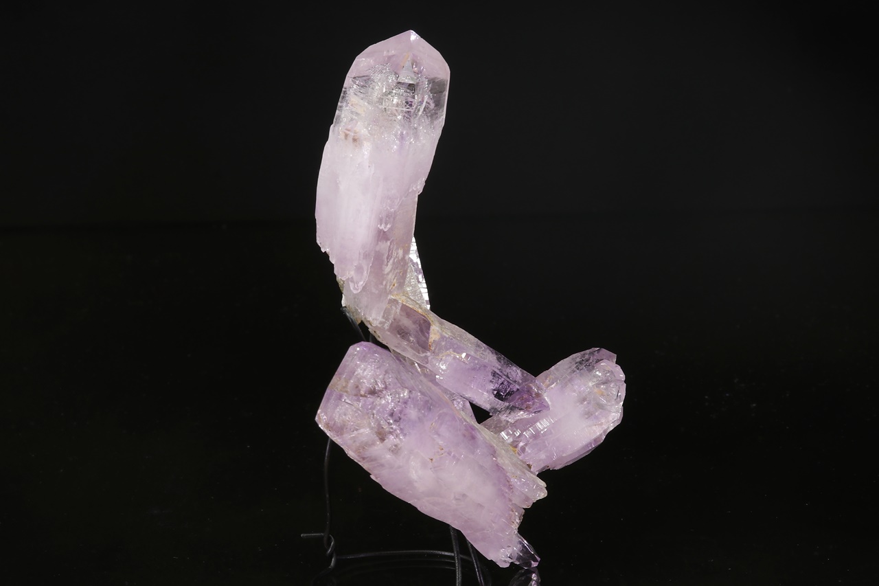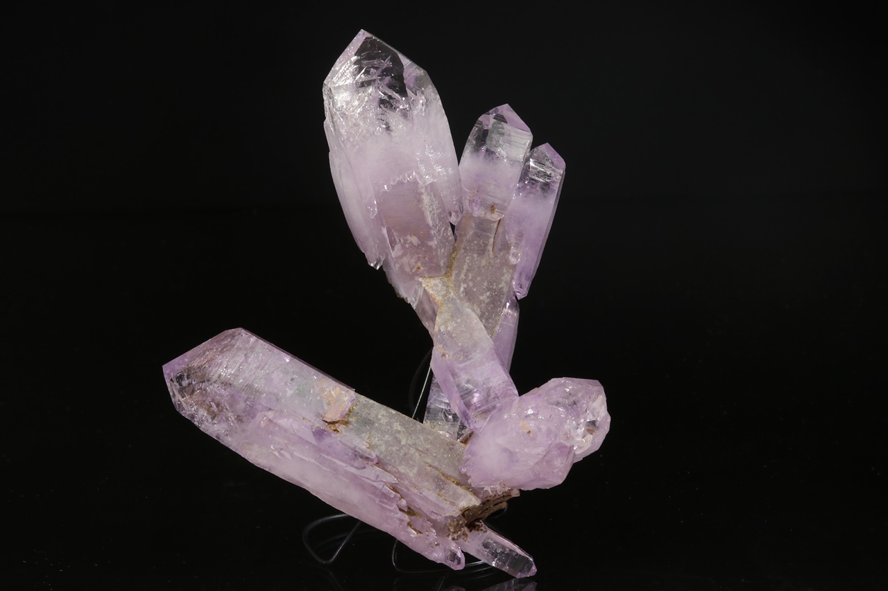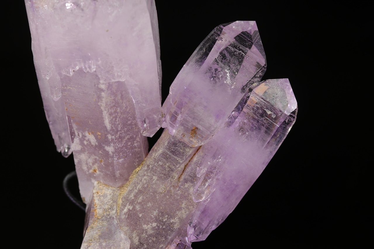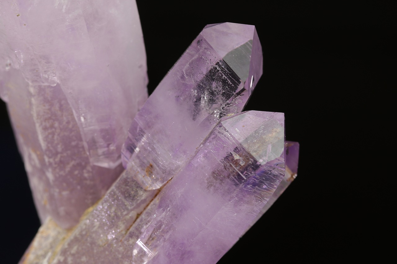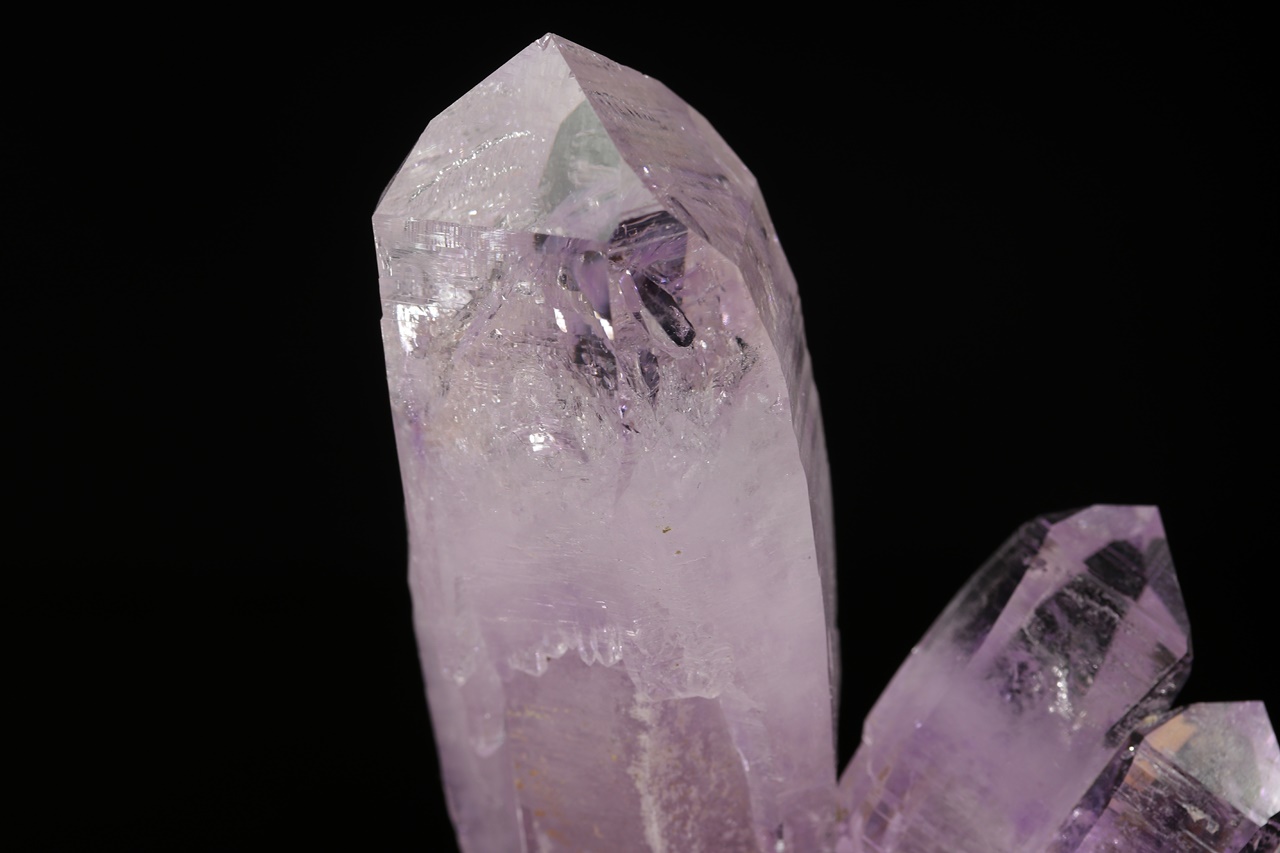 Beautiful cluster of perfect, clear amethyst crystals. The two largest crystals have visible phantom faces. The upper larger crystal is 8 cm in size, the lower crystal along with a healed smaller crystal measures 11.5 cm.