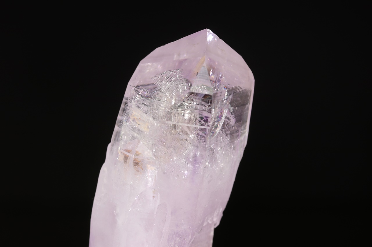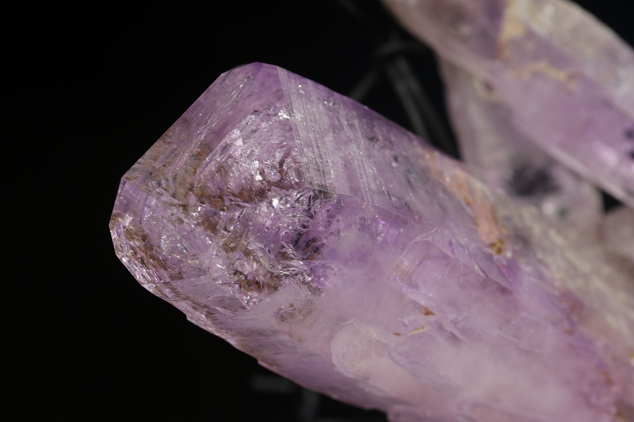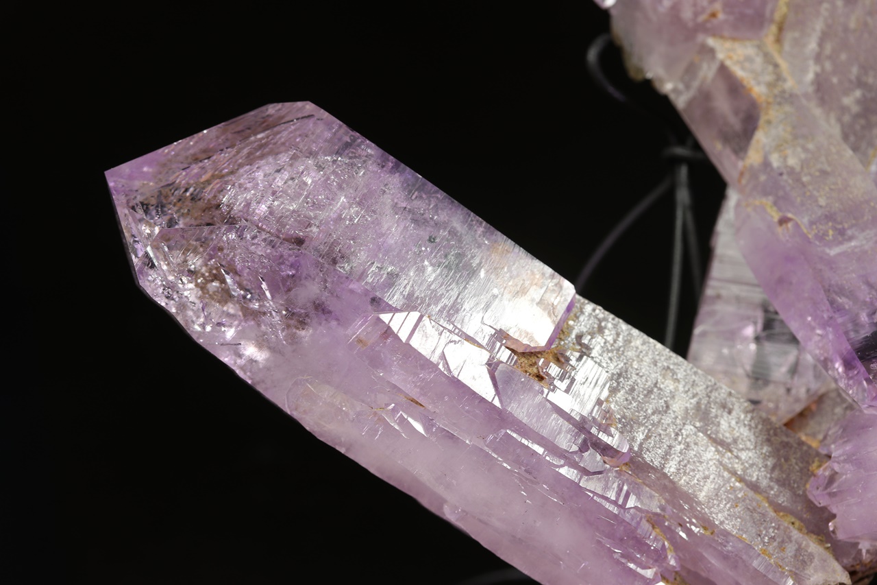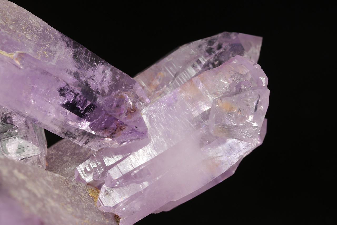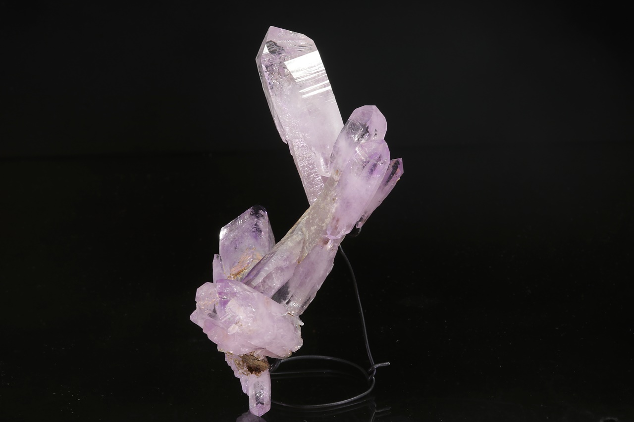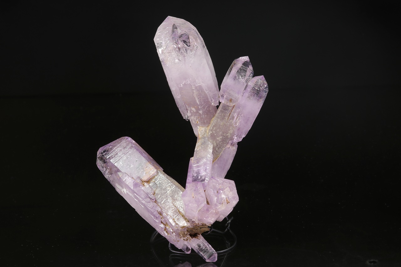 Beautiful cluster of perfect, clear amethyst crystals. The two largest crystals have visible phantom faces. The upper larger crystal is 8 cm in size, the lower crystal along with a healed smaller crystal measures 11.5 cm.