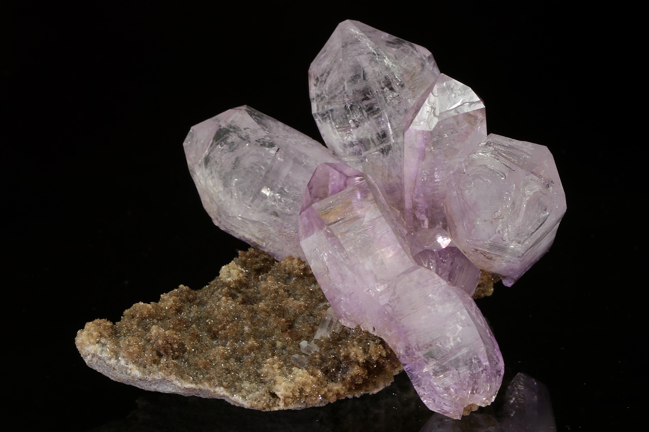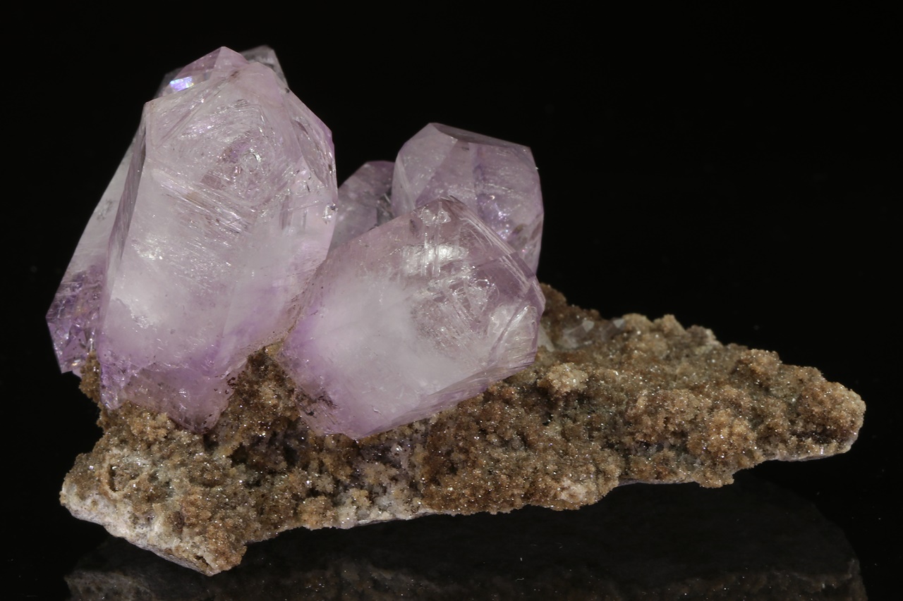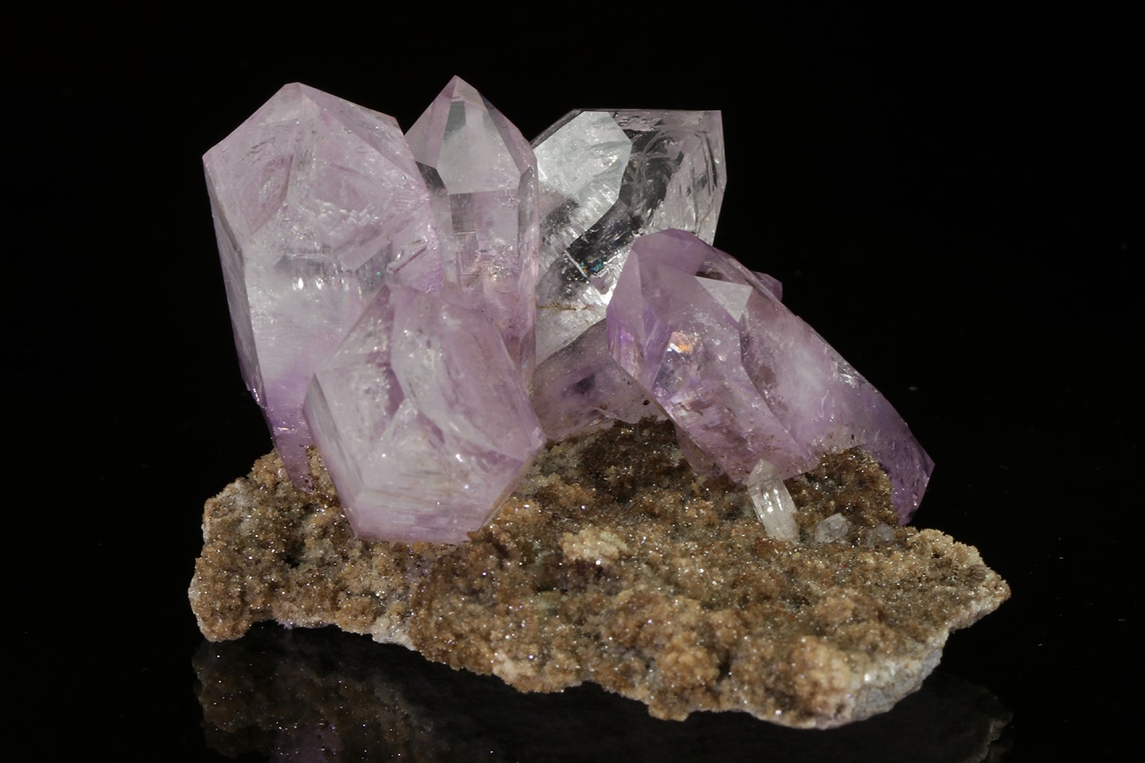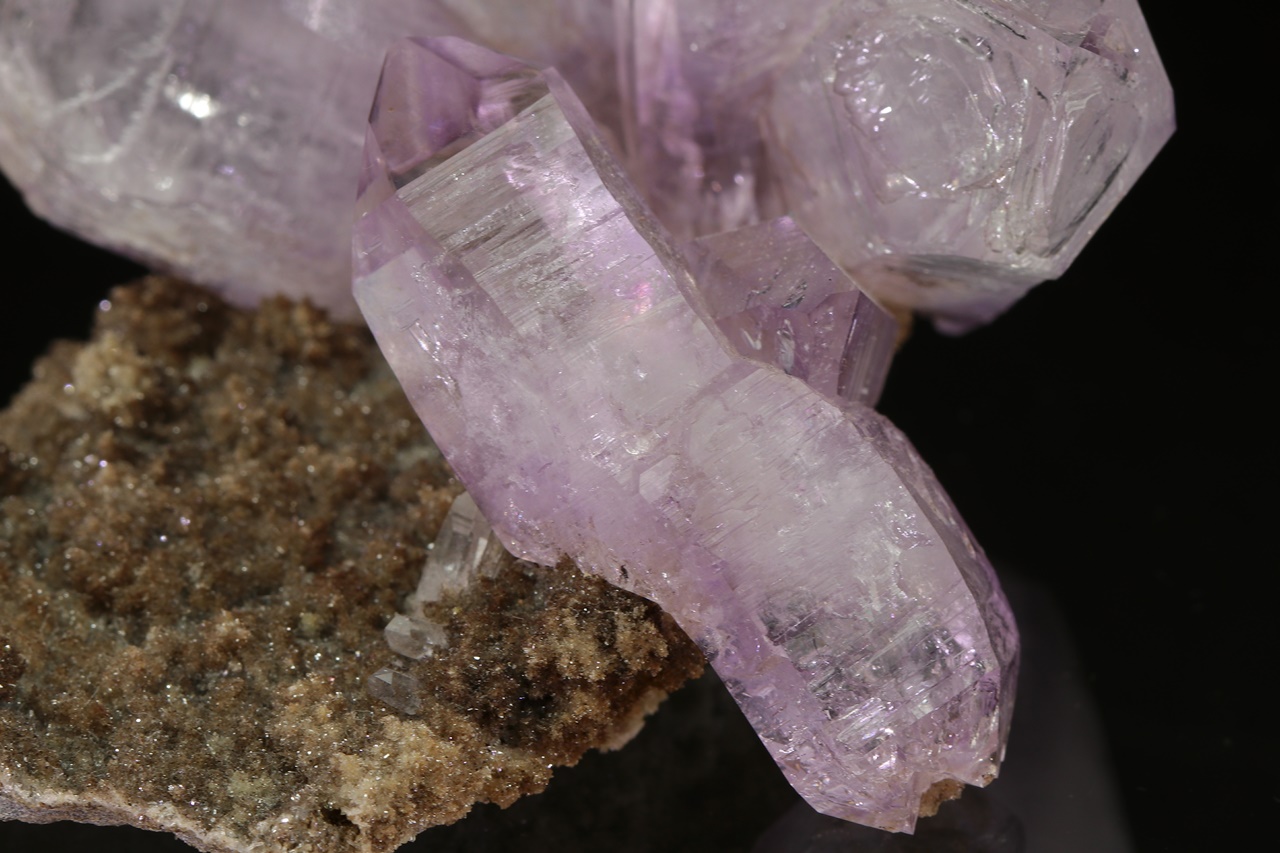Purple amethyst crystals have grown on the base. One of the amethysts contains a Goethite inclusion. The largest crystal is 4.5 cm in size.