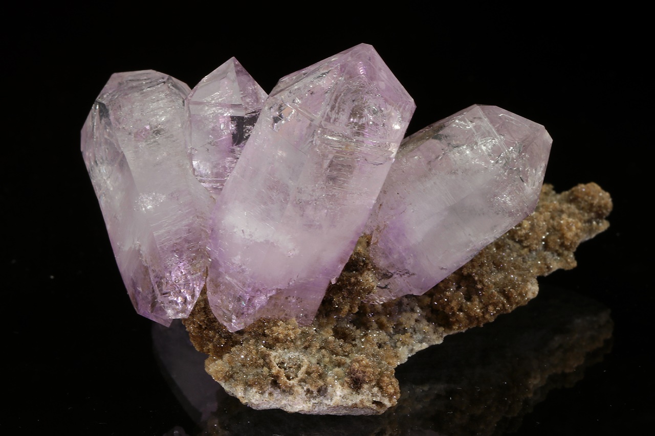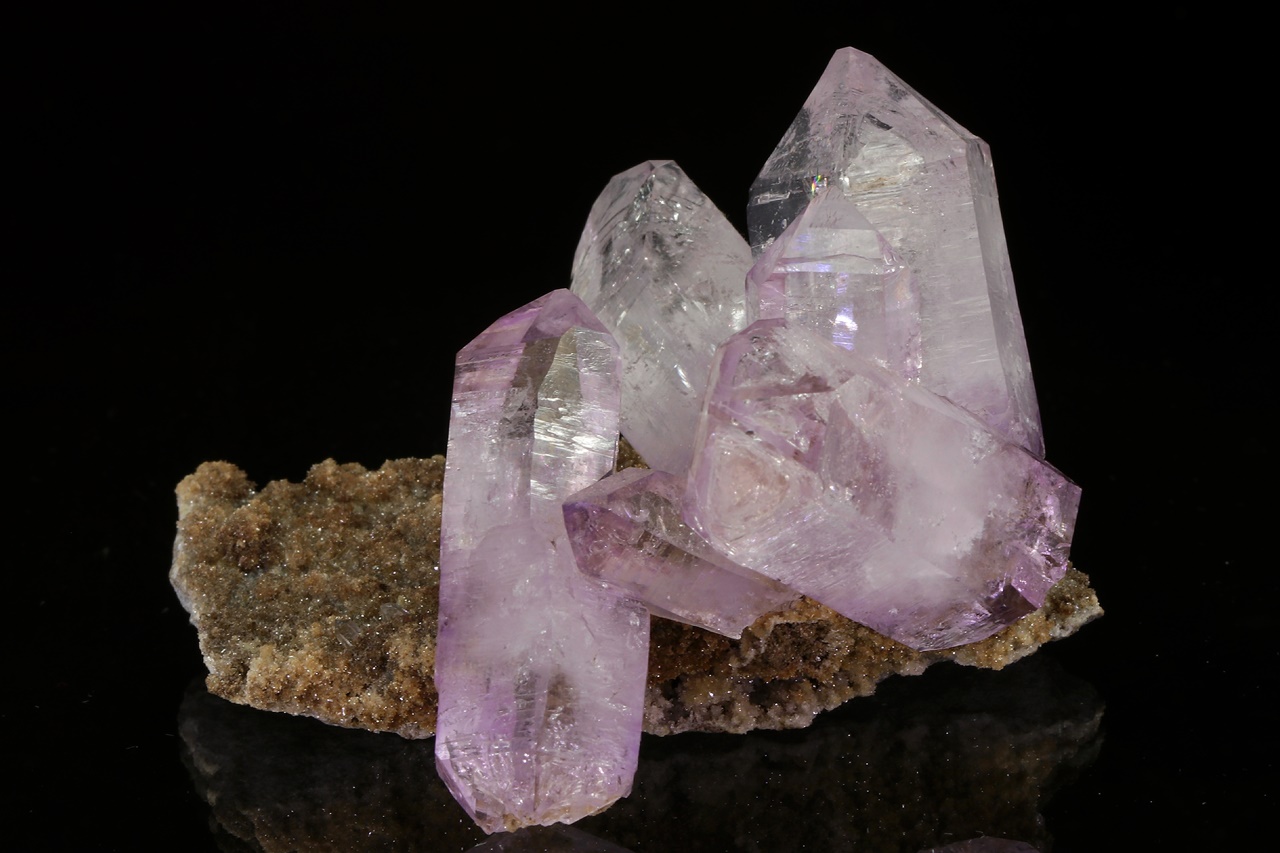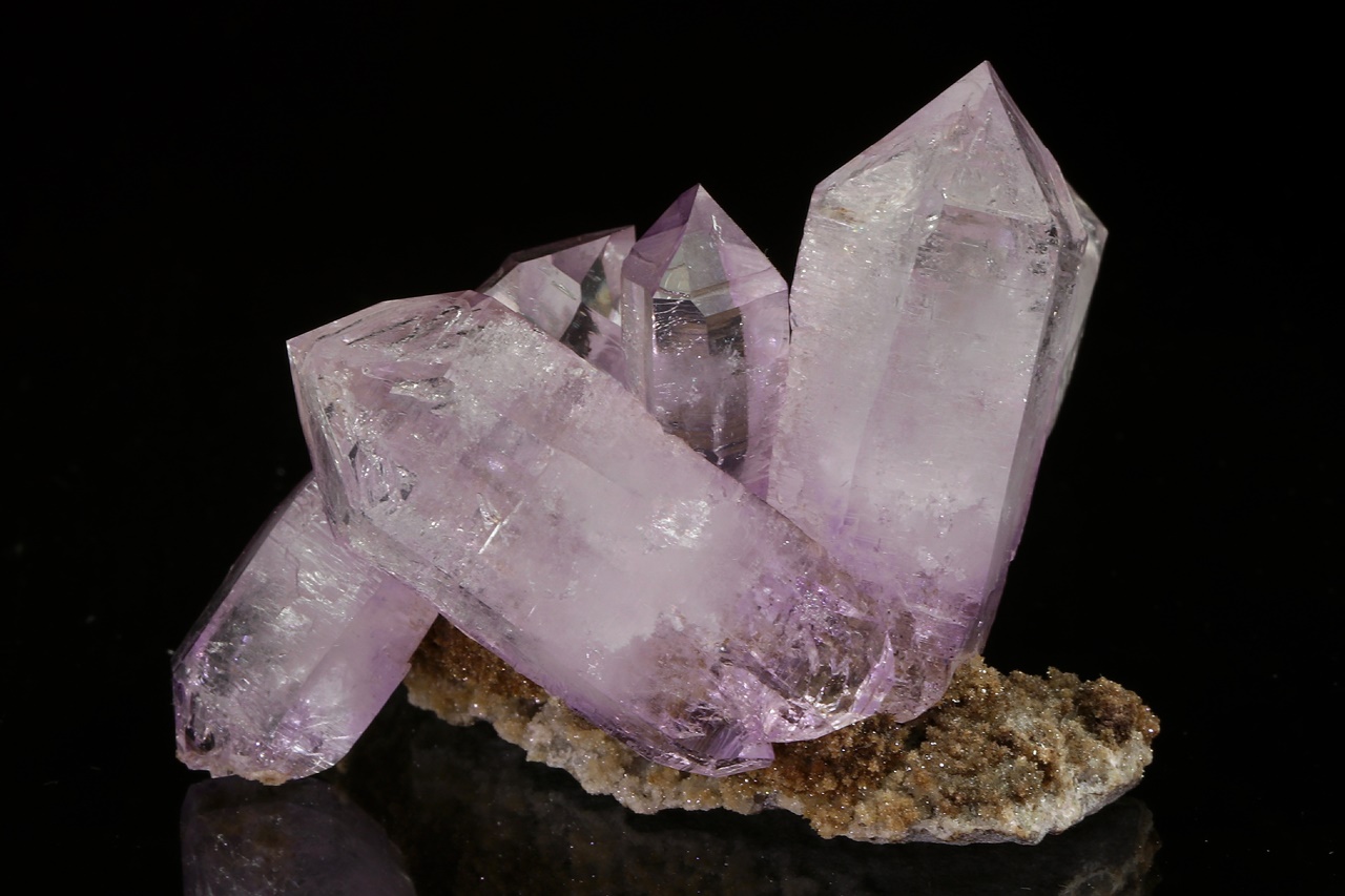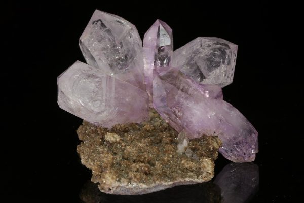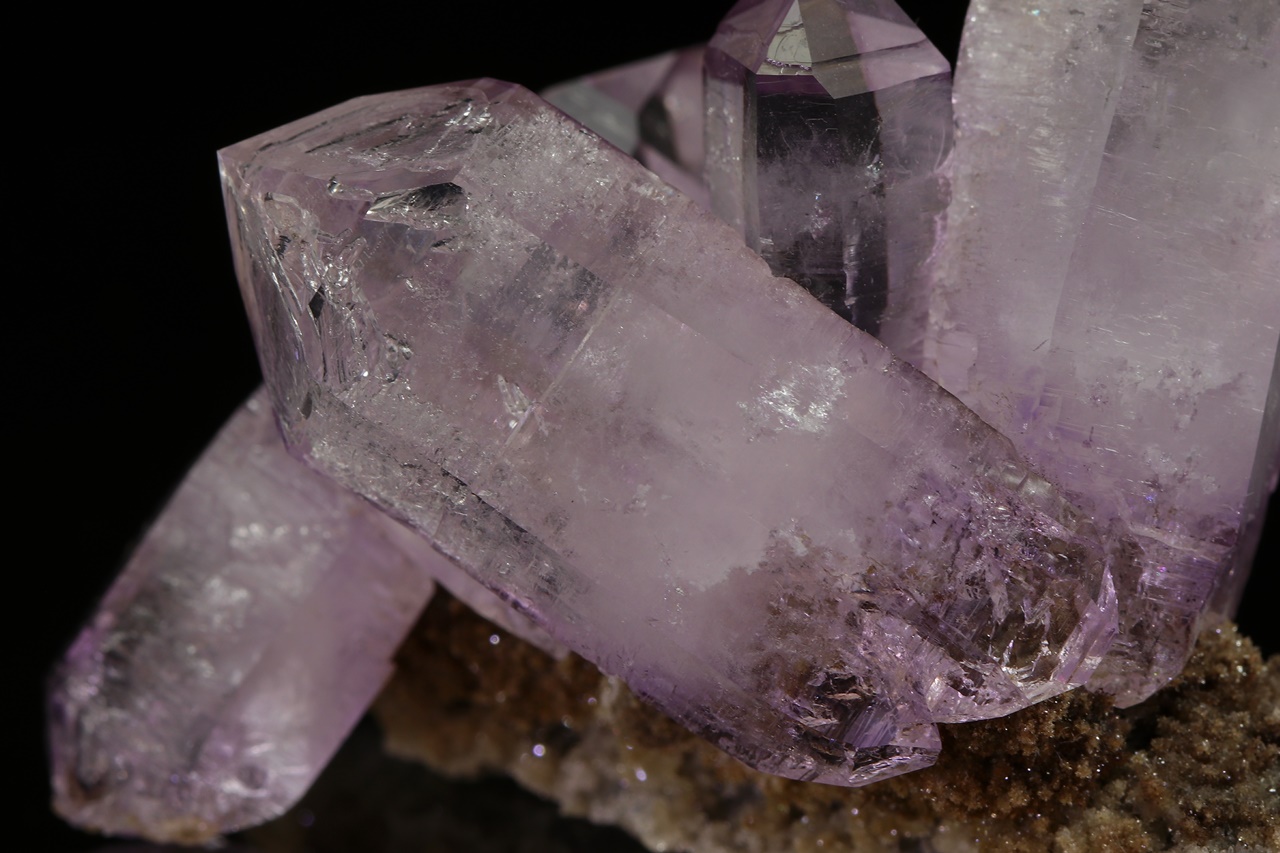 Purple amethyst crystals have grown on the base. One of the amethysts contains a Goethite inclusion. The largest crystal is 4.5 cm in size.