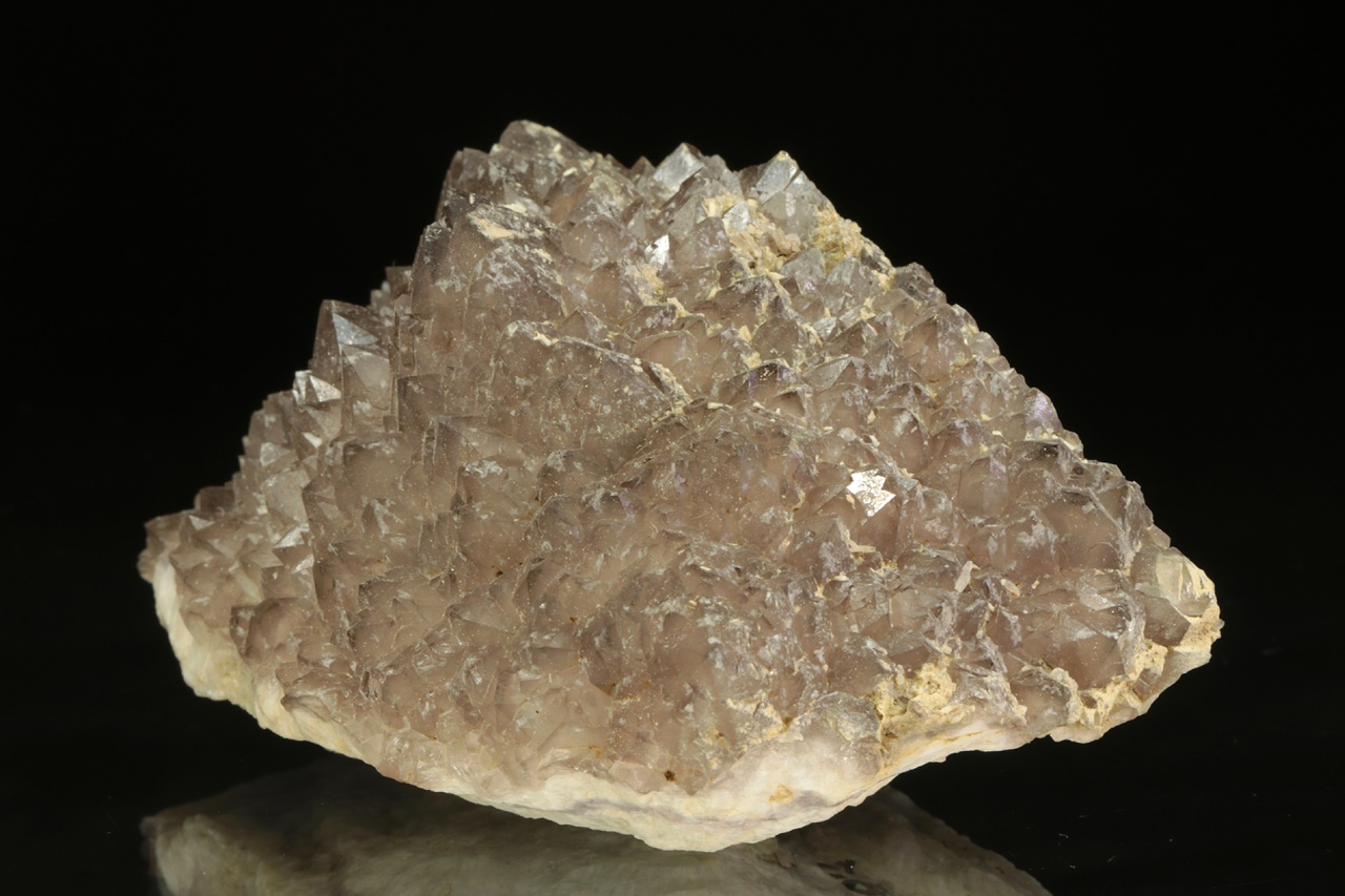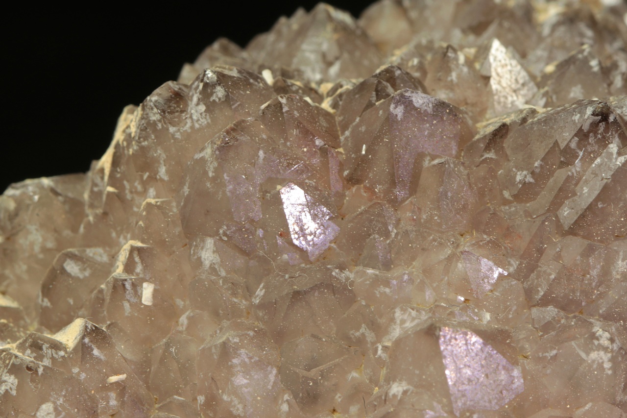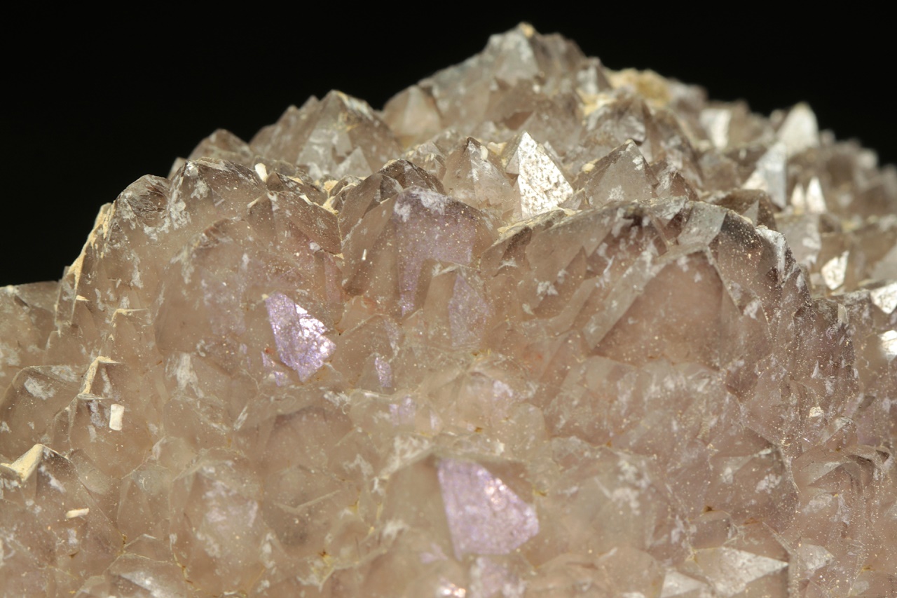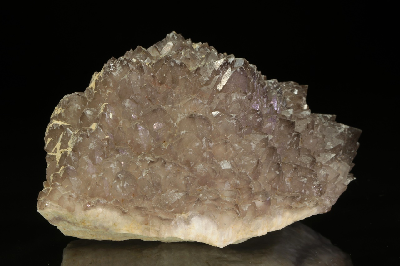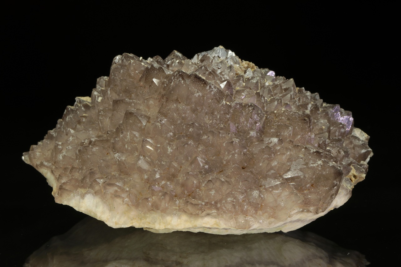 A radiating aggregate of quartz crystals growing from the center and terminating in tips of dark amethyst.